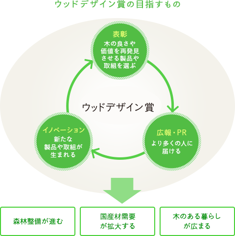 ウッドデザイン賞を通じて、多様な知見やアイデア、ネットワークを持つ皆さんが集い、新たな時代の価値づくりに参画していただくことが本賞の最大の目的です。「ウッドデザイン」の普及・定着を通じて、持続可能な社会を共に実現していきたいと考えています。