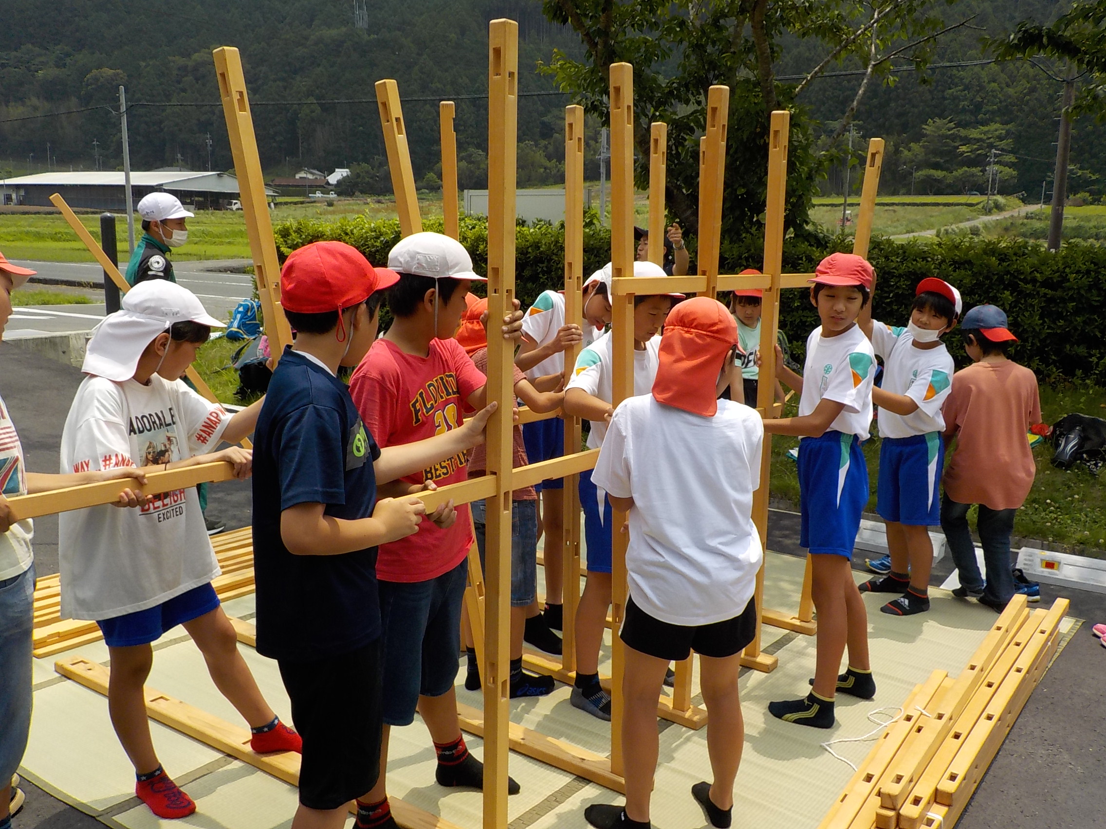 自分たちが遊ぶジャングルジムを自分たちで組み立てる、プロセス体験型の出張木育プログラムである。木組みの特性を体感しつつ、共同作業の達成感ももたらす。災害時には簡易間仕切りとして活用することもできるツールとなり、防災教育にもつながっている。