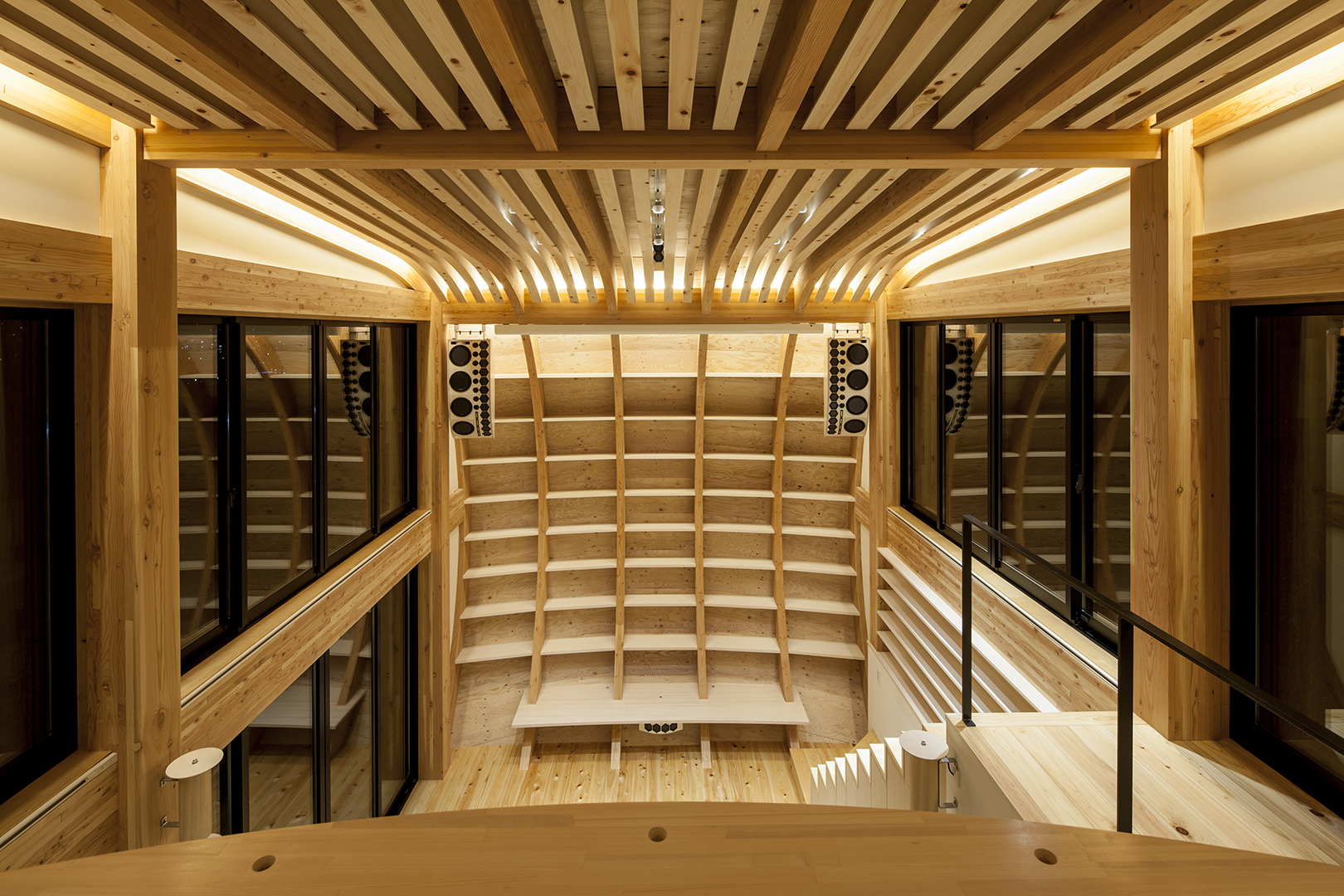 音楽に囲まれて森の中で暮らしたいという施主の要望に応えるため、音響と素材、空間を計算しつくしたオリジナリティ溢れる建築である。望んだ音を生み出すために材の選定、調達までこだわり、それ自体が森を守る活動とリンクしている点も物語性がある。