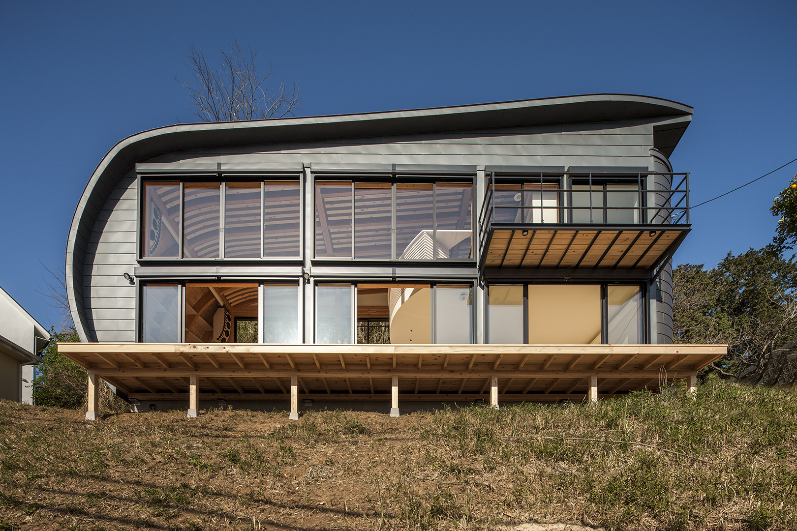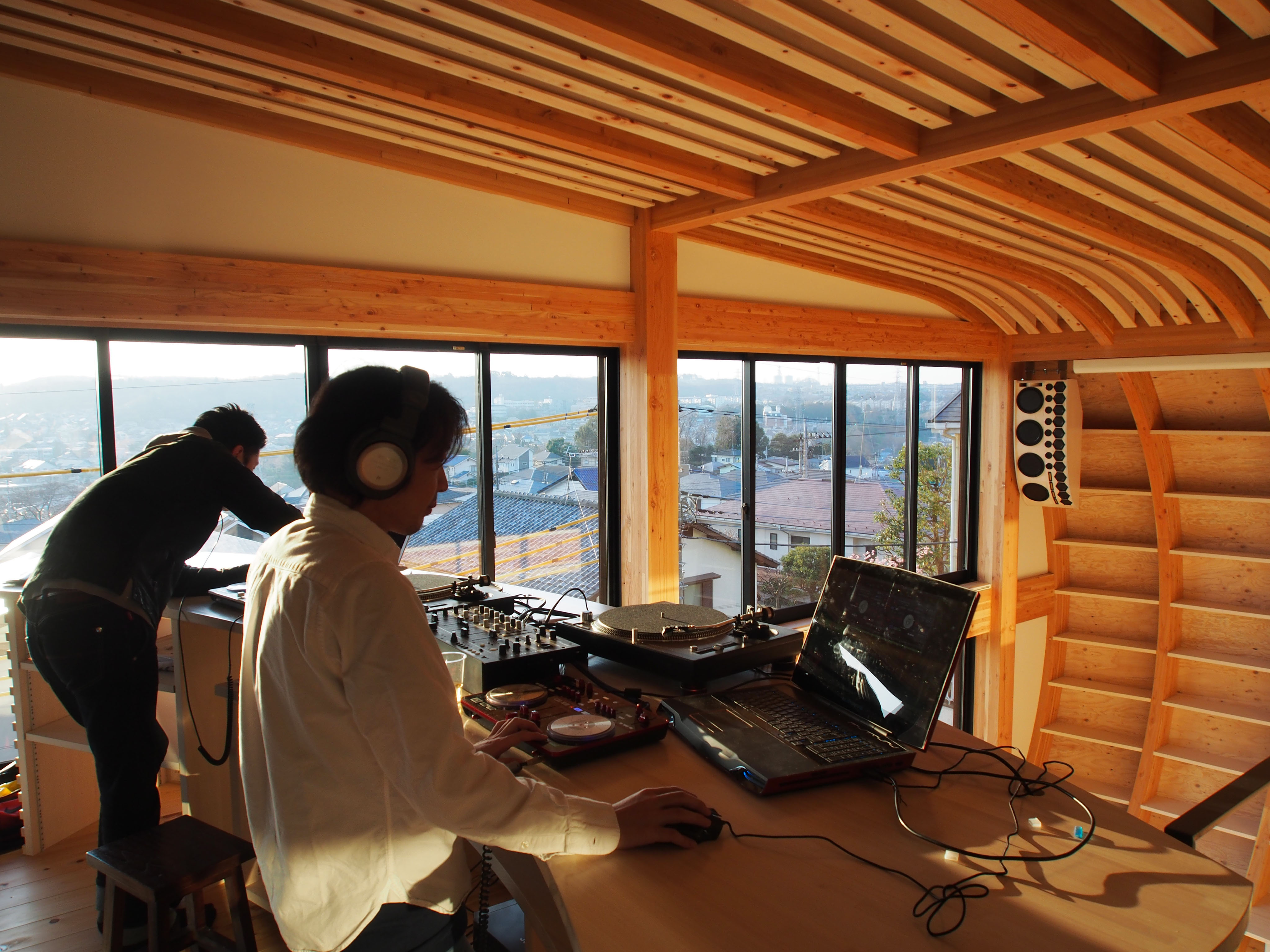 音楽と自然をこよなく愛するKの為に、森と最高の音に濡れる音場で歓喜する「音楽建築」が生まれた。高台の眺望と森を取り込みまるでスピーカーの中に住まう感覚が新しいイマジネーションを生み出す。「音楽建築」は音楽を中心テーマに住み手の趣向に誂えた至高の音場空間である。※「音楽建築」は登録商標