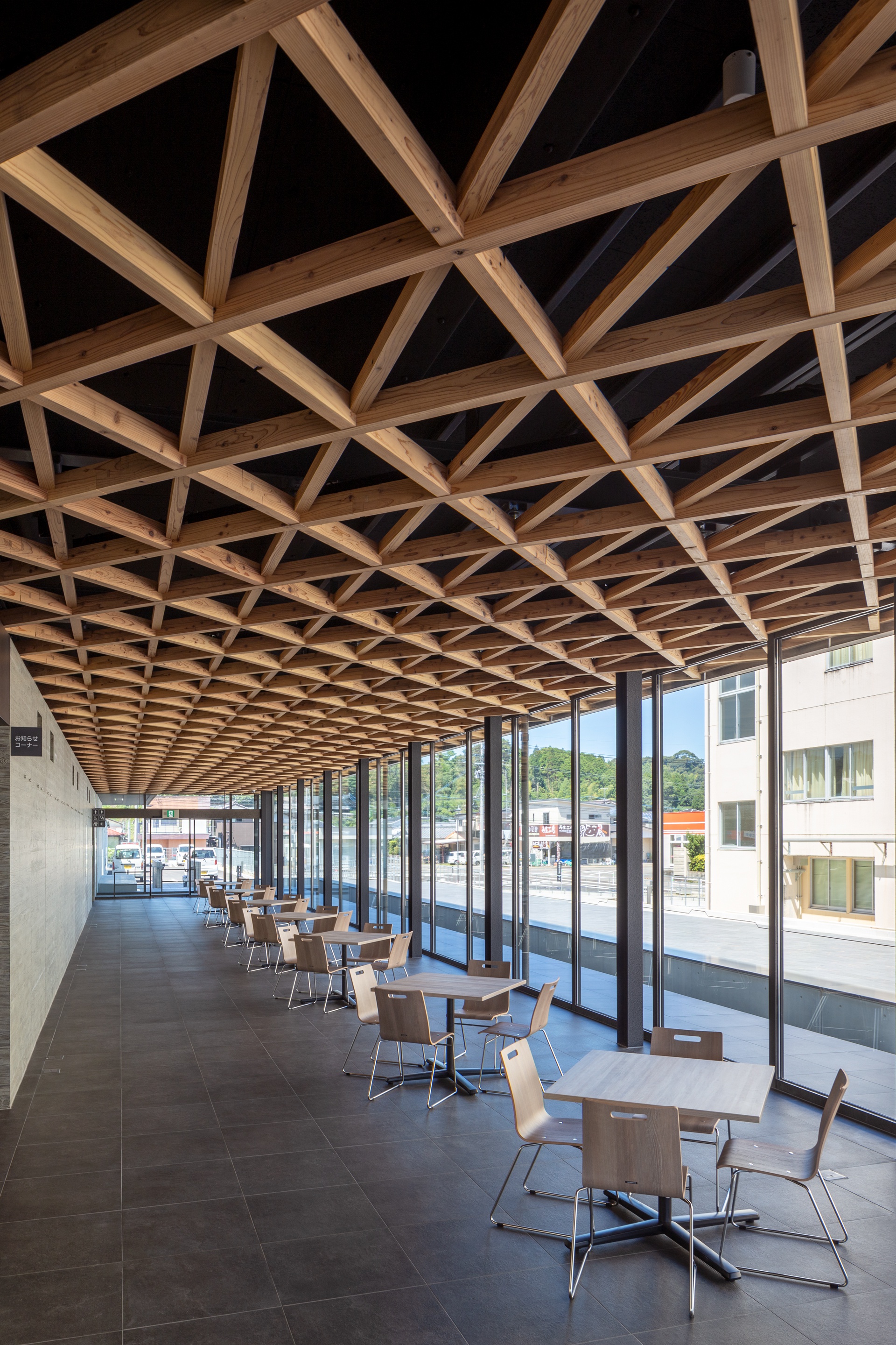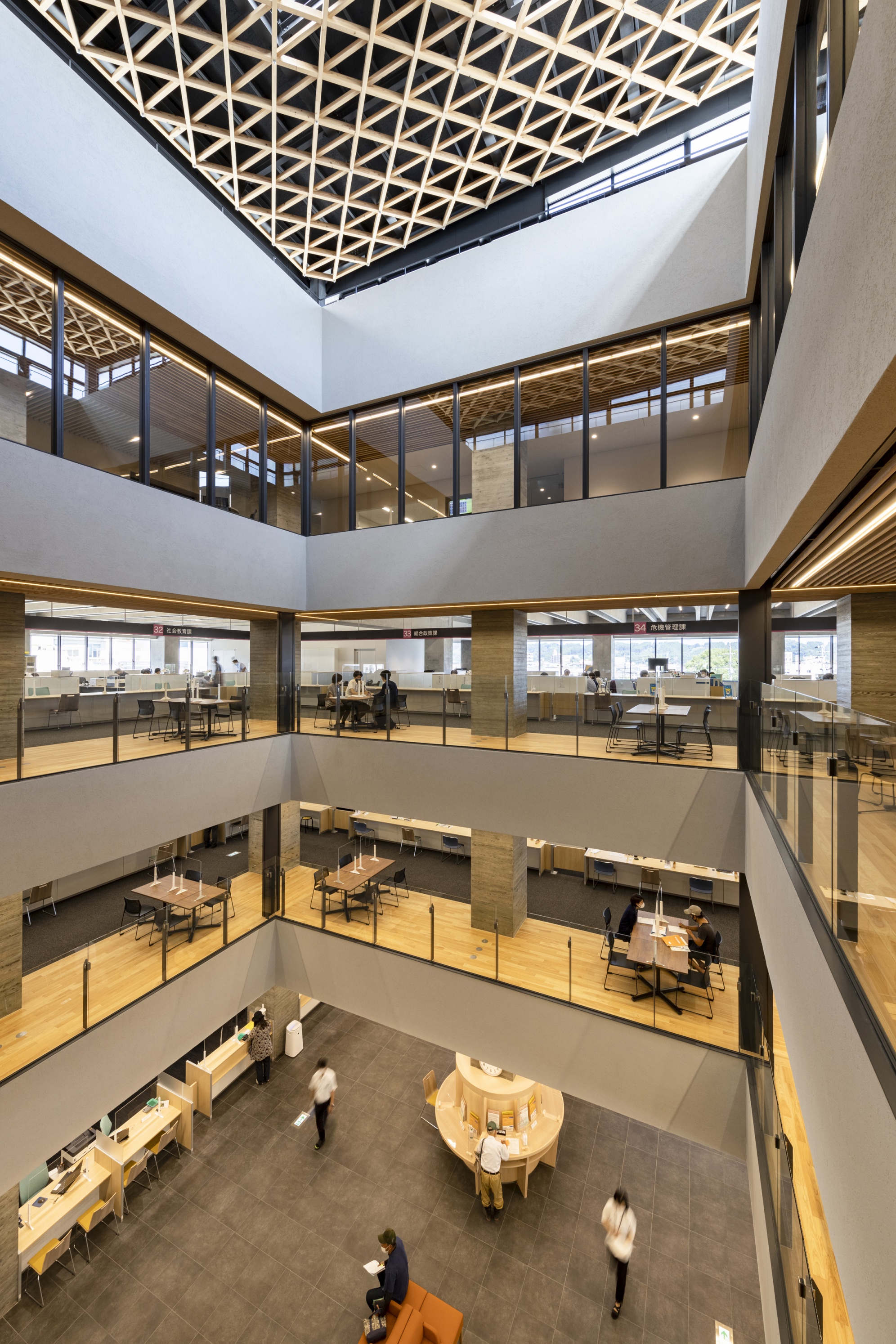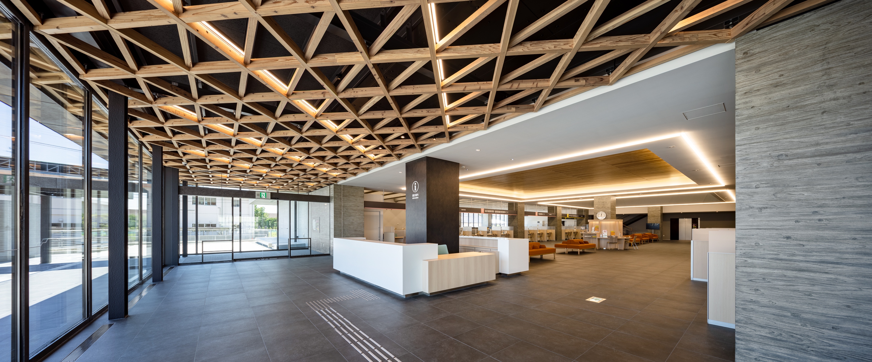 宮崎県西都市の新庁舎新築において、市産杉材の多様な建築展開をテーマとしたプロジェクト。庁舎の骨格となるエントランスから4層吹抜けの屋根架構の木格子ブレースや内装仕上げ材として市産杉材を積極的に活用し、居心地のよい市民・職員の協働・交流の場づくり、そして市産材の魅力を発信する建築を目指した。