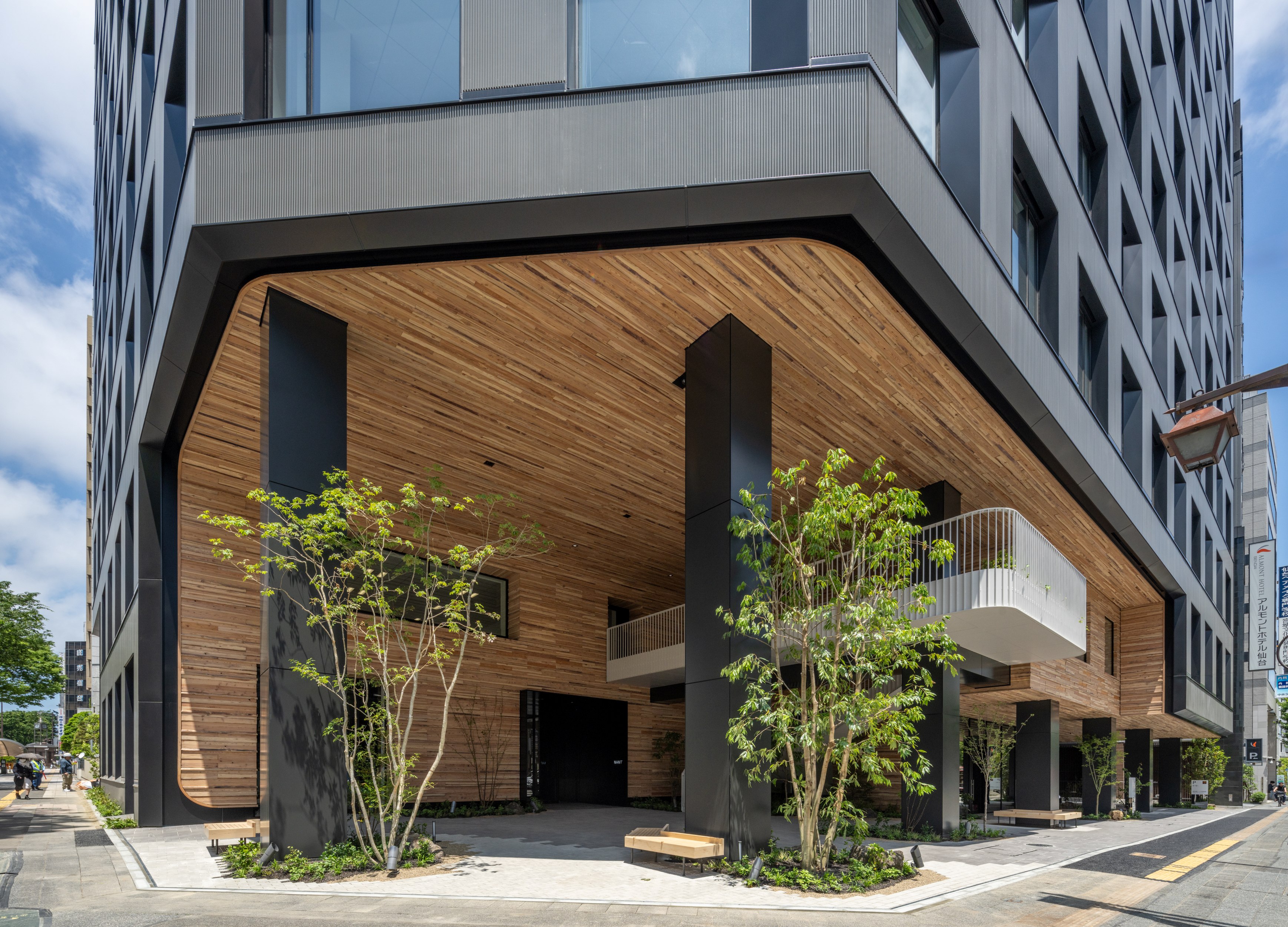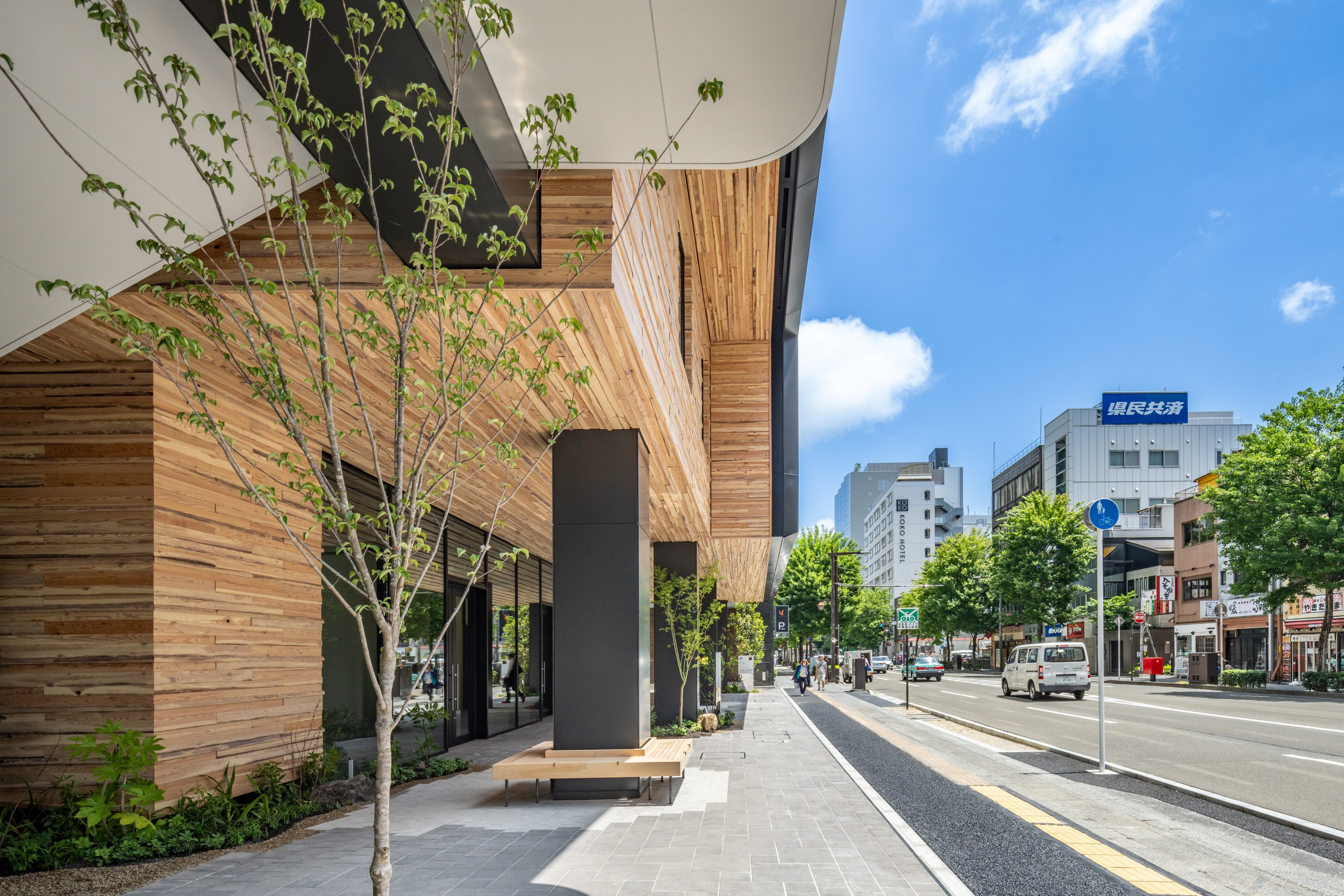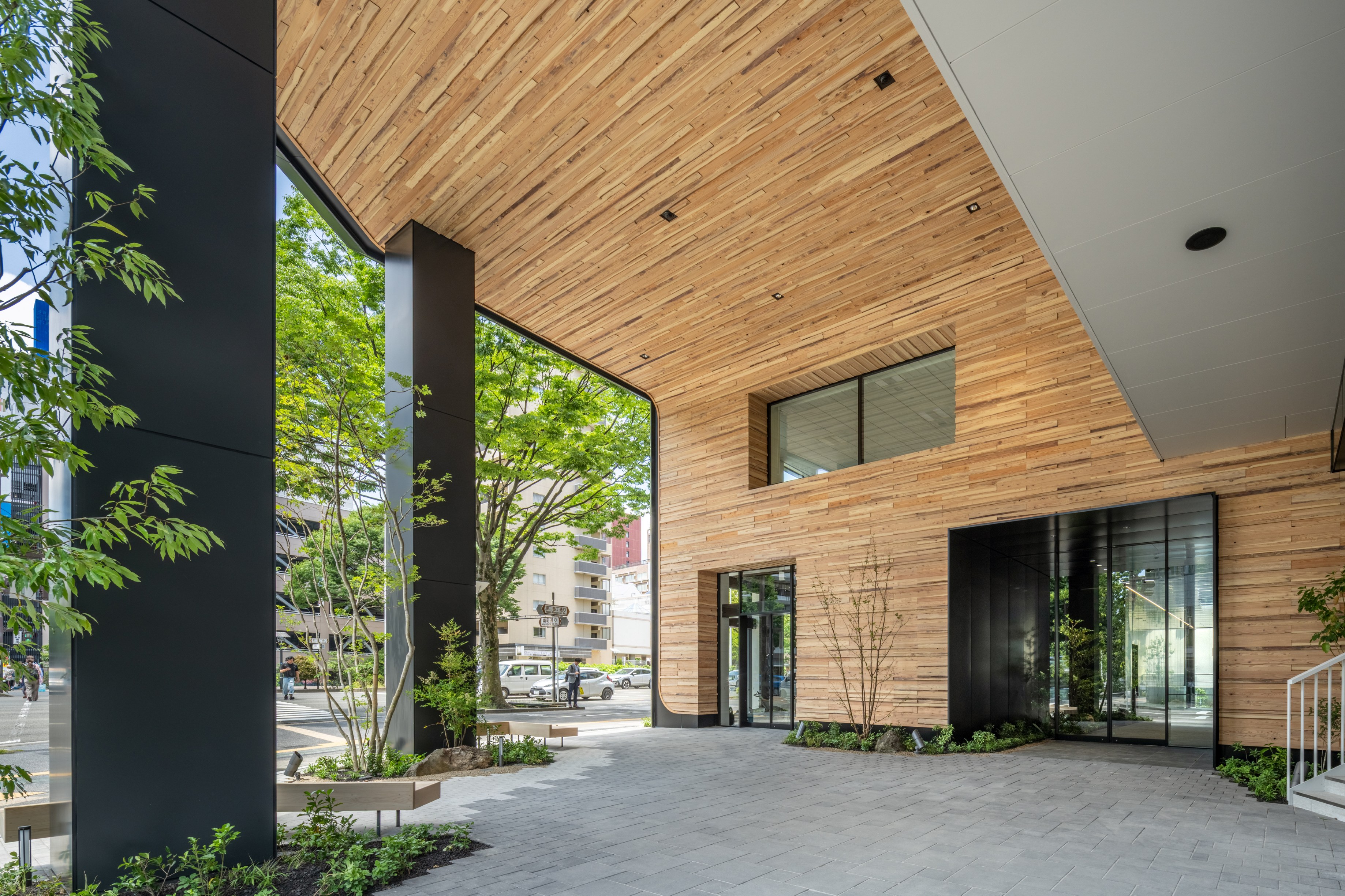 仙台駅至近のテナントオフィスビル。壁・天井を全面天然木で仕上げた洞穴のような公開空地を整備、市街地における新たなパブリックスペースの形を提案している。仕上材にはラミナ製材時に発生する「端材」を全面利用。原木歩留を大幅に向上すると共に、端材ならではの風合いを活かした唯一無二のデザインを実現した。