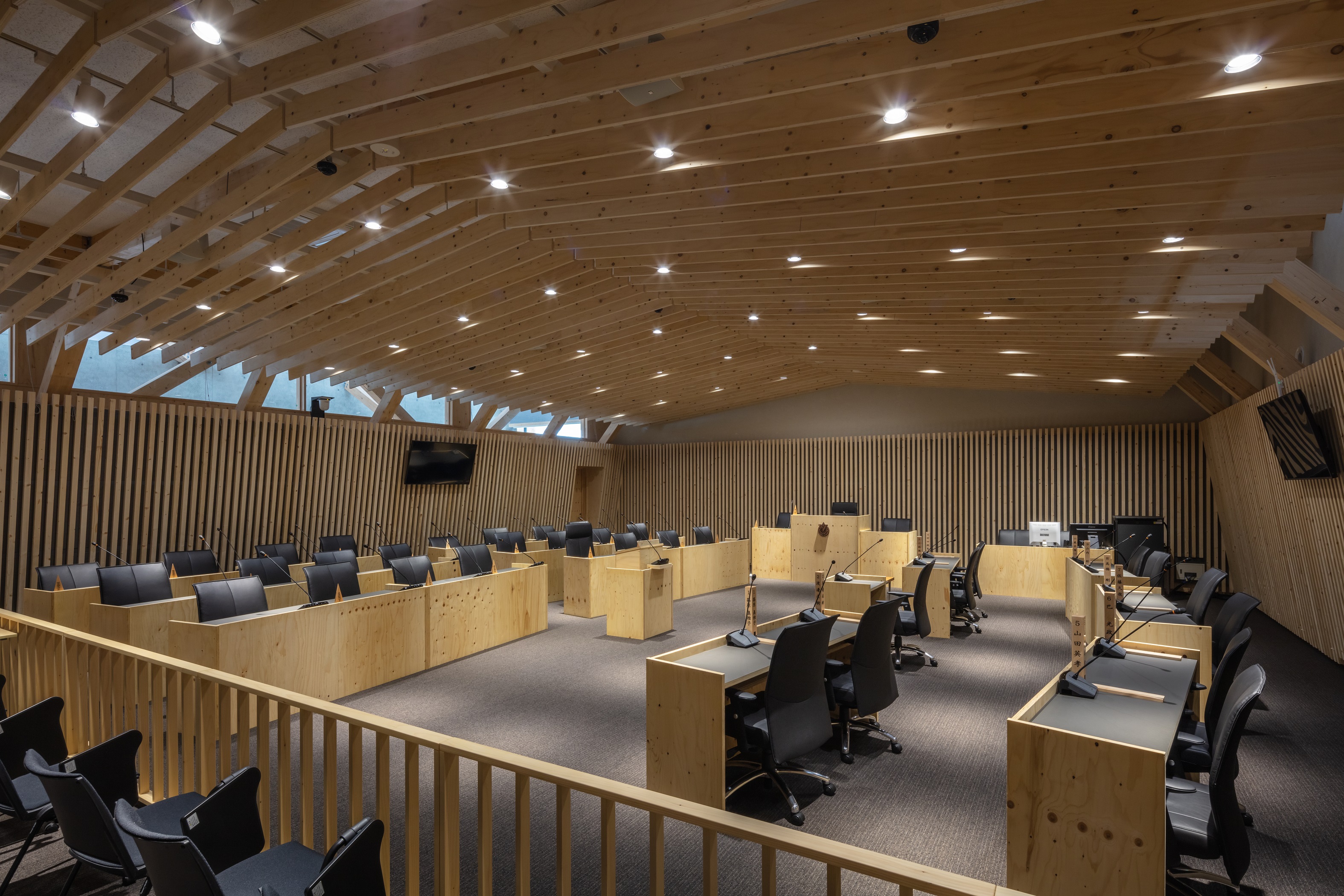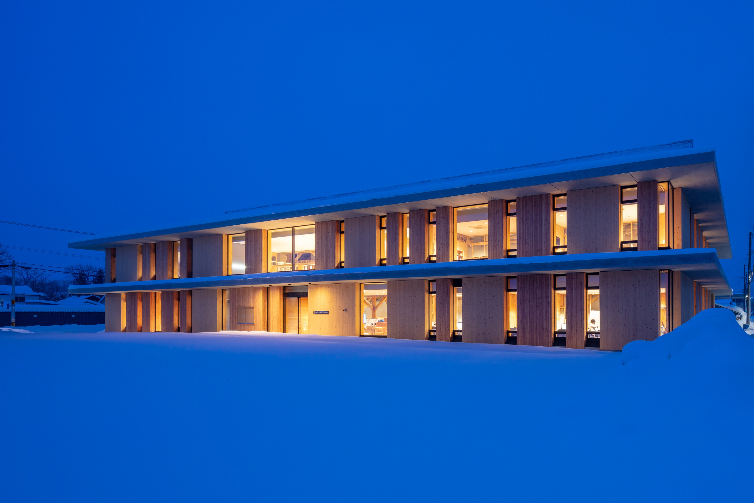 北海道東部に位置する津別町の役場庁舎と健康福祉センターの複合庁舎。木とRC造のハイブリット構造で木造部分は柱から四方に方丈を張り出し、さながら並木を思わせる空間を構成している。木材の88%は町内で生産されたもので「愛林のまち・津別」を象徴する建物として、町民をはじめ多くの方々から親しまれている。