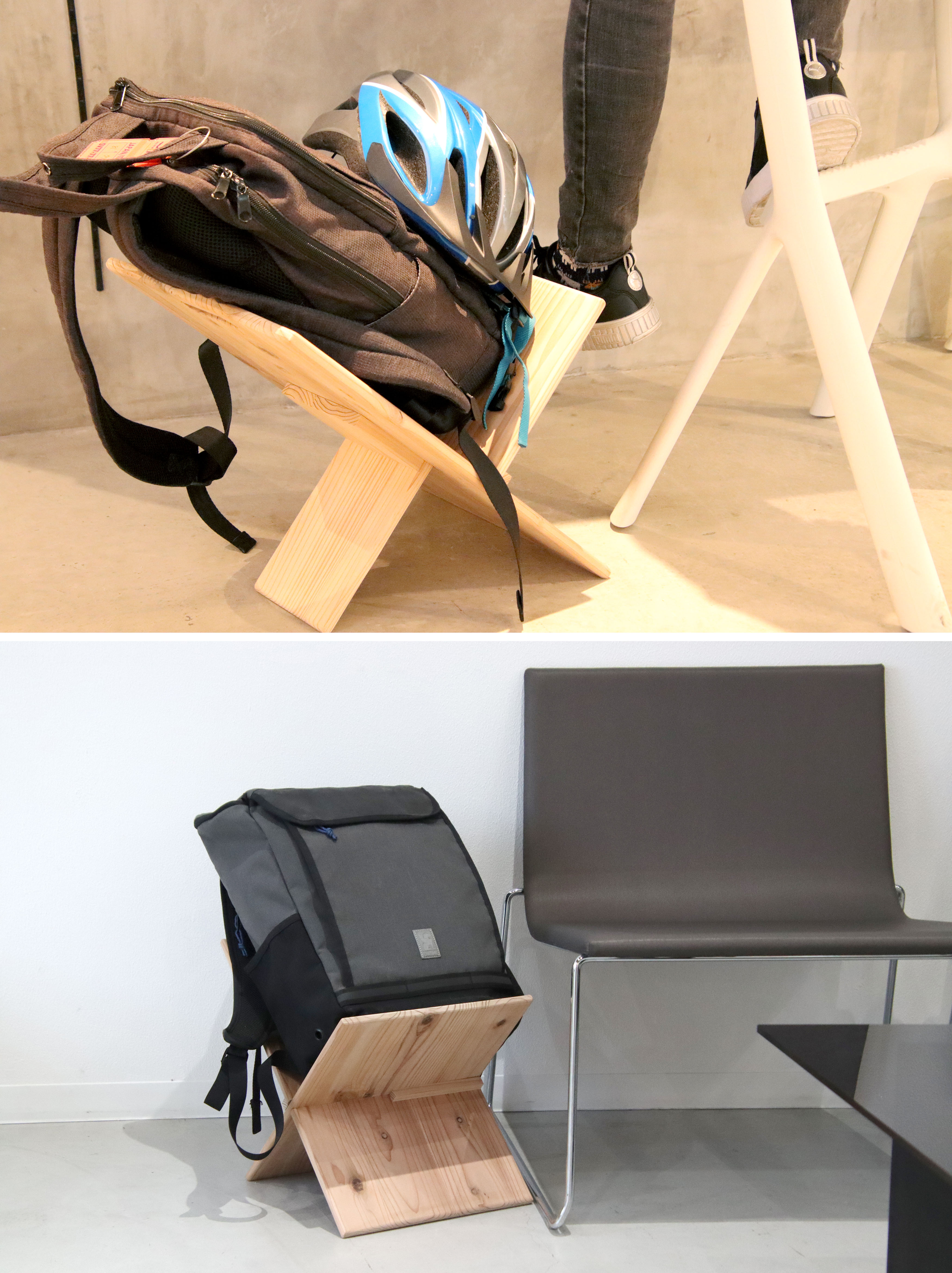 公共事業で生じた残余材をバッグスタンドに再生し、多くの人の目に触れる空間で地域材の存在を可視化させている。使い手に温かみと配慮を感じさせ、施設のイメージ向上にも寄与する。