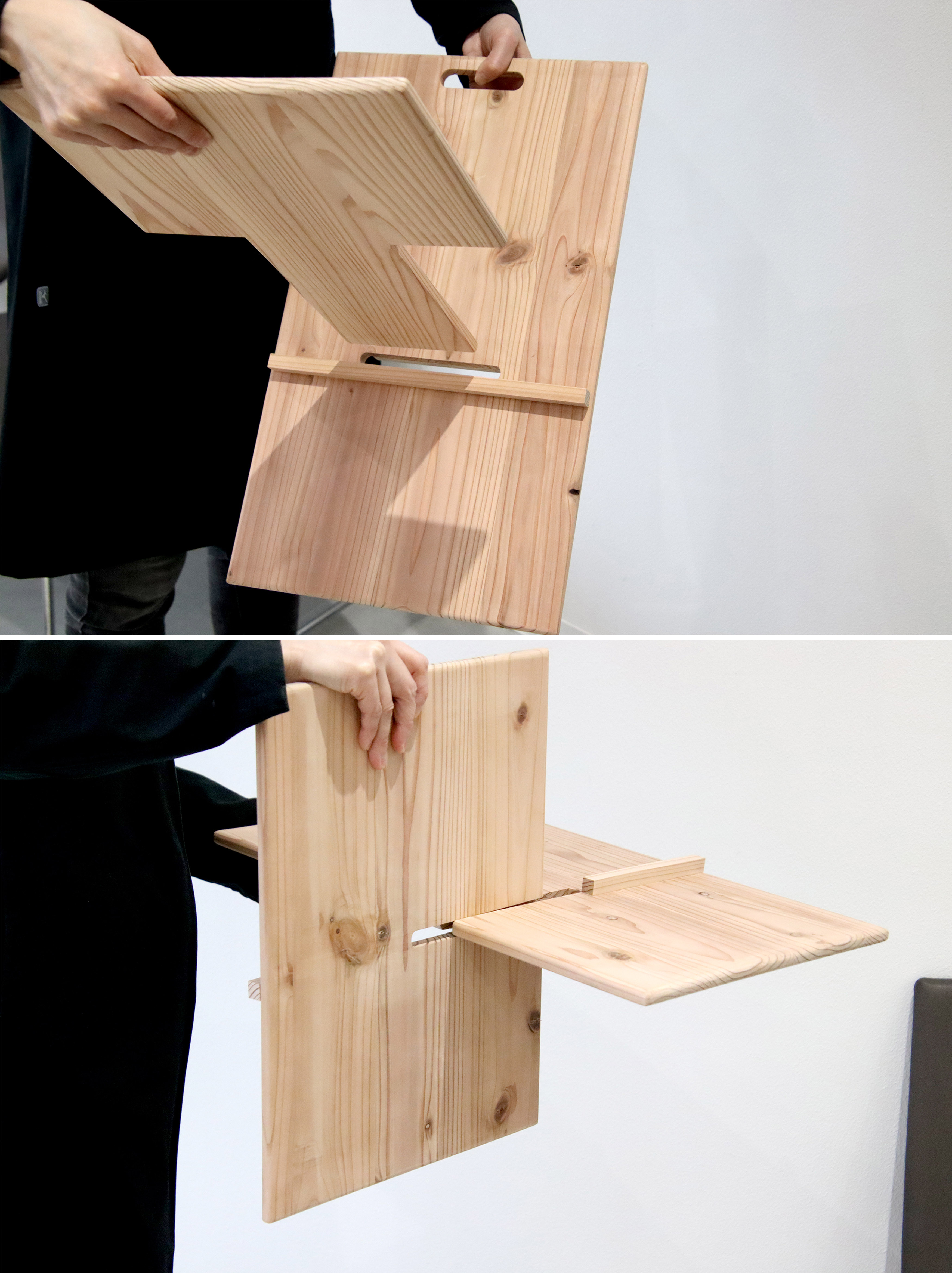 福岡市の公共事業等で使用される市内産材(主に杉)の製材過程で発生した残余材を利用し、ものづくりを新たに行うプロジェクト。公共施設やイベント会場、店舗の什器、ホテルなどで活用でき、使用場面が多く、消費者・利用者の目につきやすい、いわゆるおもてなしの一部として活用できるバッグスタンドを作成した。