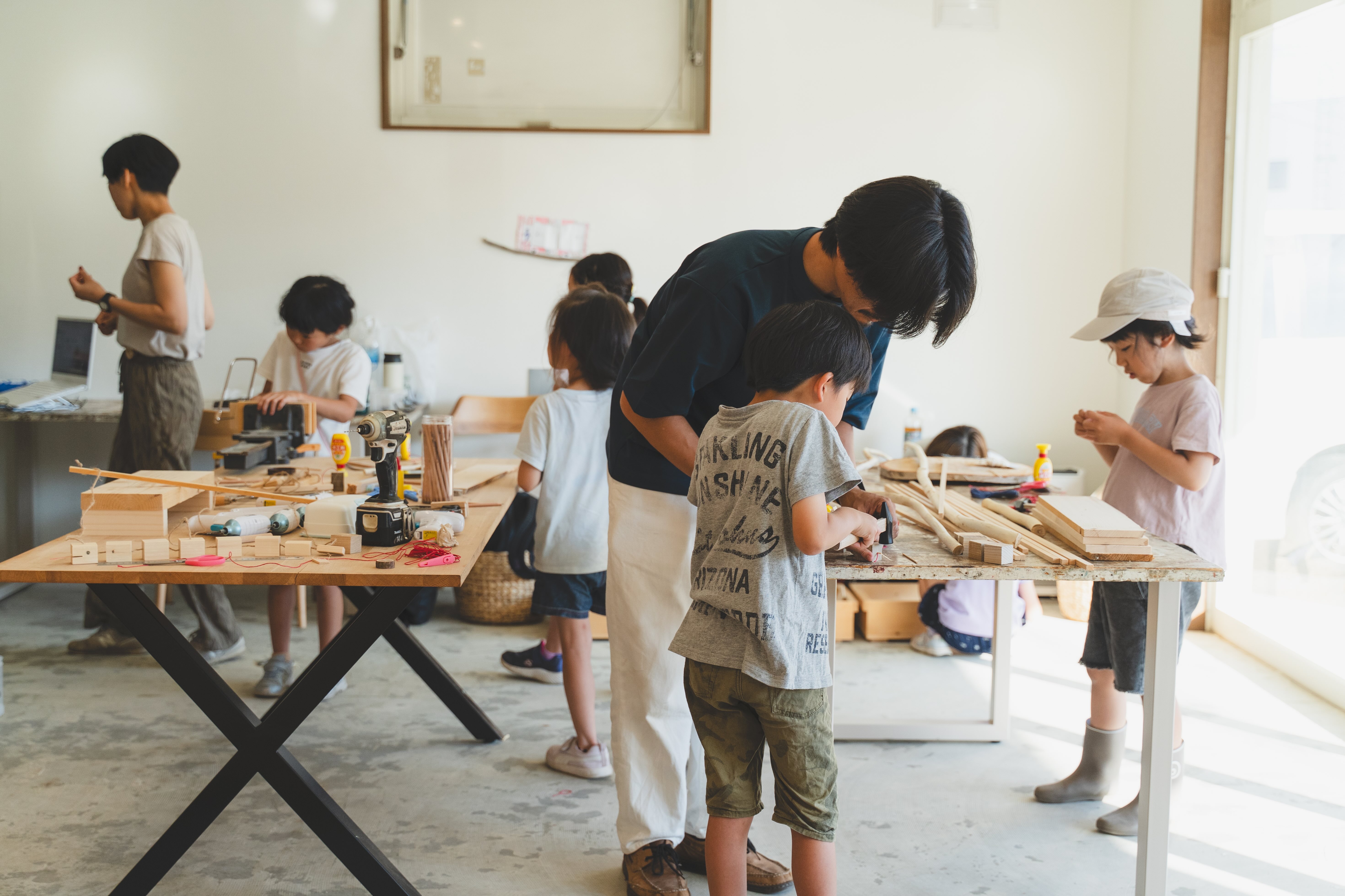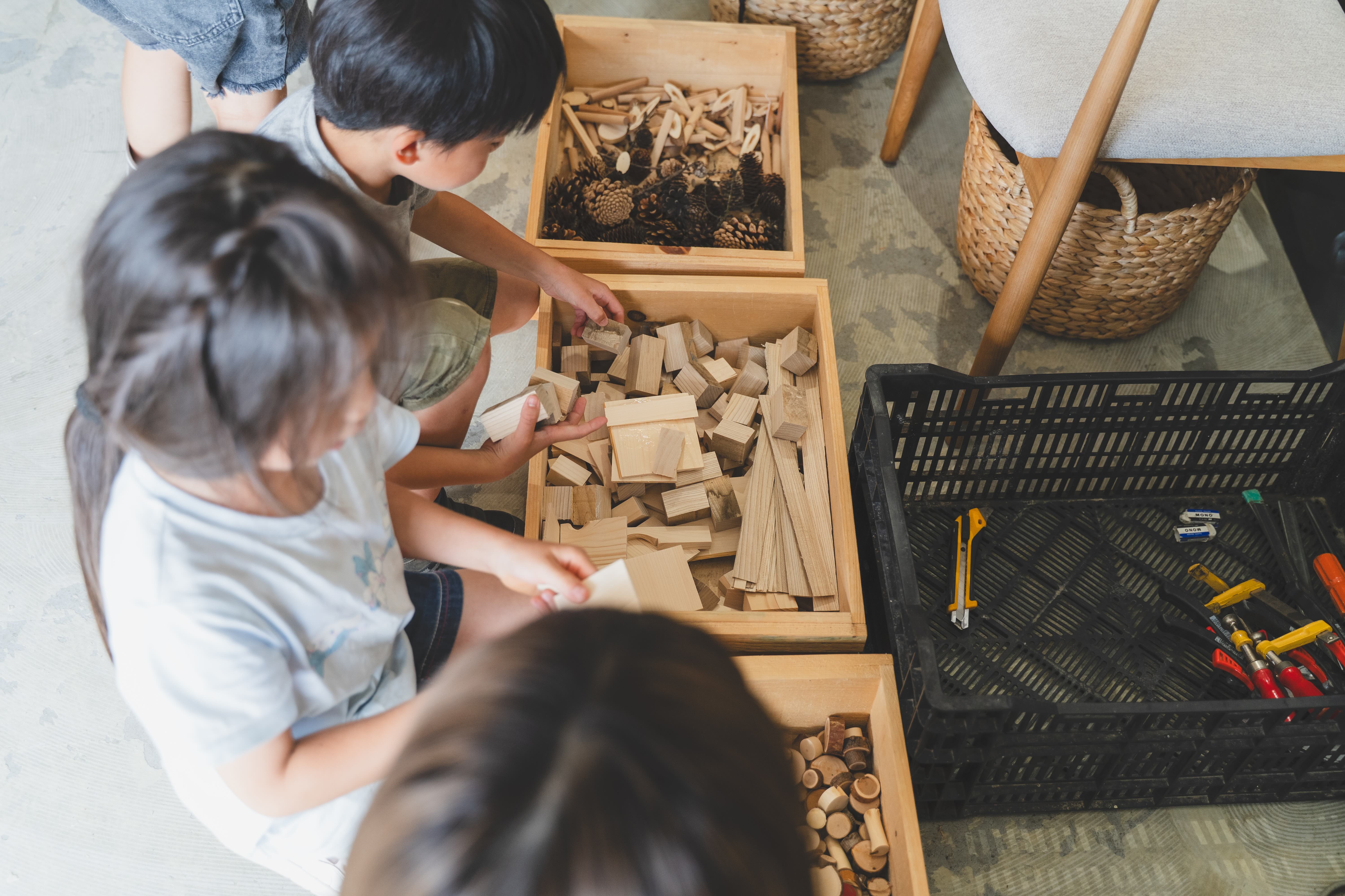 子どもたちが「森を感じ」「素材に触れ」「造り学ぶ」新たな地域教育プログラム。子どもたちが森の中を歩き、木々の香りを感じ、自ら素材を集め、自然素材を使用した創作活動(絵や立体、工作など)を行い、地域の大人たちと関わり、実体験を通じて資源と私たちの暮らしの繋がり、循環を学ぶ。