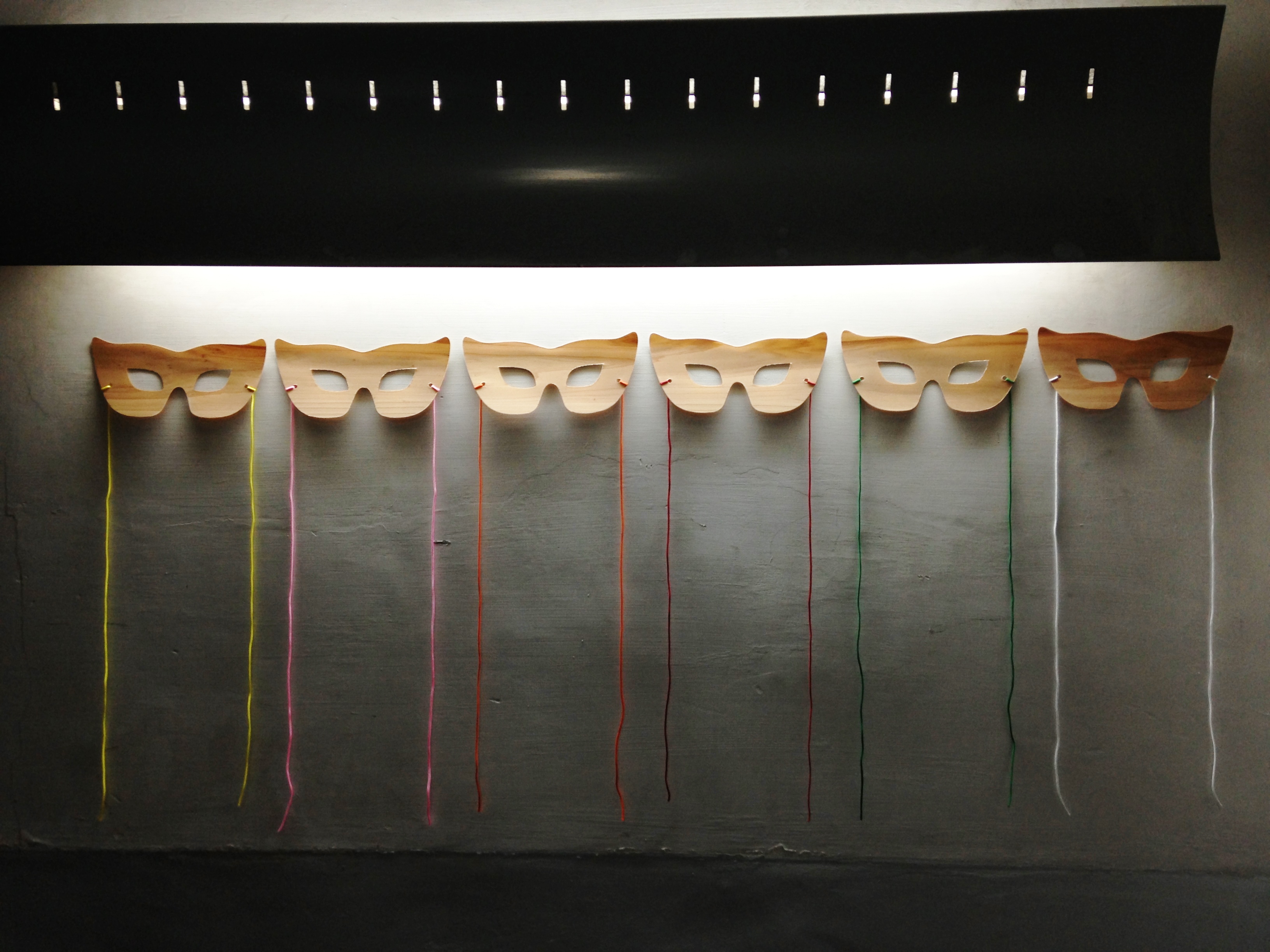 「飫肥杉仮面」とは、飫肥杉製の薄いシートをカットして製作した仮面(マスク)。広く飫肥杉に興味・関心を持ってもらうために考え付いた。飫肥杉製の仮面を顔に着けていると、ほぼ必ず「え?それ、なに?(笑)」と話しかけられる。この「(笑)」が大切だ。さらには「日南の飫肥杉で作りました。飫肥杉は・・・」という、コミュニケーションやプレゼンテーションの機会を与えられる。そんな思いで仮面を装着し、飫肥杉仮面と名乗り、活動している。