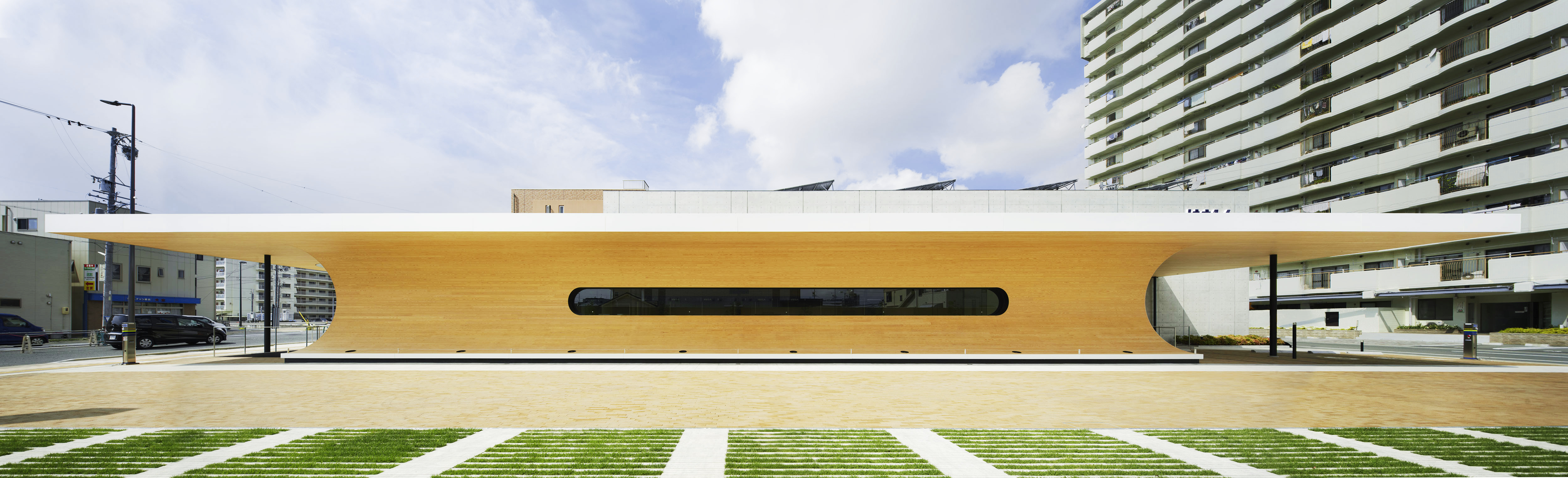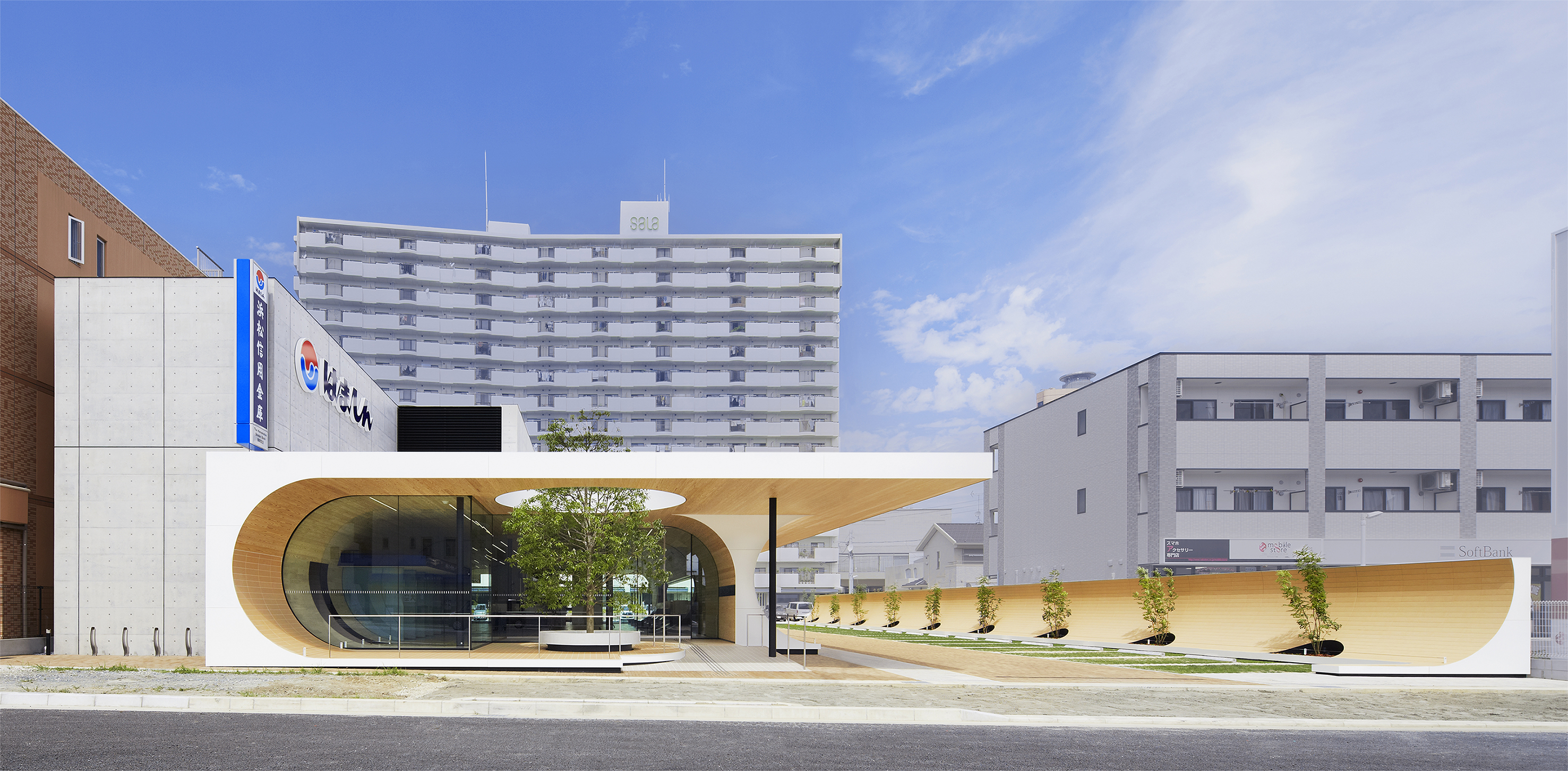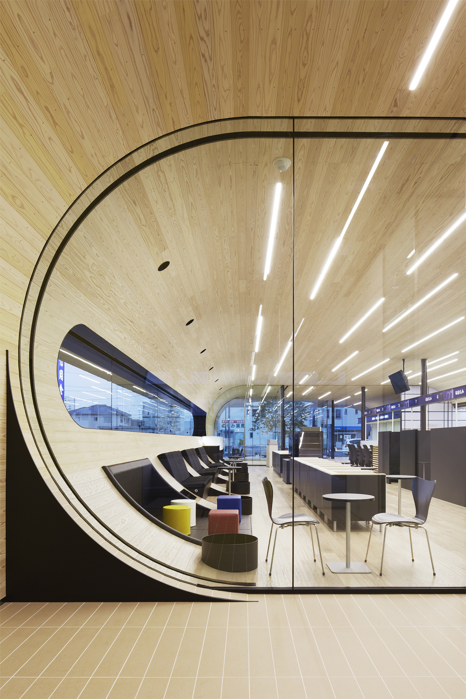 インパクトある弧を描くような外観に、天竜杉の意匠性が柔らかさを加えている。金融機関という地域に根差した業態を象徴するかのような、木に囲まれた和やかな空間を演出することに成功している。
