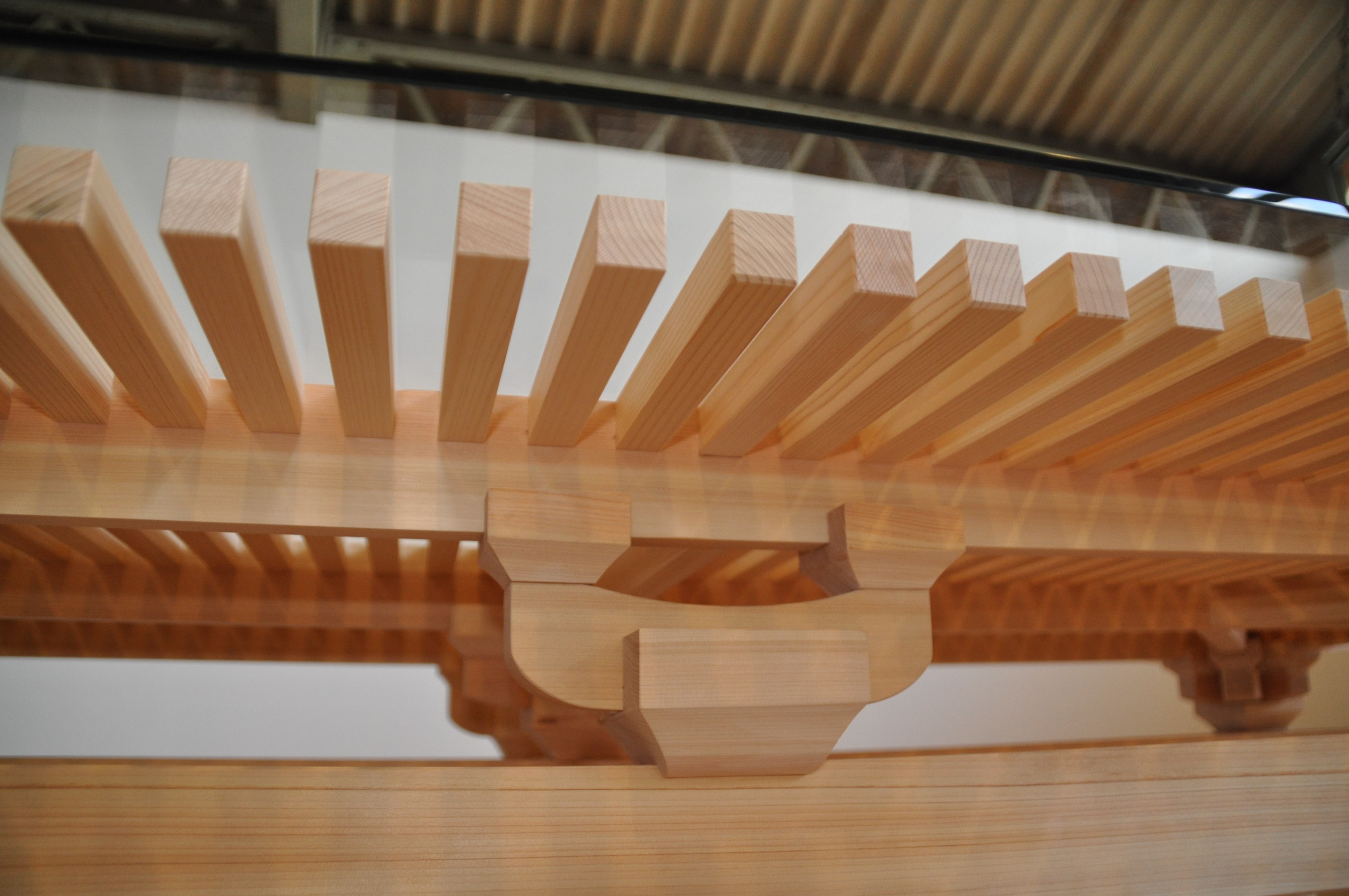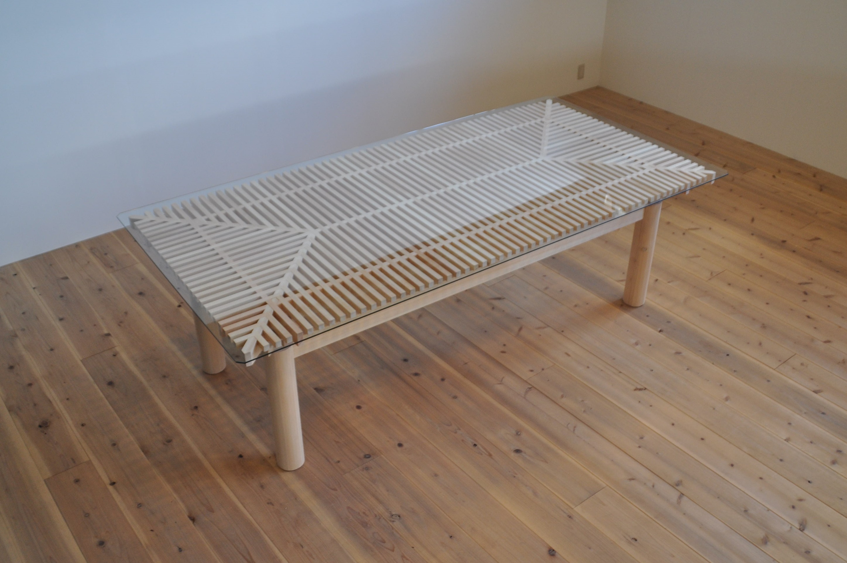 伝統建築物において柱の最上部や軸部の上に設置され、軒桁を支える斗組の構造を使った重厚感あるテーブルである。ガラスの天板から見える構造美は寺社建築を見ているかのような感覚を覚える。ヒノキの白木の美しさを味わいつつ、経年変化を楽しめるように無塗装にしている点も日本の建具や建築文化に通じる特徴である。