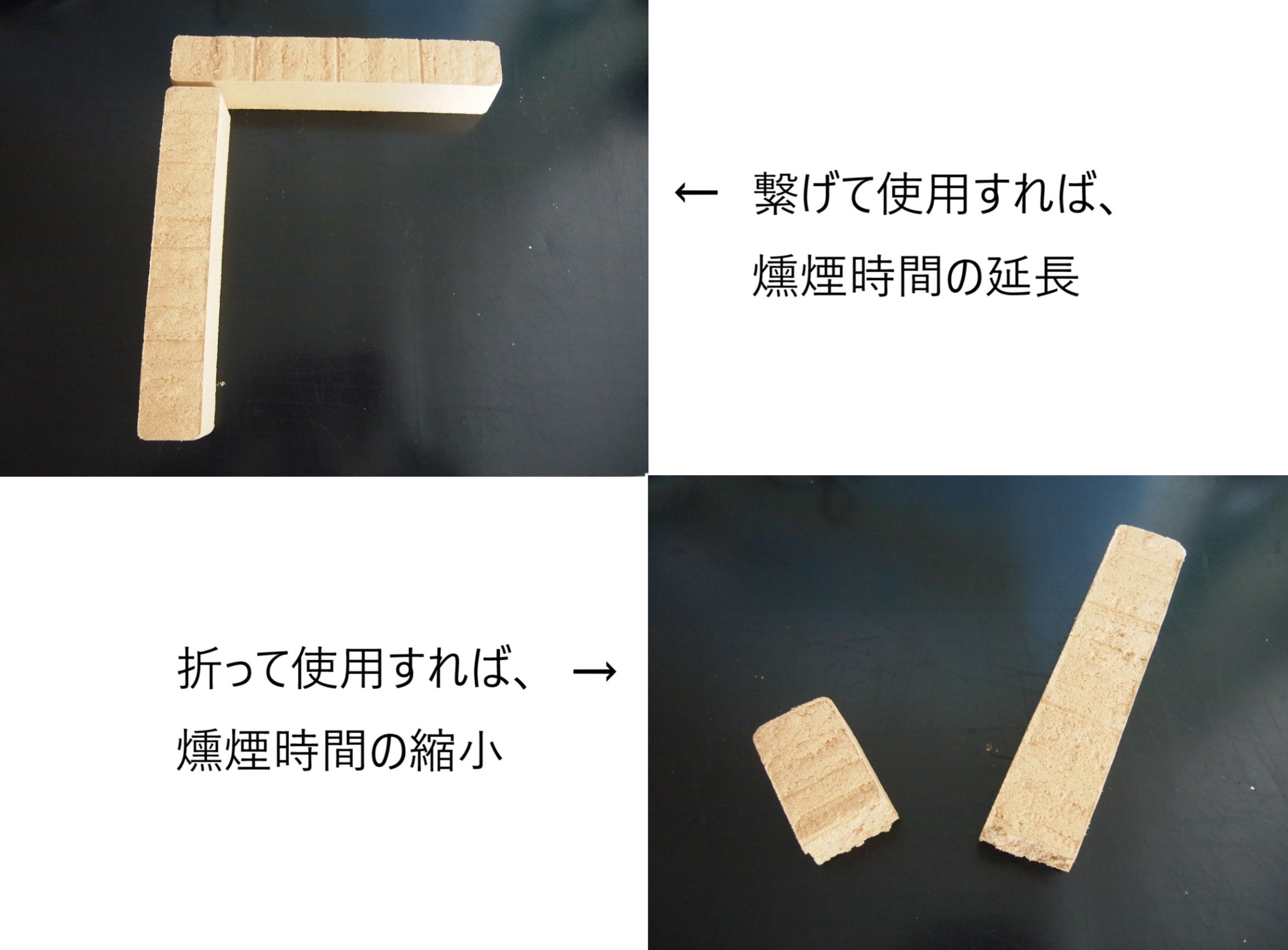 純粋な木質部だけを超微粉化して棒状に固めたもの。一度点火して煙が出始めれば一定量の煙を出し続け、通常サイズで1本あたり約4時間もつ。燻製時間と煙の量を調節できる。熱源(コンロ等)が不要。6樹種あるので、それぞれの木のもつ特有の香りを楽しめる。