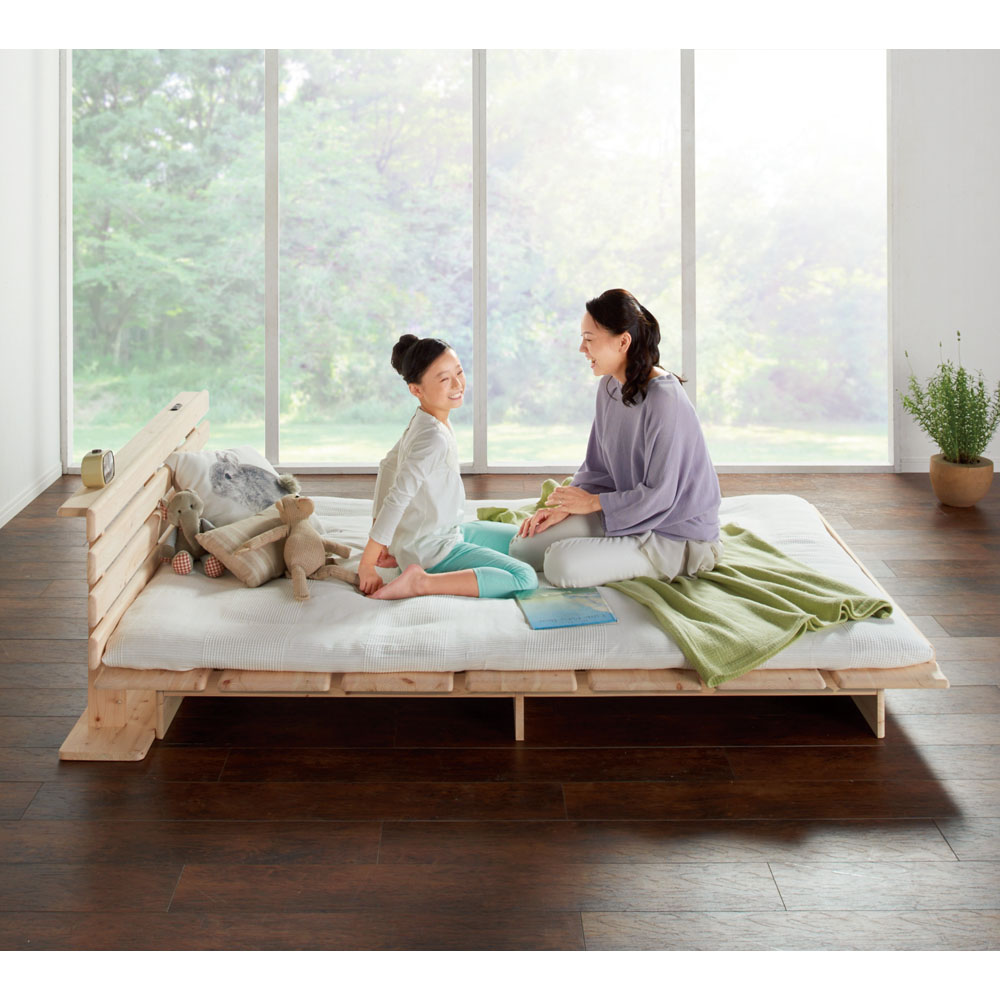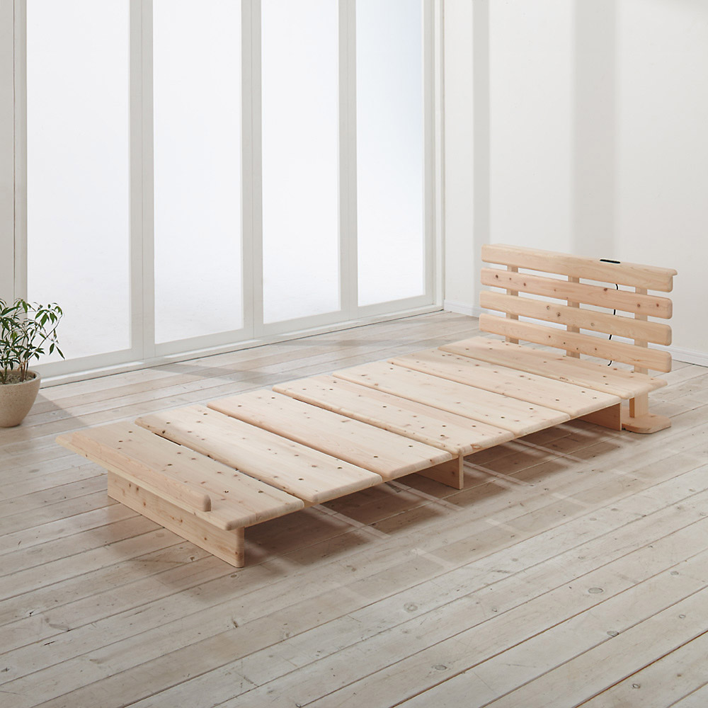 通気性を確保するすのこ、ヒノキの香りの安眠効果で生活の質を高めてくれるベッド。板厚の丈夫さが特徴で、高さも調整できる。長く使える家具でありたいという思いが伝わってくる。