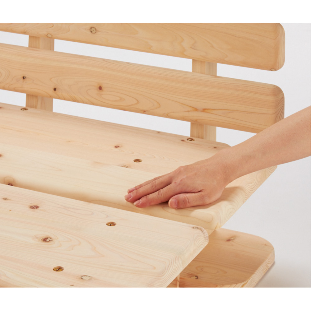 国産材(日光ひのき)100%で国内で製造している。天然木の経年変化を実感でき、その香りと温もりを末永くお楽しみいただける。板厚のあるすのこ板とフレーム部を全てネジでしっかり固定し、がたつきのない頑丈な仕様。6本の脚で支えているので、がっしりとした安定感がある。