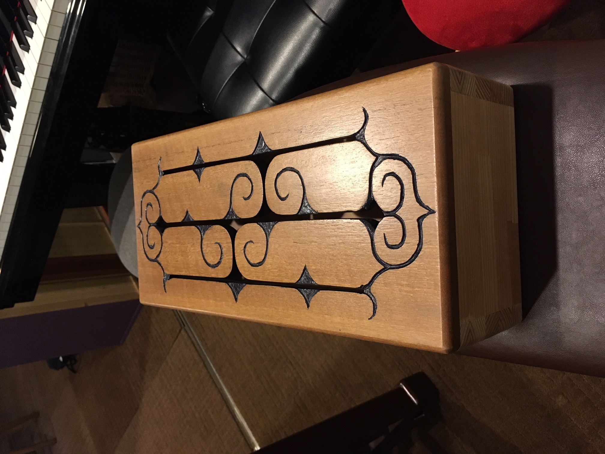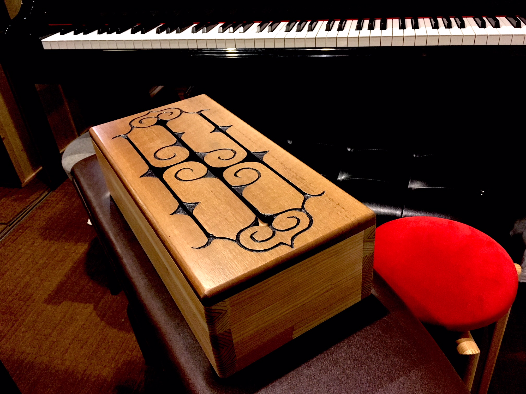 北海道カラマツのボディーと広葉樹の打面で構成したスリットドラム(4つの音程のある打楽器)。北海道のトラディショナルな文様であるシク・モレウ・アイウシを組み合わせた文様を長さの違う4つのトーンバーにデザインした。トーンバーの振動と箱の共鳴が楽器として成立する中にデザインを挿入する試み。