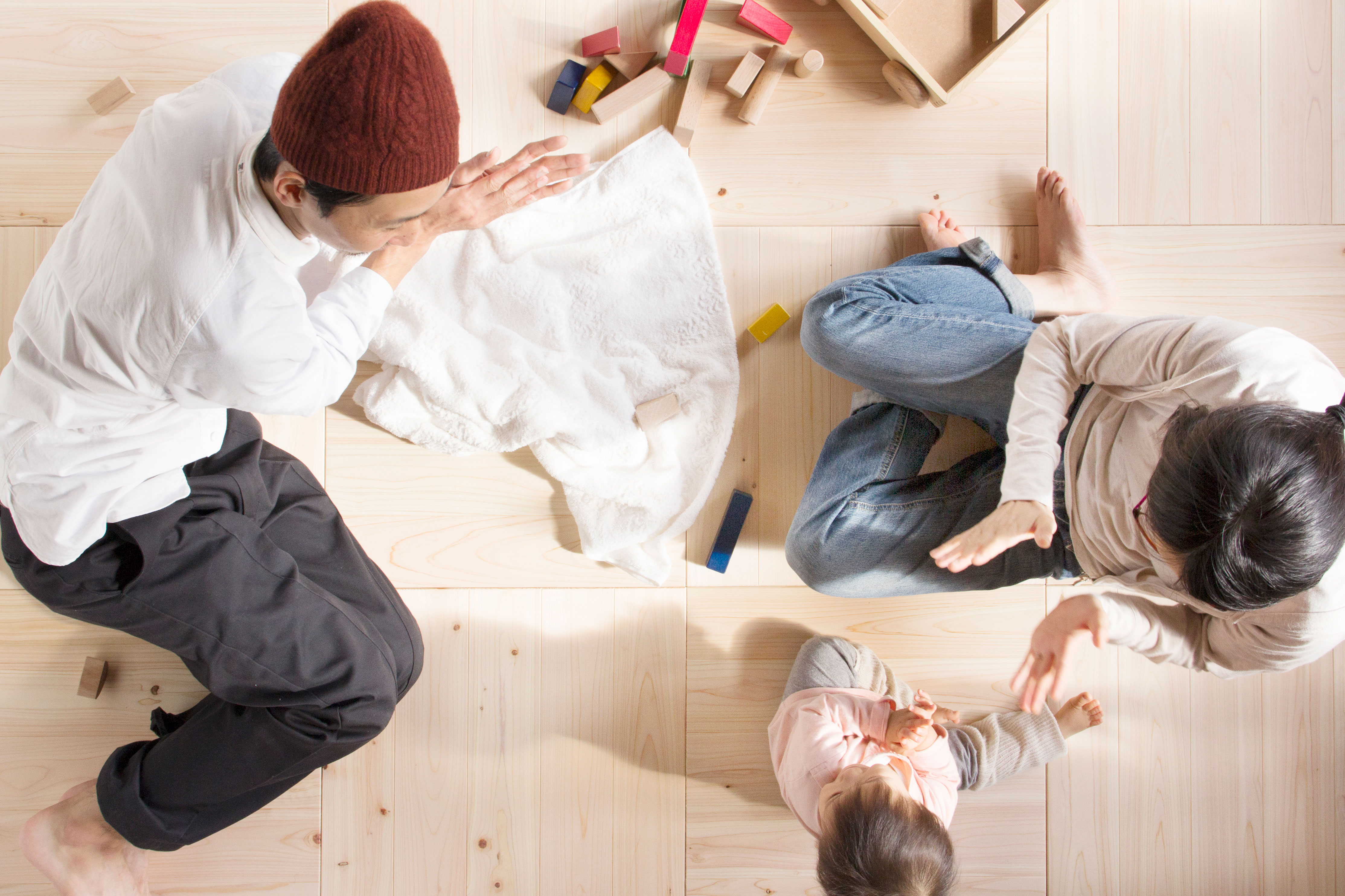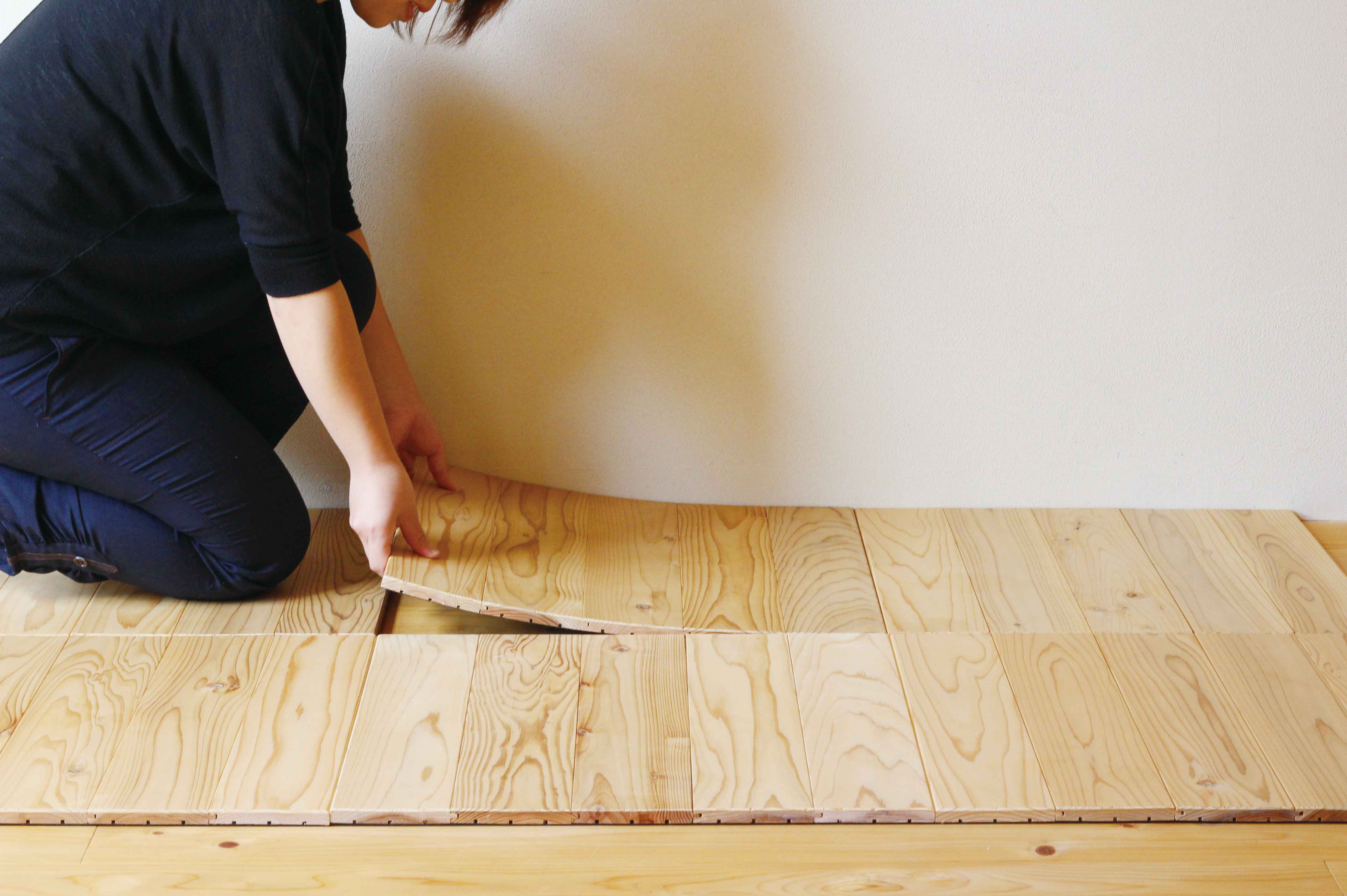 置くだけ簡単に、無垢の木の床がある暮らしをつくることができます。1.賃貸アパートやオフィスでも、簡単に無垢の床での暮らしを楽しめます。2.置くだけなので取り外しができて、プロに頼らなくても女性だけで簡単に設置ができます。3.引越し先でユカハリ・タイルを張れば、そこはもう自分の家。自分の床と一緒に気持良くて楽しい暮らしが待っています。