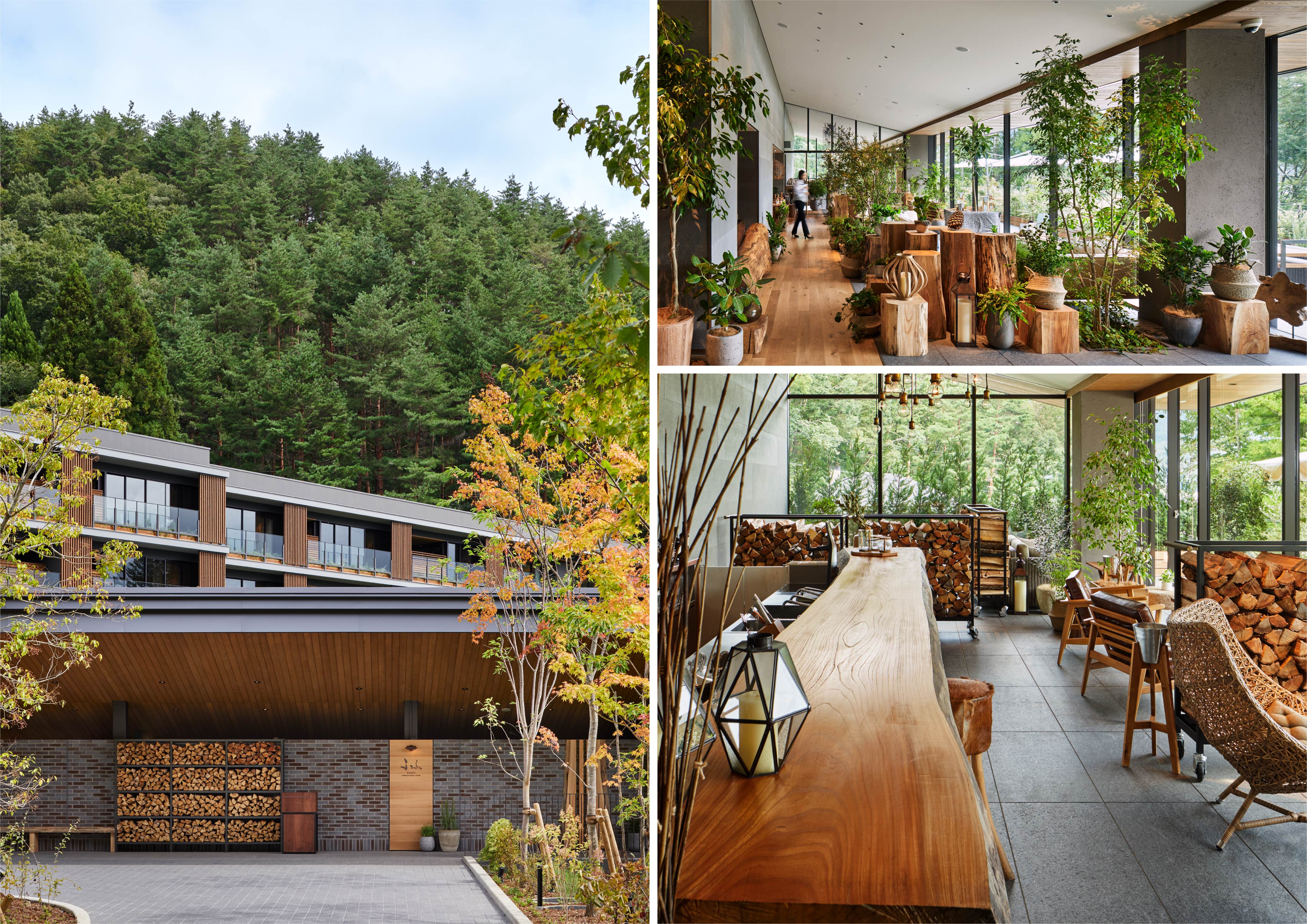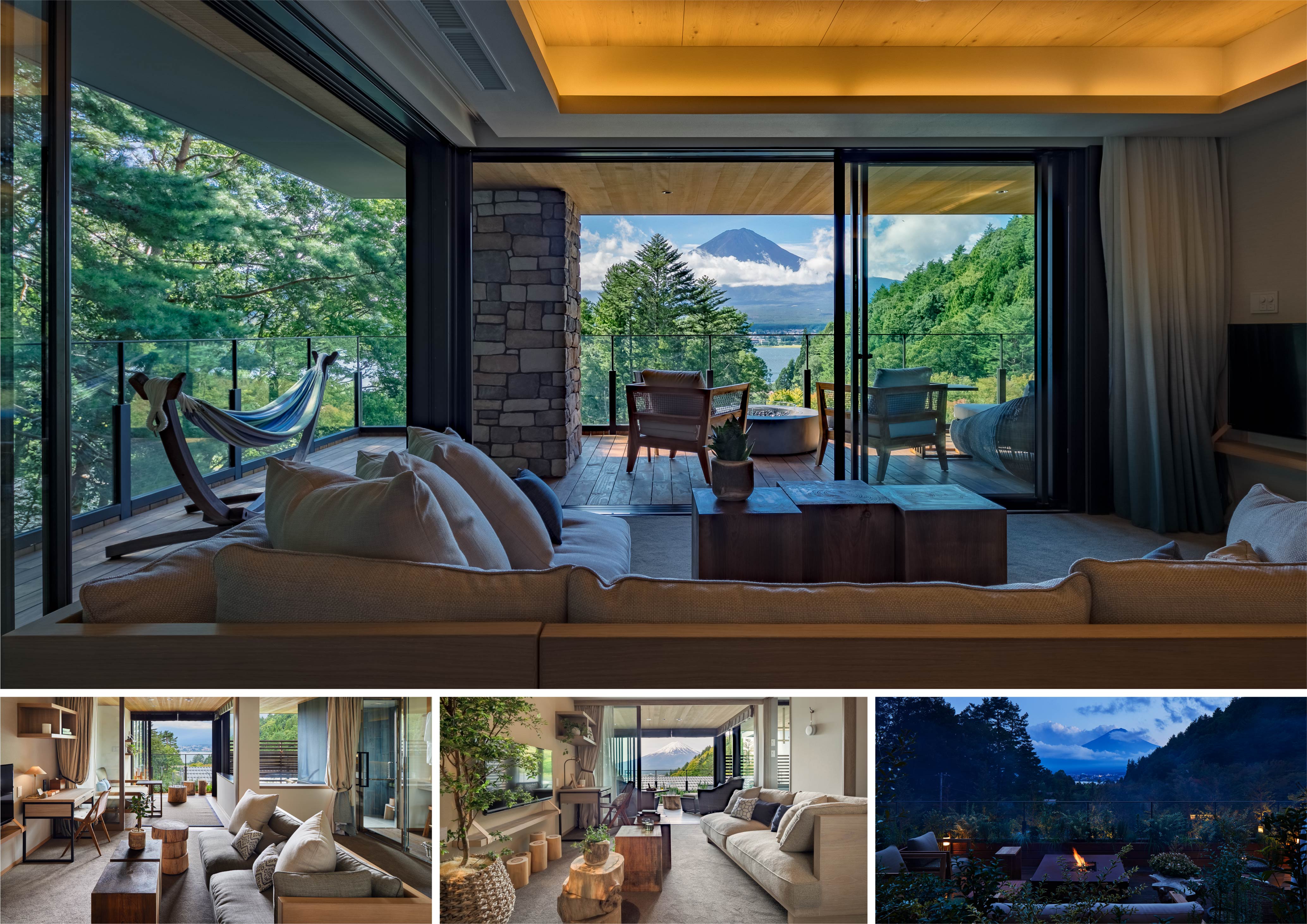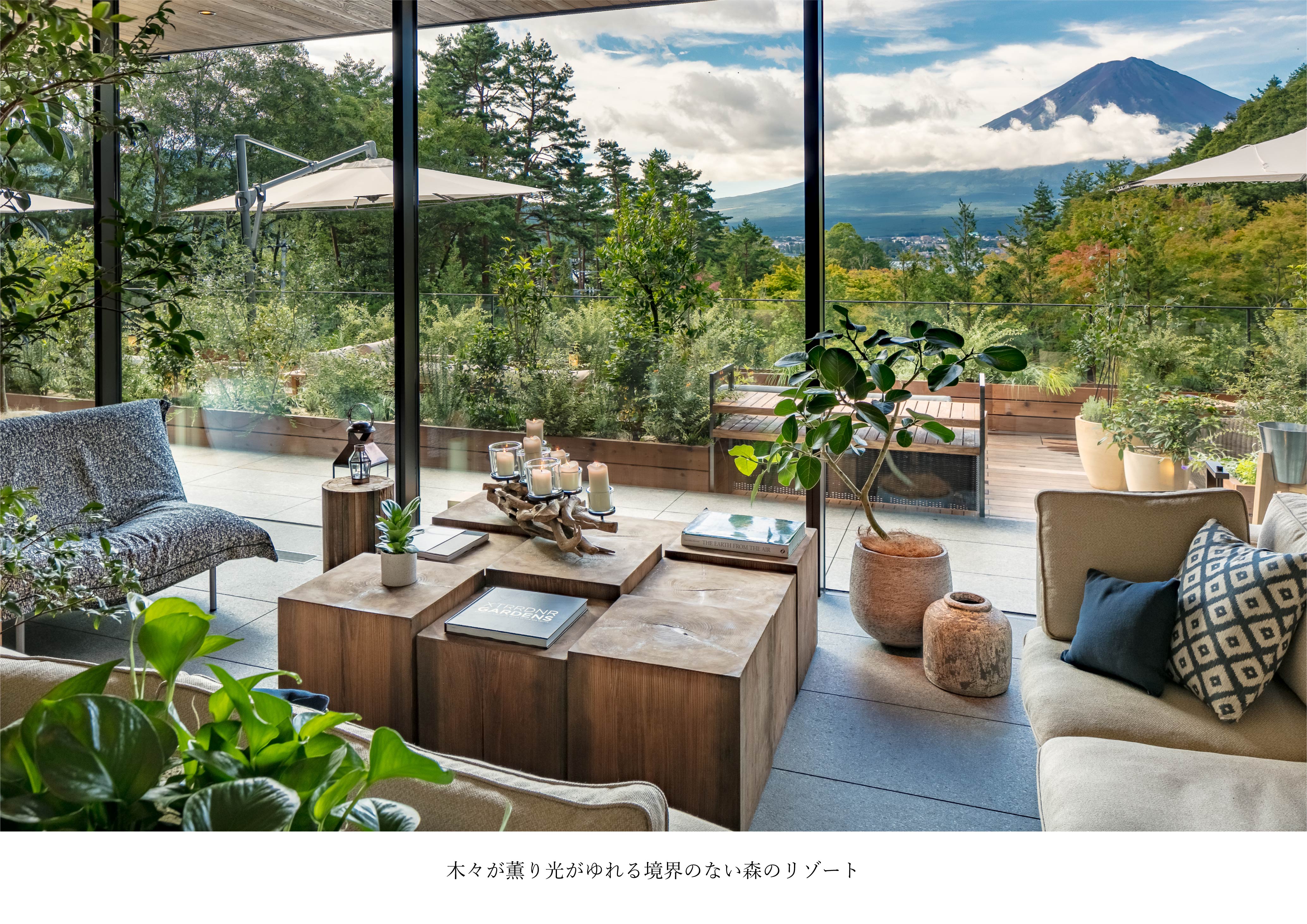 富士山と河口湖を南側に望む森の中に佇む宿泊施設。建物はボリュームを抑えた2つの棟に、 32の客室と専用のラウンジ・レストラン・温泉を設けている。豊かな自然を享受し、五感を呼び覚ます。地域に根ざし、この地でしか味わうことのできない滞在を提供する「日本リゾート」である。