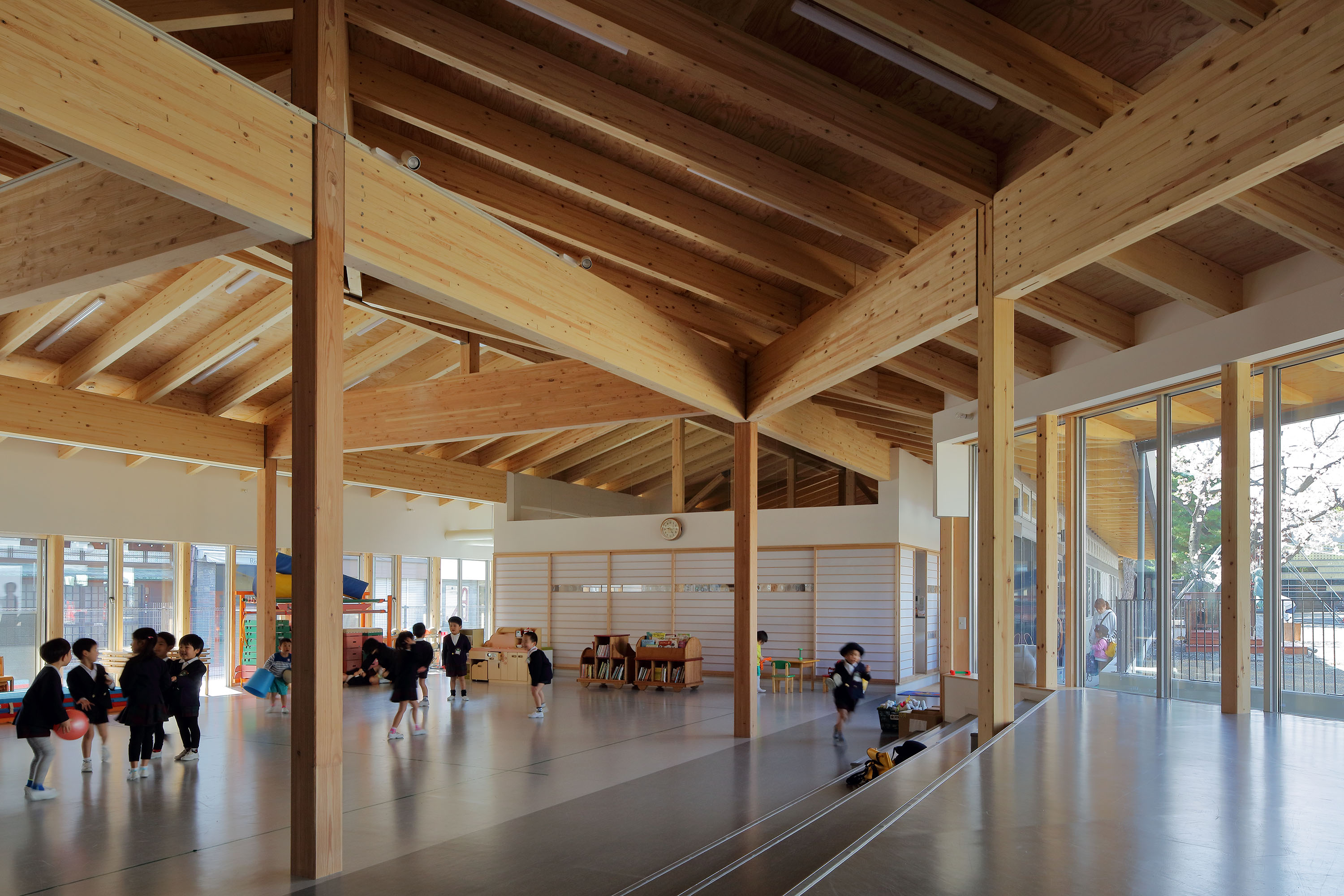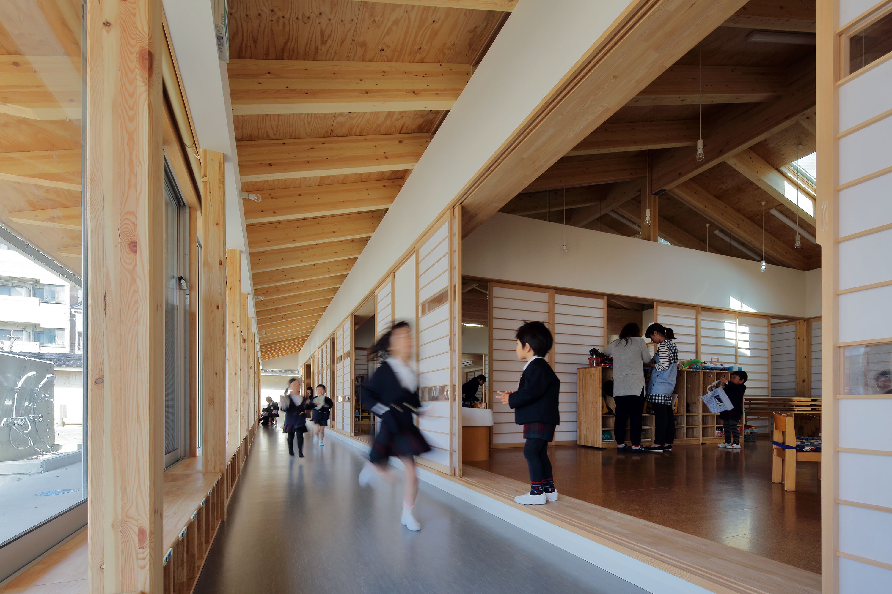 子どもたちの自由な遊びを妨げないよう園庭まで境内が連続し、教えの場と遊びの場が結び合う。木造平屋の長い軒下空間は寒い北陸の冬でも思い切り遊べ、地域特色を埋め込んだ伝統的な和のデザインは周辺の街並と馴染む。