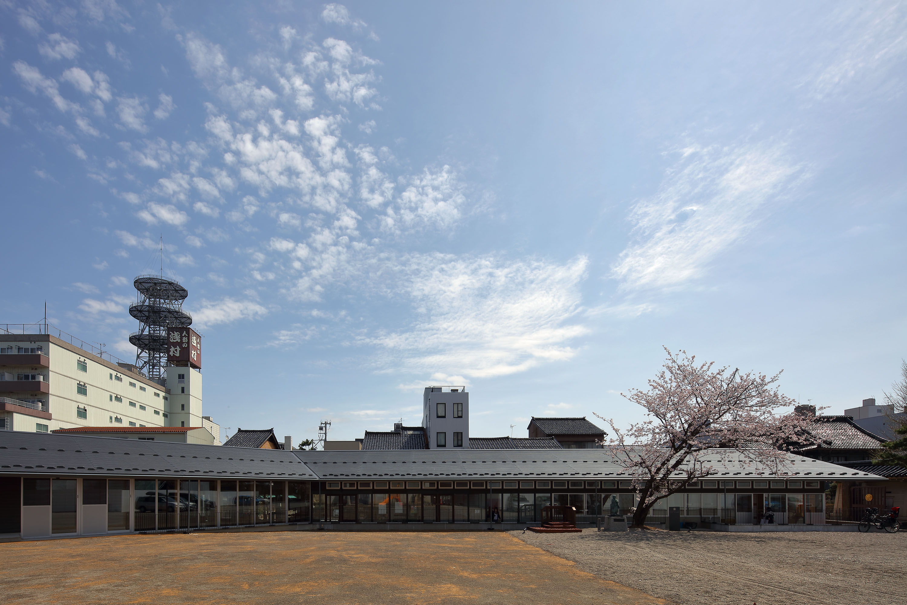 金沢市中心市街地の真宗大谷派金沢別院(東別院)境内に建つこども園。本堂を中心に境内と一体となった園庭を設け、囲むように園舎を配置した。園舎は木造平屋で、長い軒下空間を有し、内部は日本の伝統家屋の土間空間を取り入れ、軒下とあわせて北陸の冬であっても活動出来る自由な遊び空間をつくりだしている。