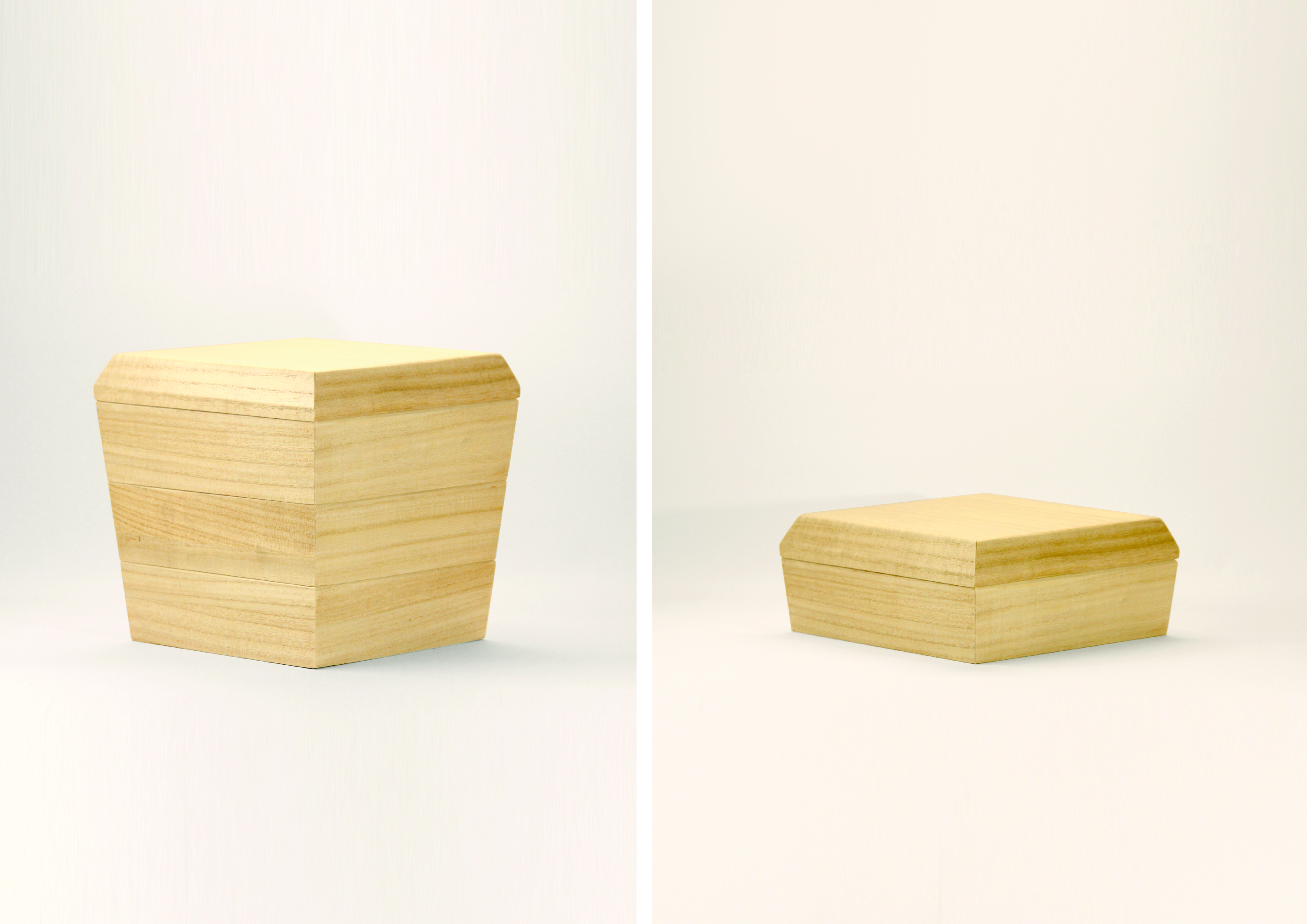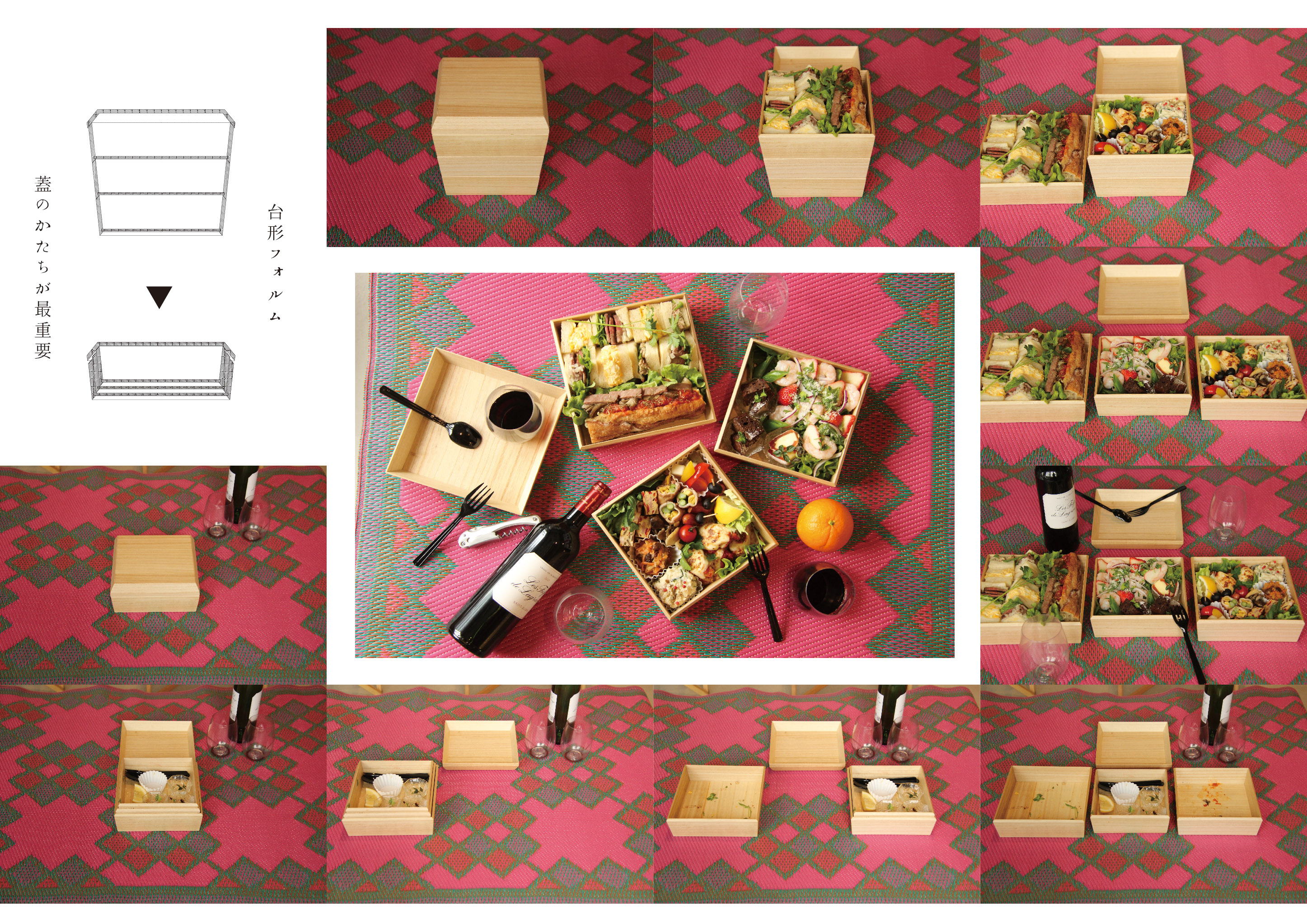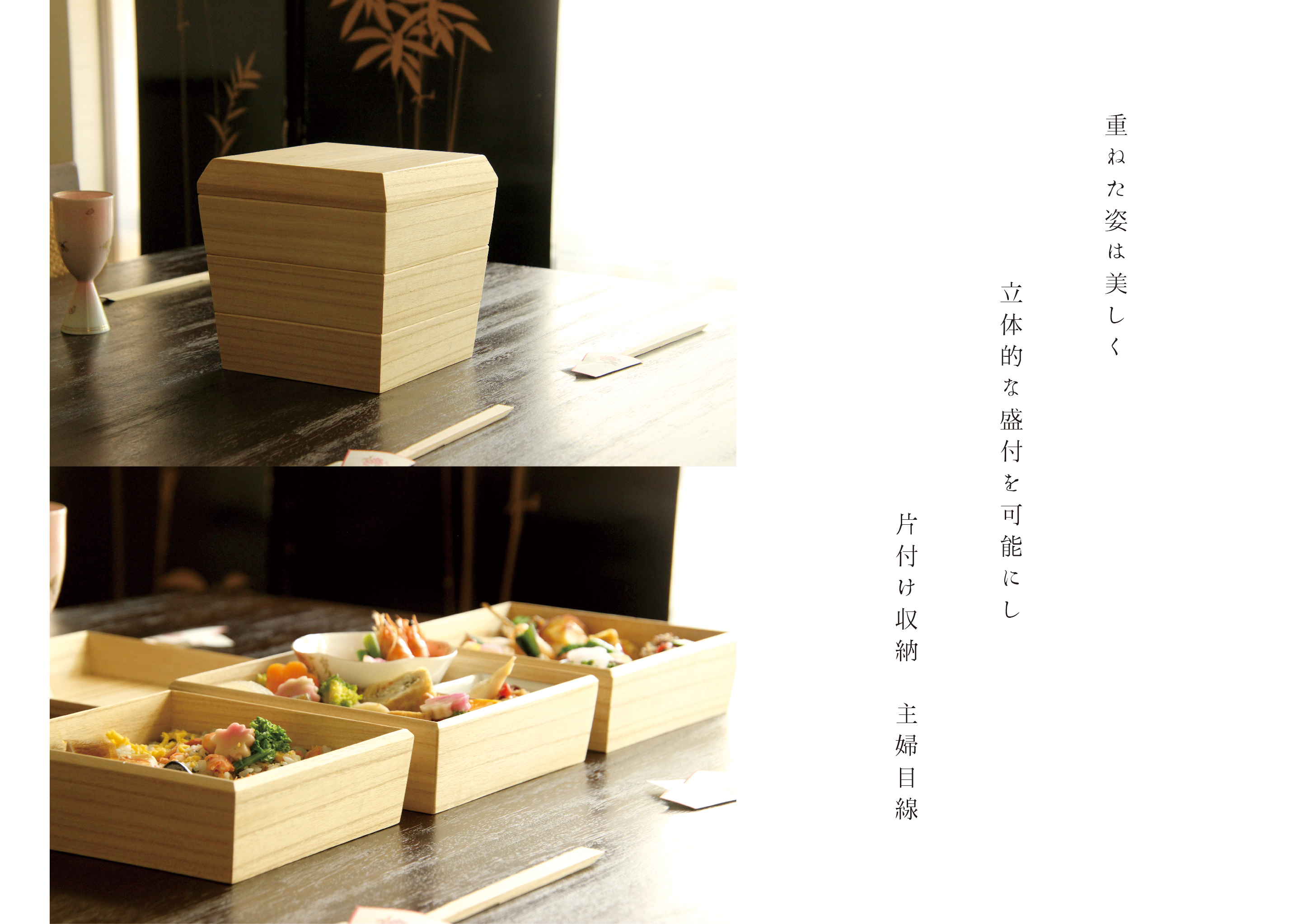 家庭内の伝統行事・運動会や花見といったイベントで使われる事が多い重箱を現代の生活にマッチするようReDesignした。重箱を所持する上で問題なる収納の悩みを解決し、使用時も美しいという二面性を追求。重箱全体にテーパーをつけ、入れ子構造にすることで重箱の体積の最小化を実現している。