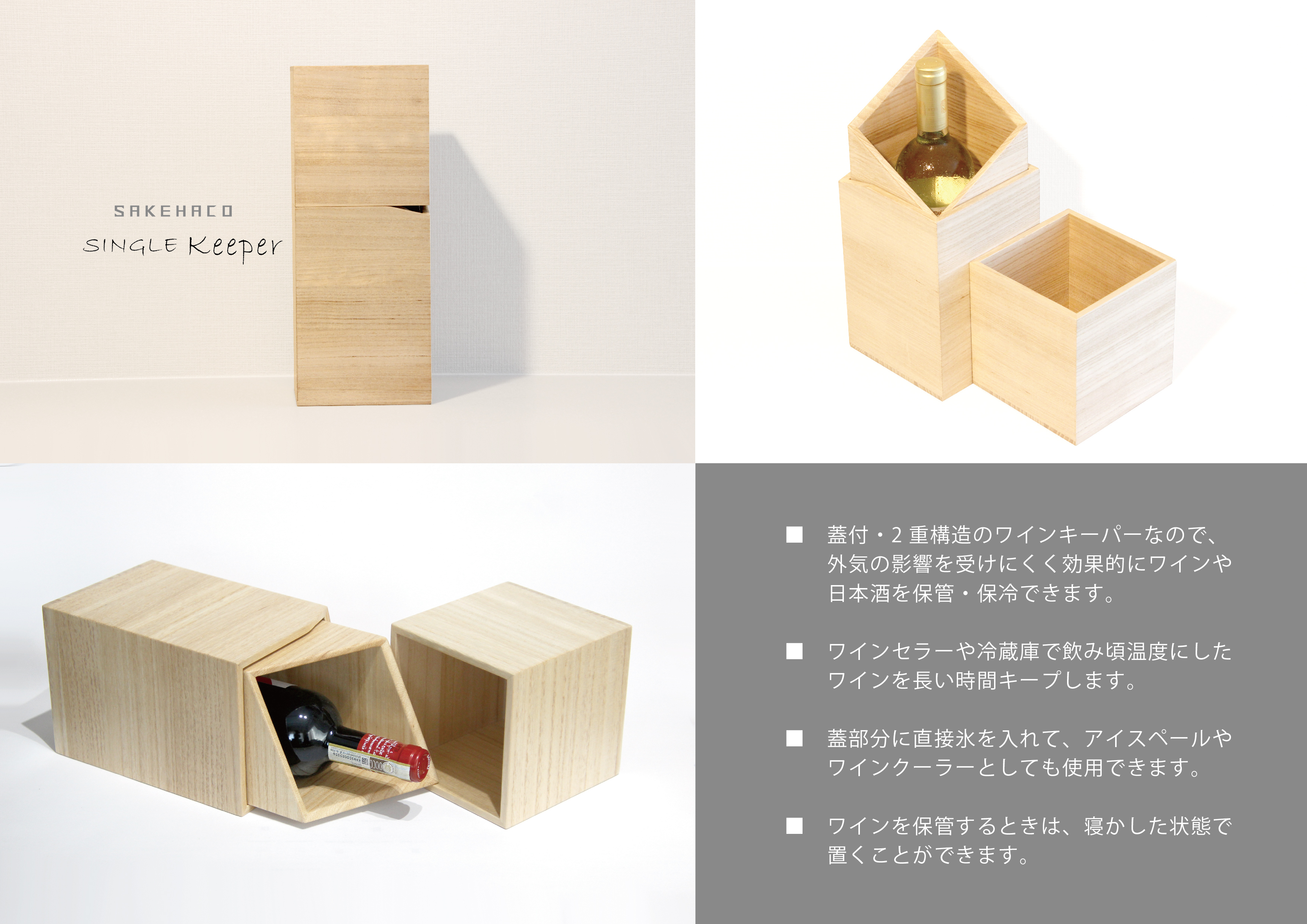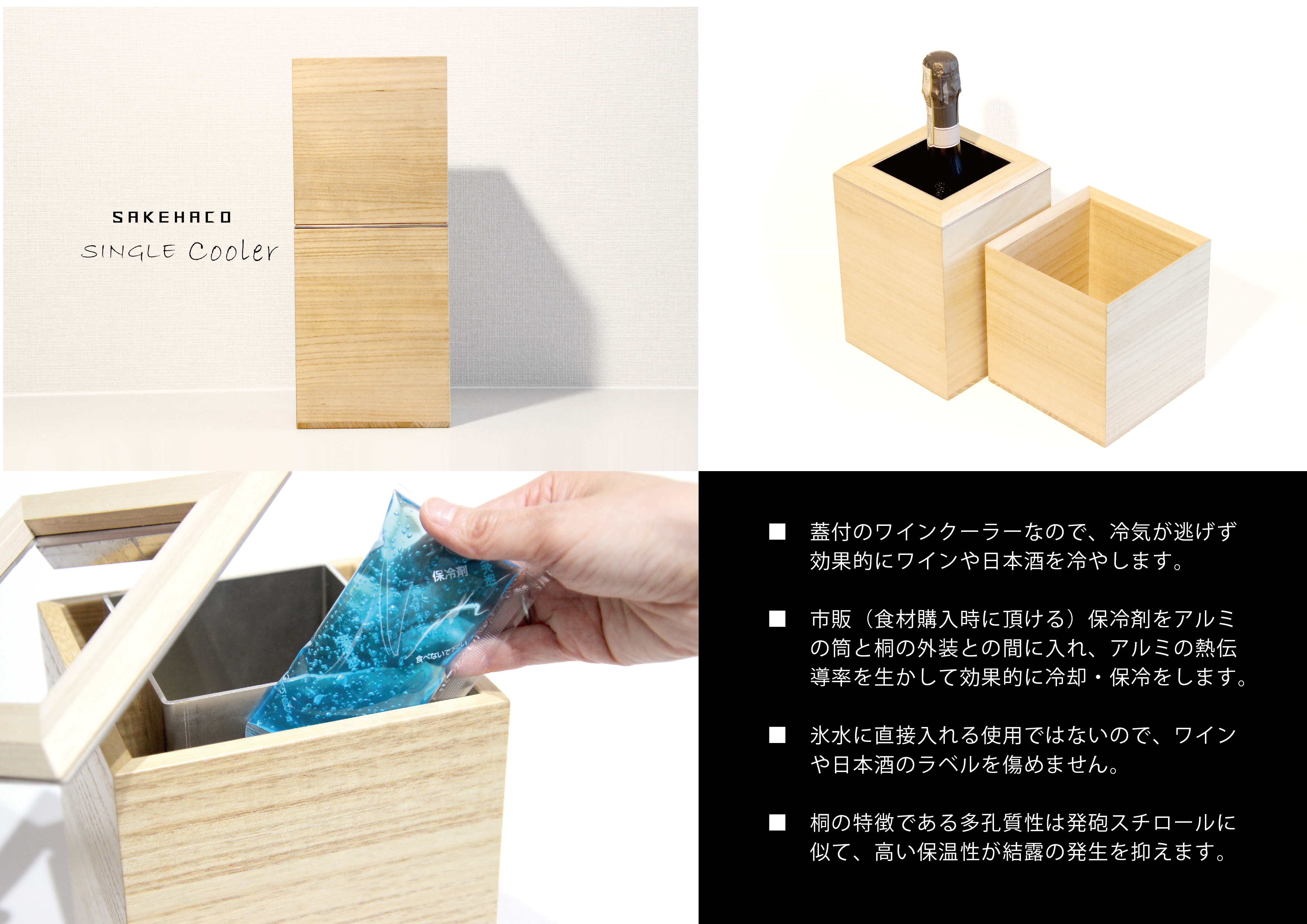 桐の多孔質性を生かして設計された高い保温効果をもつ、1本もののワインクーラーとワインキーパー。ただの美しい箱ではなく各商品が特殊な2重構造にしている。また、箱自体がギフトボックスとしても利用できるようにデザインしているため、お酒と組合せ、特別な贈り物としても活用してもらえる。