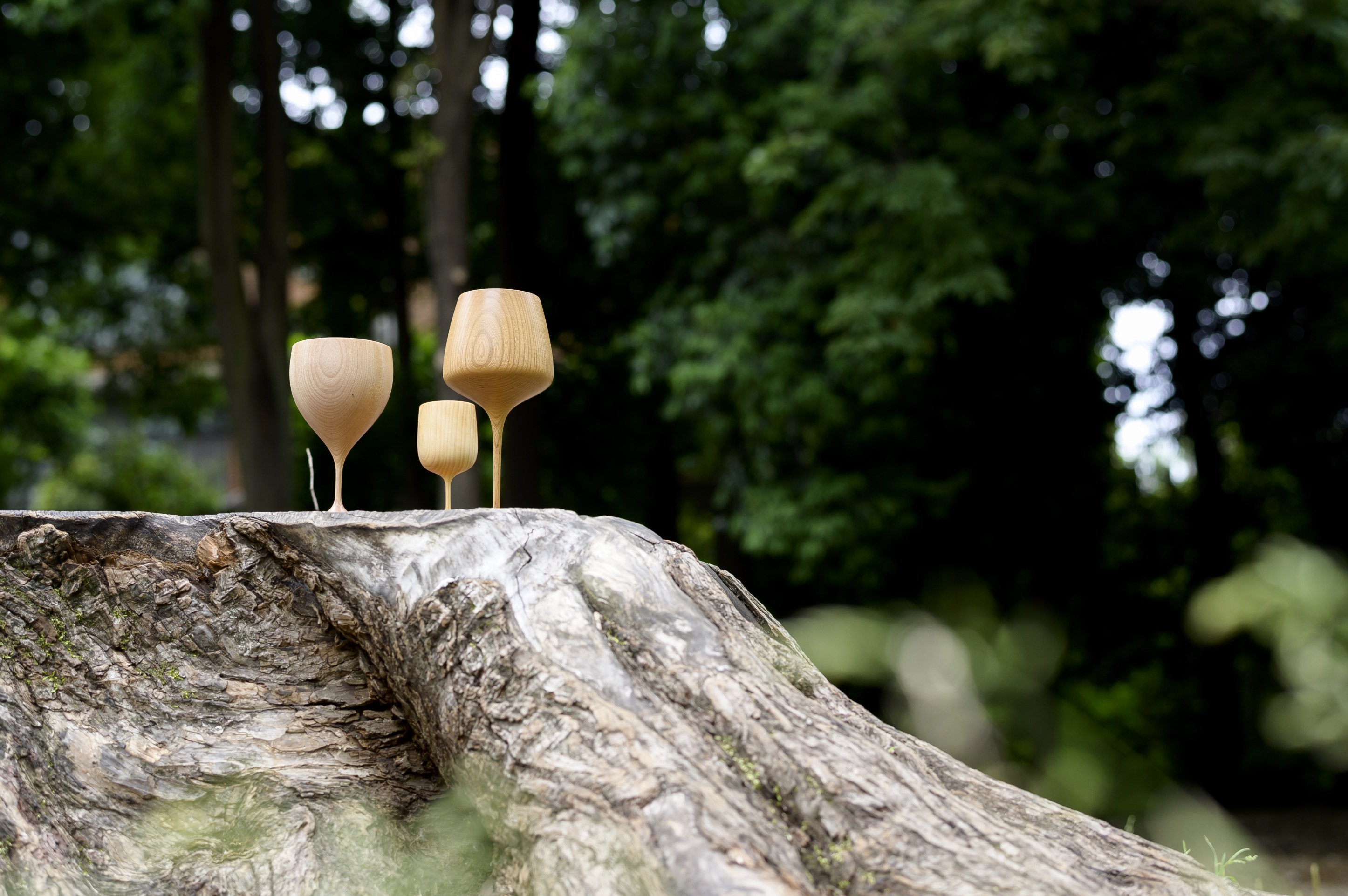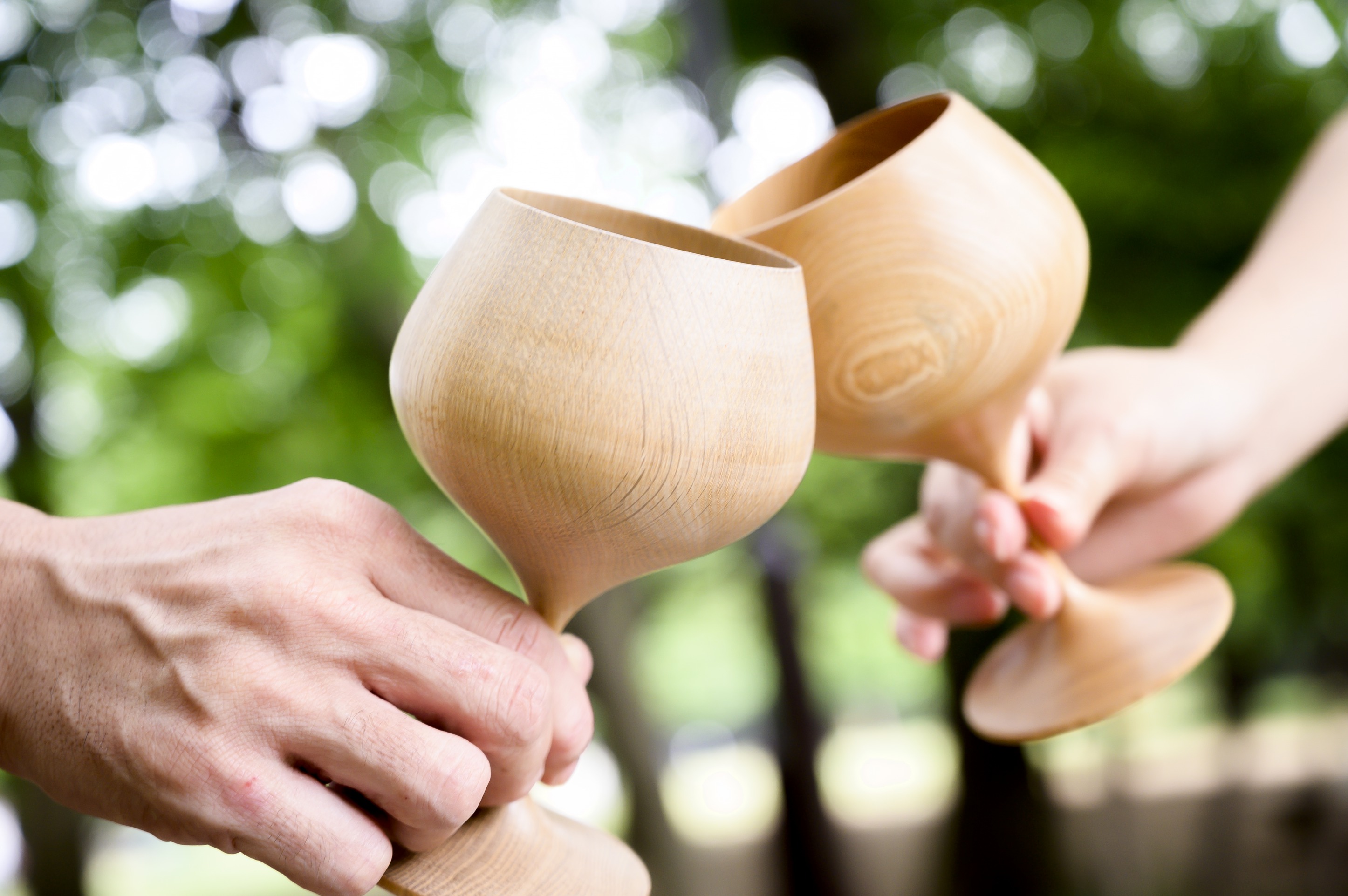一本の樹から削り出したワイングラスで、持った時の木の質感が心地よい。5種の形と6種の木材のバリエーションで、利用シーンに応じた選択も可能である。木地師の技と現代の食のシーンやエコロジカルなライフスタイルが融合した逸品と言える。