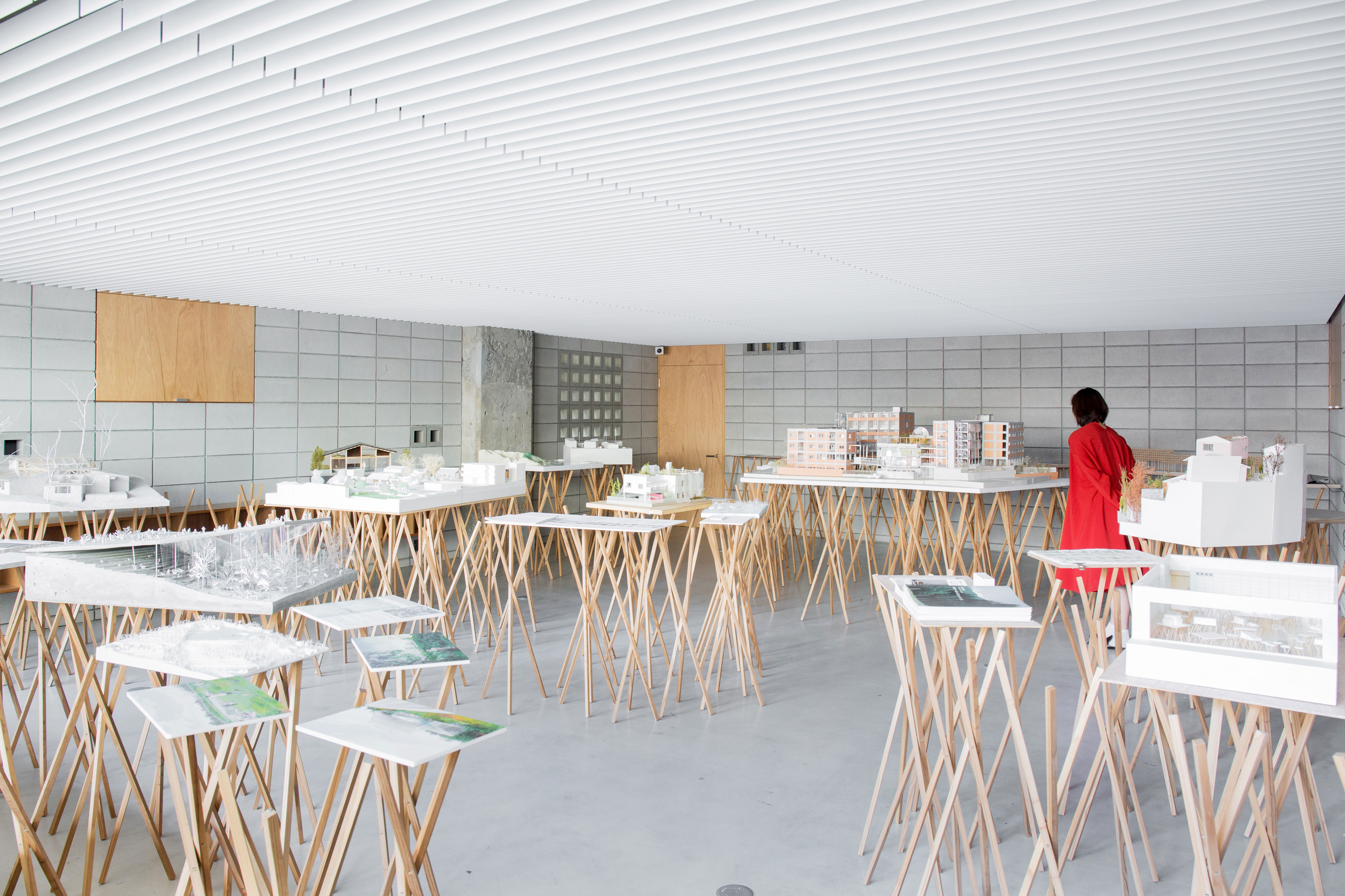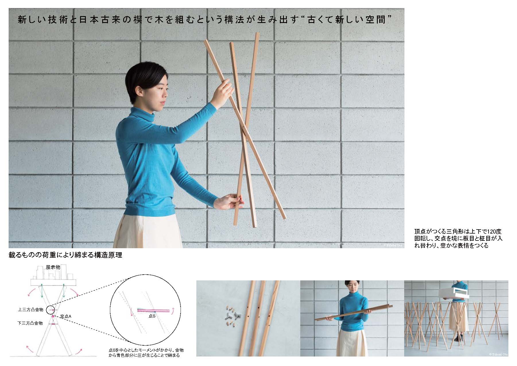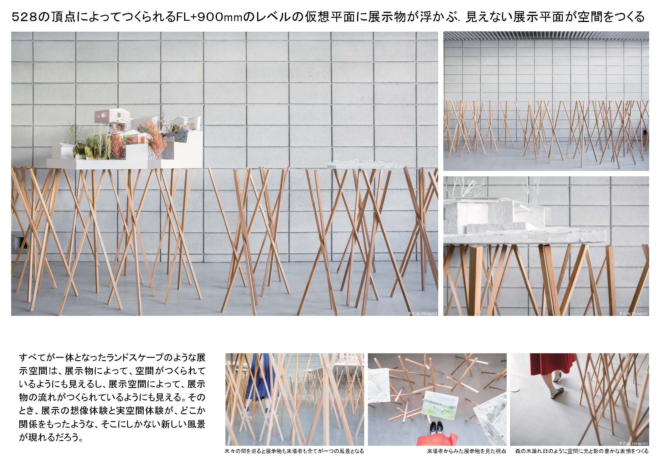 展覧会の展示台であると同時に会場構成・空間をもつくることができる什器。圧縮成型技術により、杉の間伐材の性能改善し有効利用し、さらに、強度を持った圧縮成型材を構造力学的に合理的な特殊な組み方を発明したことで、最小限の材で多様性を持った什器が実現した。天板を置いてテーブル等としても利用できる。
