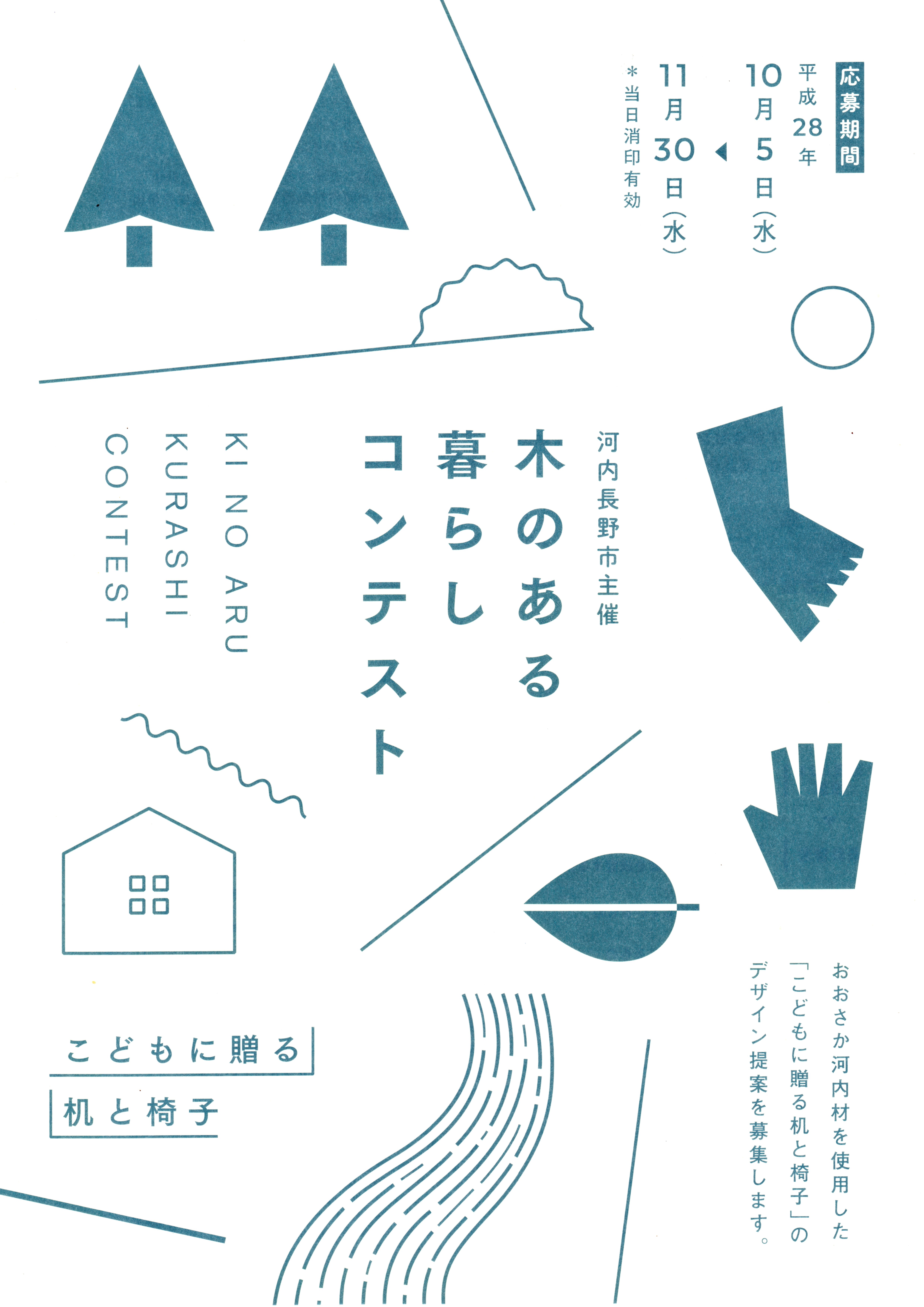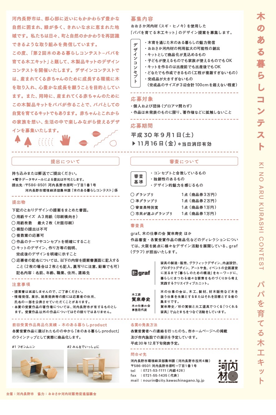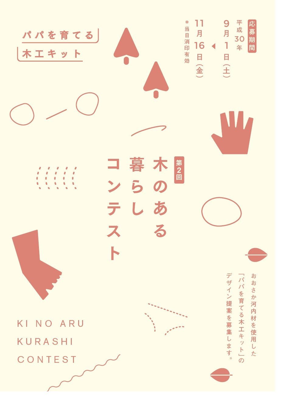 河内長野市の地域木材である「おおさか河内材」の認知度向上や木育を通じた木のある暮らしの魅力発信等を目的としたコンテストで、平成28年度は「子どもに贈る机と椅子」、平成30年度は「パパを育てる木工キット」のデザインを募集した。平成28年度の受賞2作品は、商品化されウッドデザイン賞も受賞している。