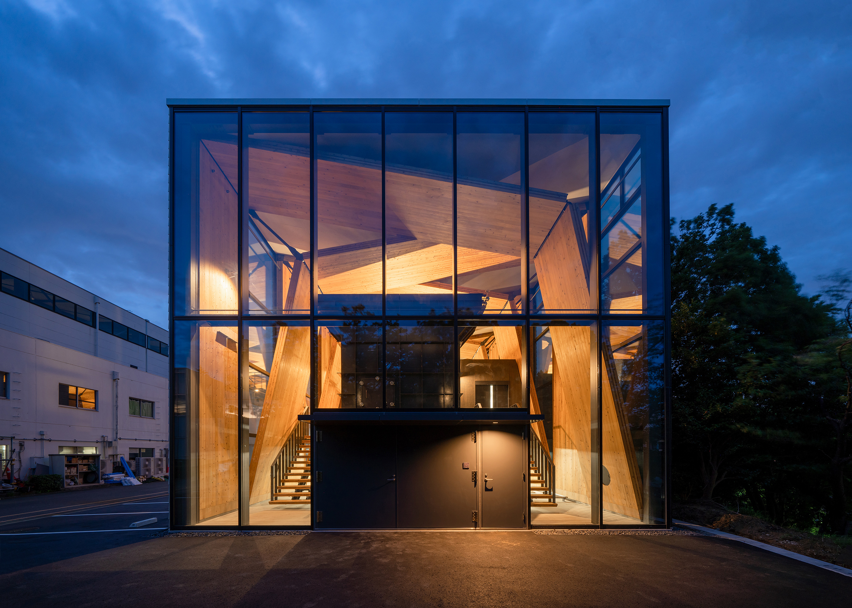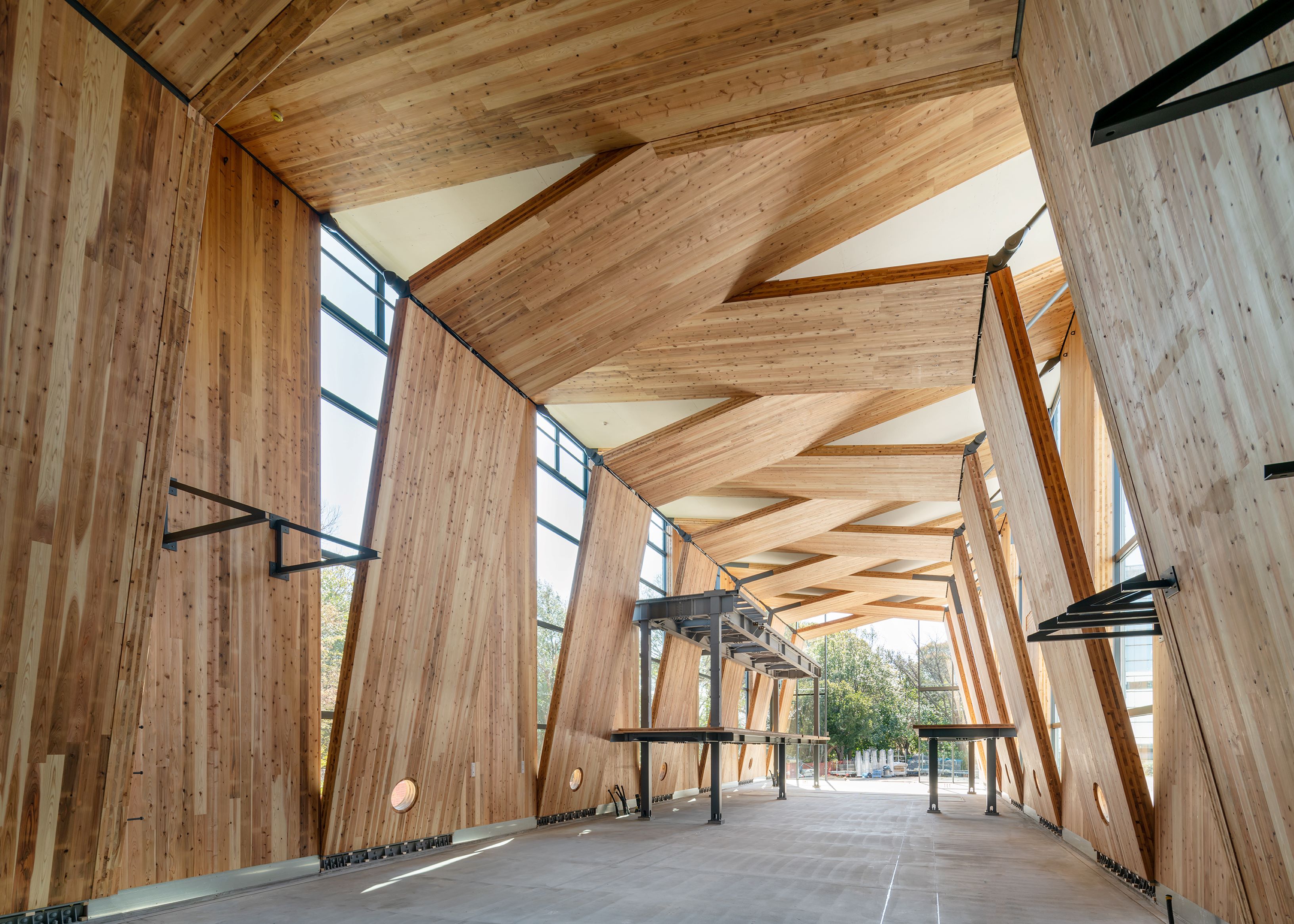 国内最大級の12mスパンが可能なCLTの構造システムを開発し、大規模な空間での利用を実証した社会提案性あるプロジェクトである。構造材を現しにしており、実験装置と木材のコントラストが美しく、木の香りや温もりを感じる、次世代型の技術センターの趣きがある。