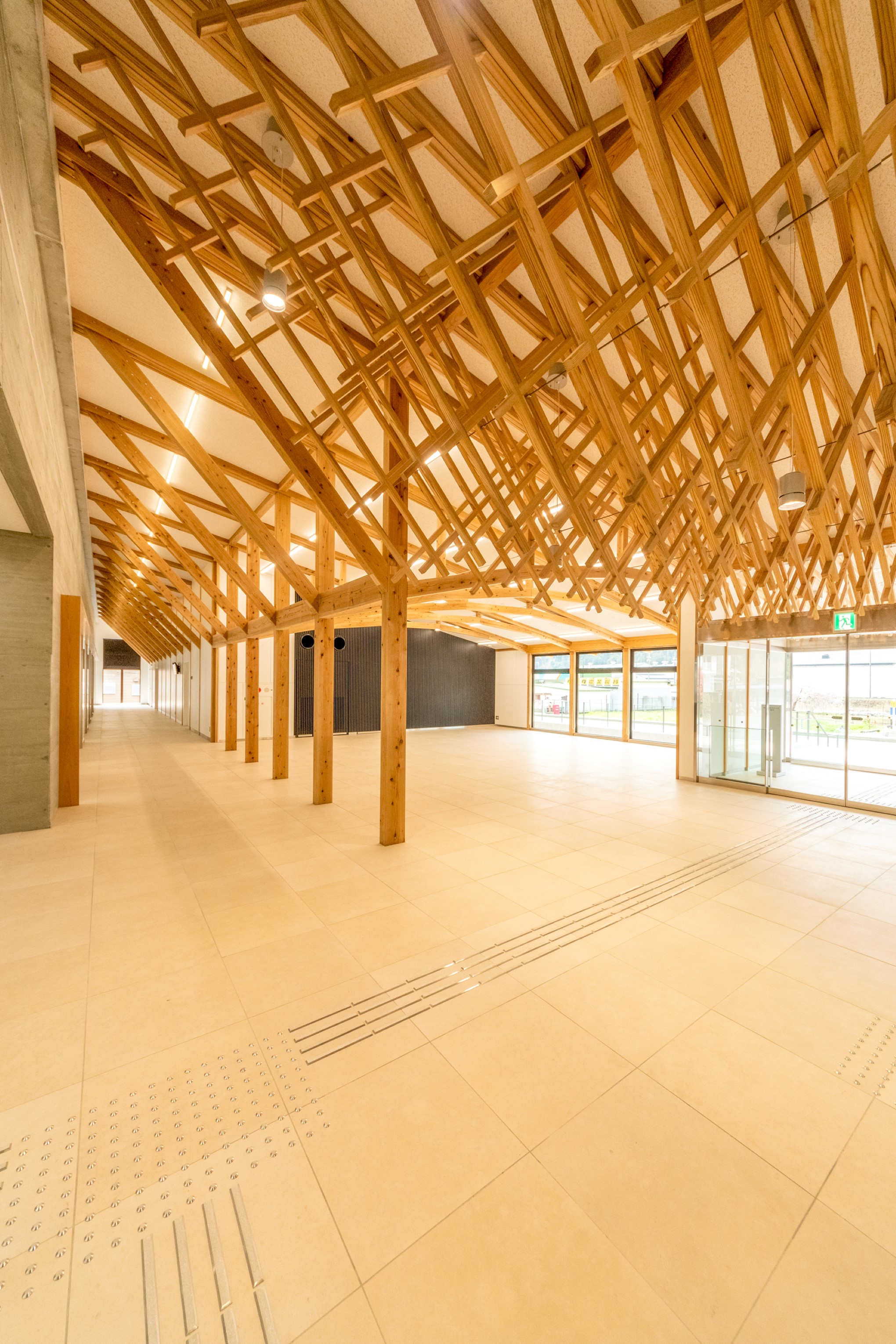 地元産の杉を使った木造ハーフアーチ構造は世界初の試みであり、開放感のある多目的ホールを実現させた。エントランスホールでは、同じく地元の杉を用いた格子細工が来訪者を迎える。外壁のガラスから見えるホール柱や梁がこの地が林業とともにあることを伝えている。
