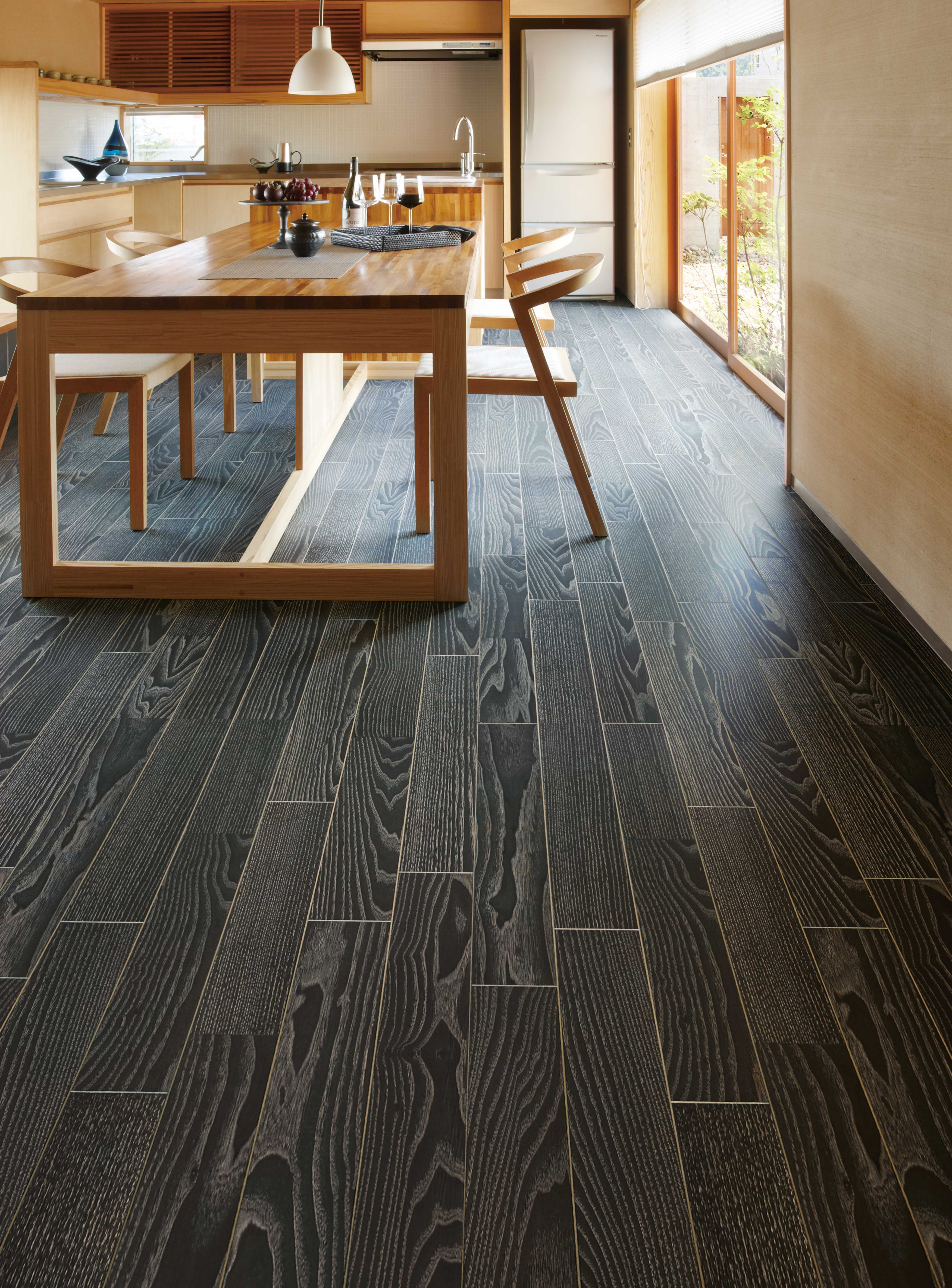 国産材を活用した製品を発売し、森林の活性化に貢献したいという想いで開発しました。構成材料として基材の合板、フローリングの性能向上のために使用するタフテックベース、表面化粧材であるツキ板に国産材を使用しています。表面の色も我が国の伝統美を意識した色を使い、内外共に「国産・日本」を表現した製品です。木の風合いをそのままに、傷の付きにくい塗装を施し、インテリアにマッチする製品としました。