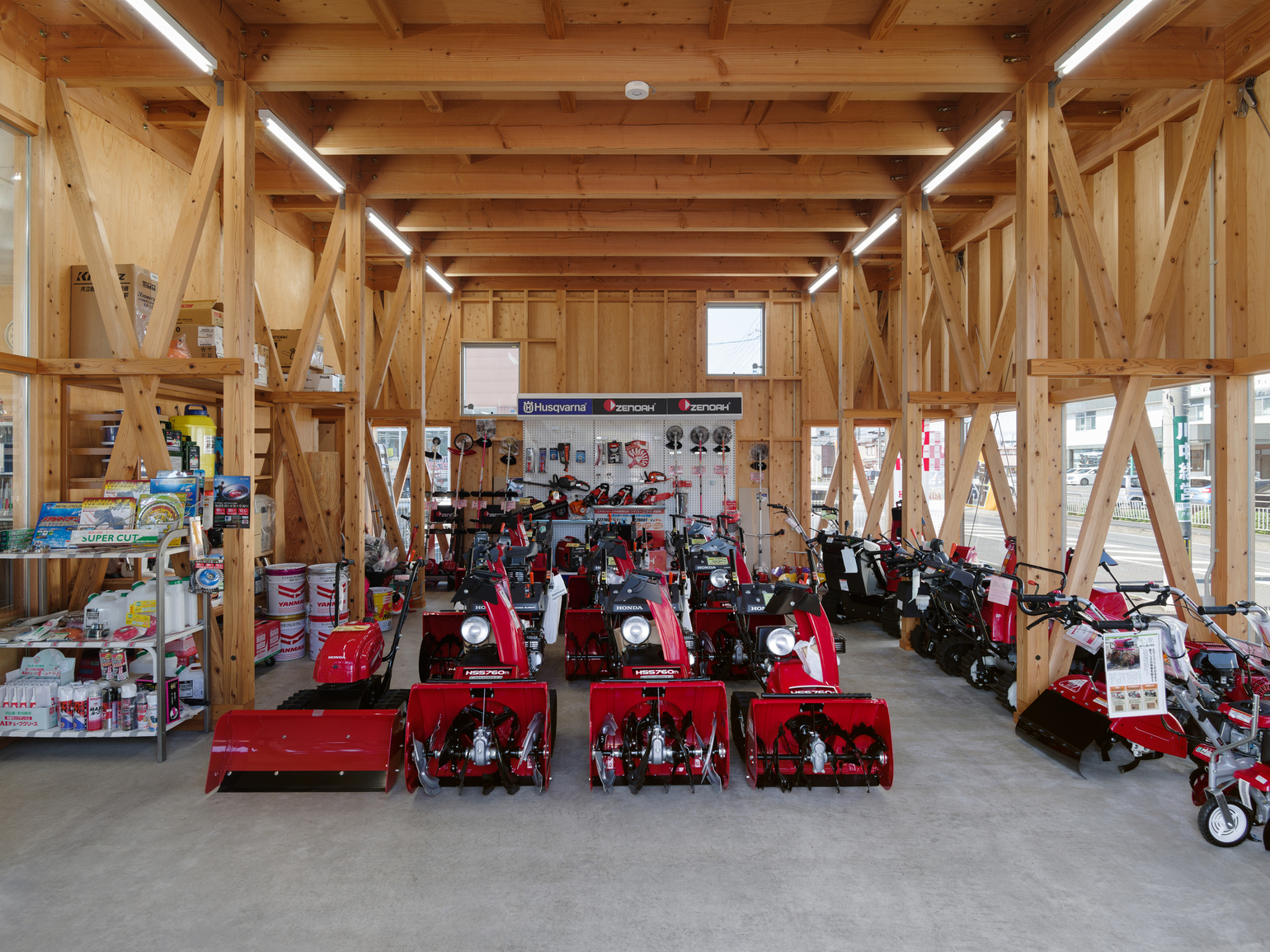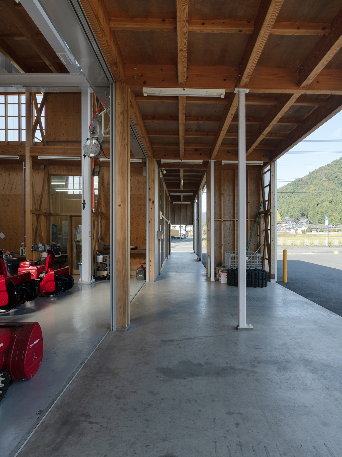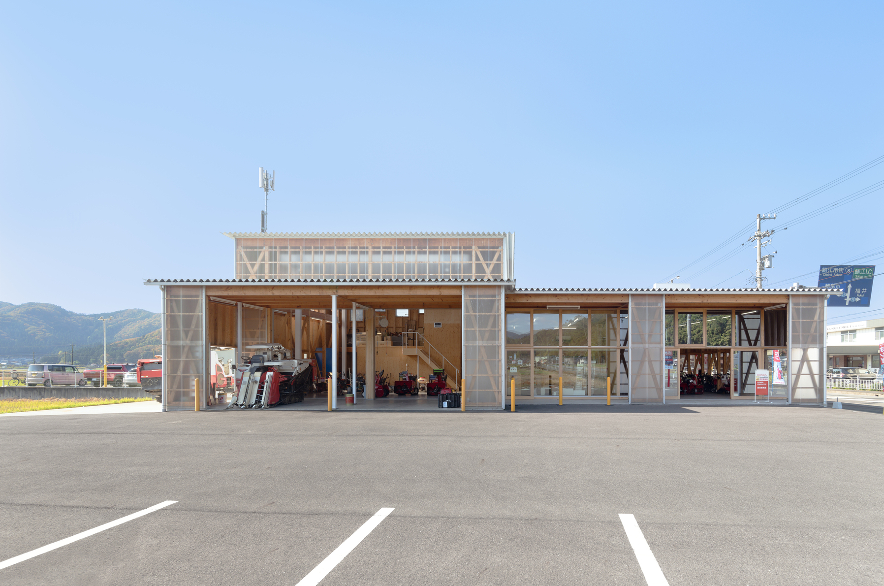 地域に根差す農機販売・修理会社の建物で、機械的な要素が多い空間と木造在来工法の木質感のコントラストが印象的である。立地条件から、多くの人々の目に触れることを意識した、企業ブランディングに貢献する木造建築のあり方を提示した。