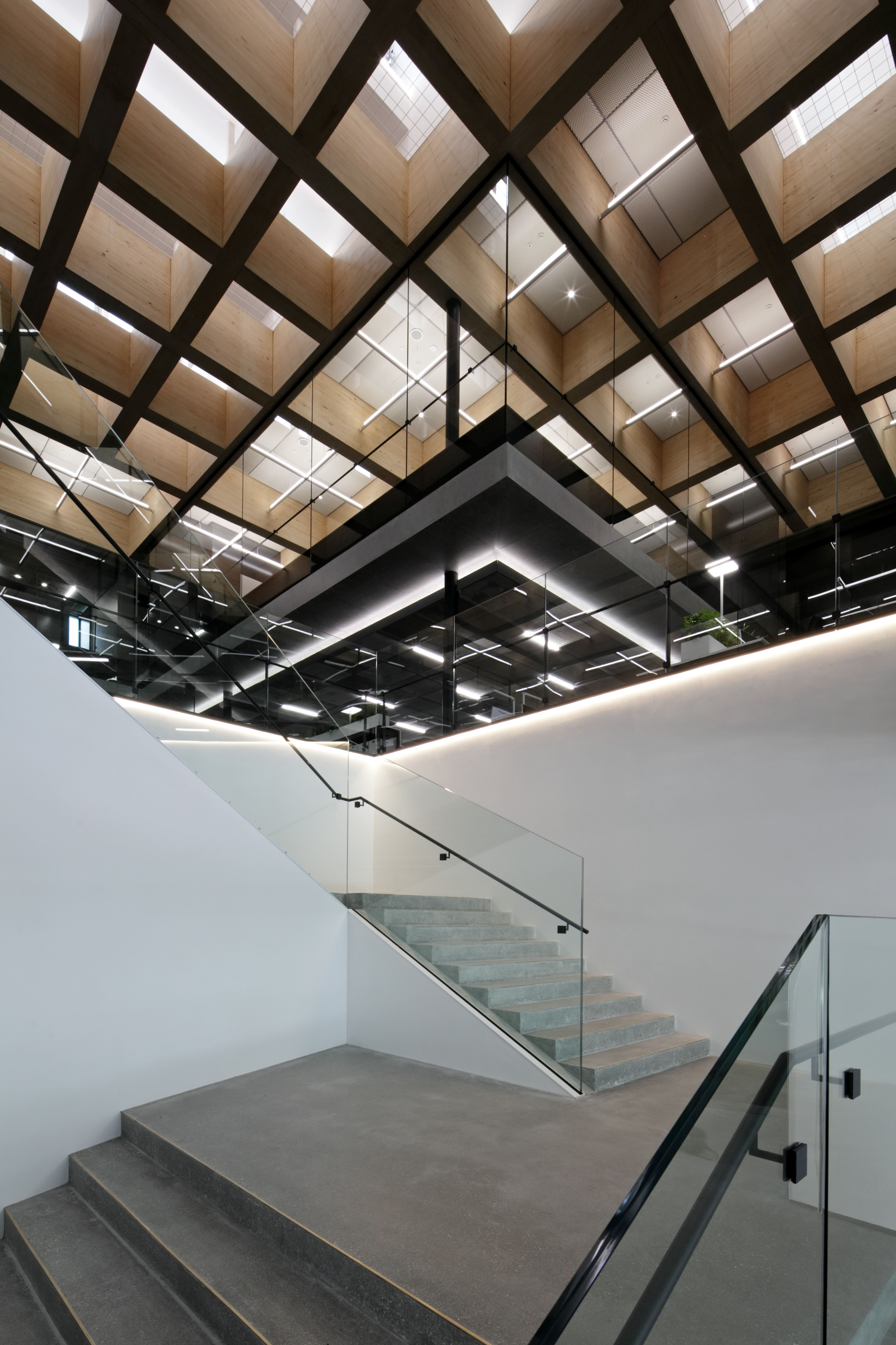 清水建設株式会社北陸支店の新社屋である。「ZEB」を達成しながら、伝統的街並みと調和するデザインとした。オフィスエリア天井は、国内初の「能登ヒバ(石川の県木)」を耐火被覆として利用した耐火木鋼梁による格天井とした。木の温もりを感じられるオフィスを実現しつつ、地産地消にも貢献している。