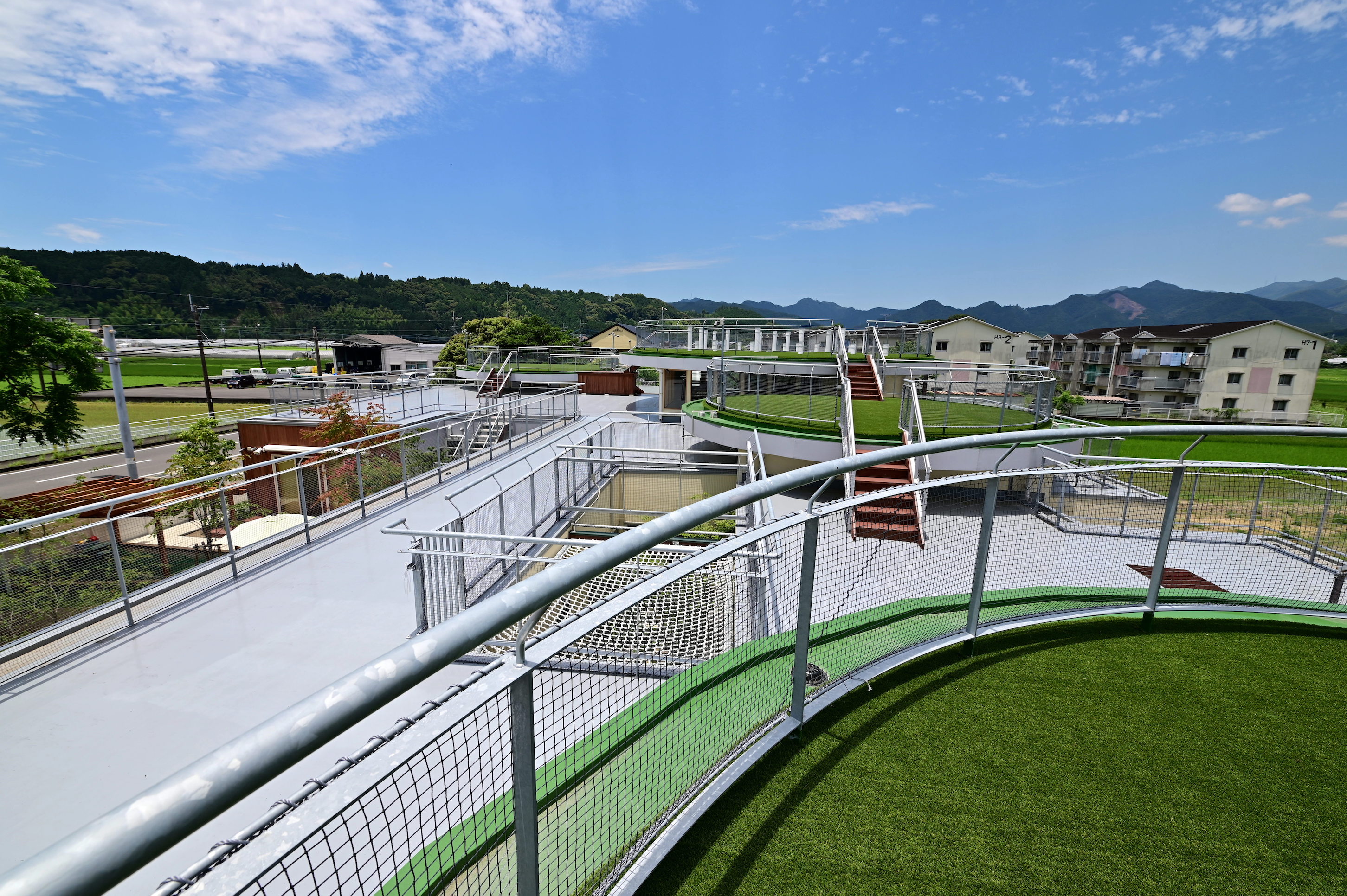 木造園舎で地方(田舎)再生につなげる。雑木の森、ビオトープ、樹木を生かした園庭と宮崎県産材の杉を使い、木の温もりを五感を通して体感できる木造の園舎である。木漏れ日の注ぐランチルームと屋上の避難を兼ねた4つ の円形空中庭園が特徴。都会で は味わうことの少ない自然体験型の園舎づくりができた。
