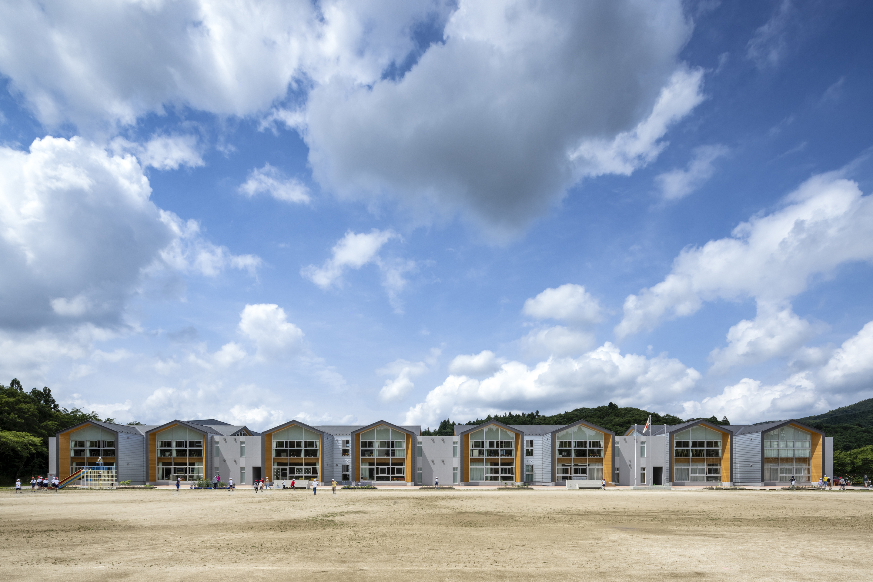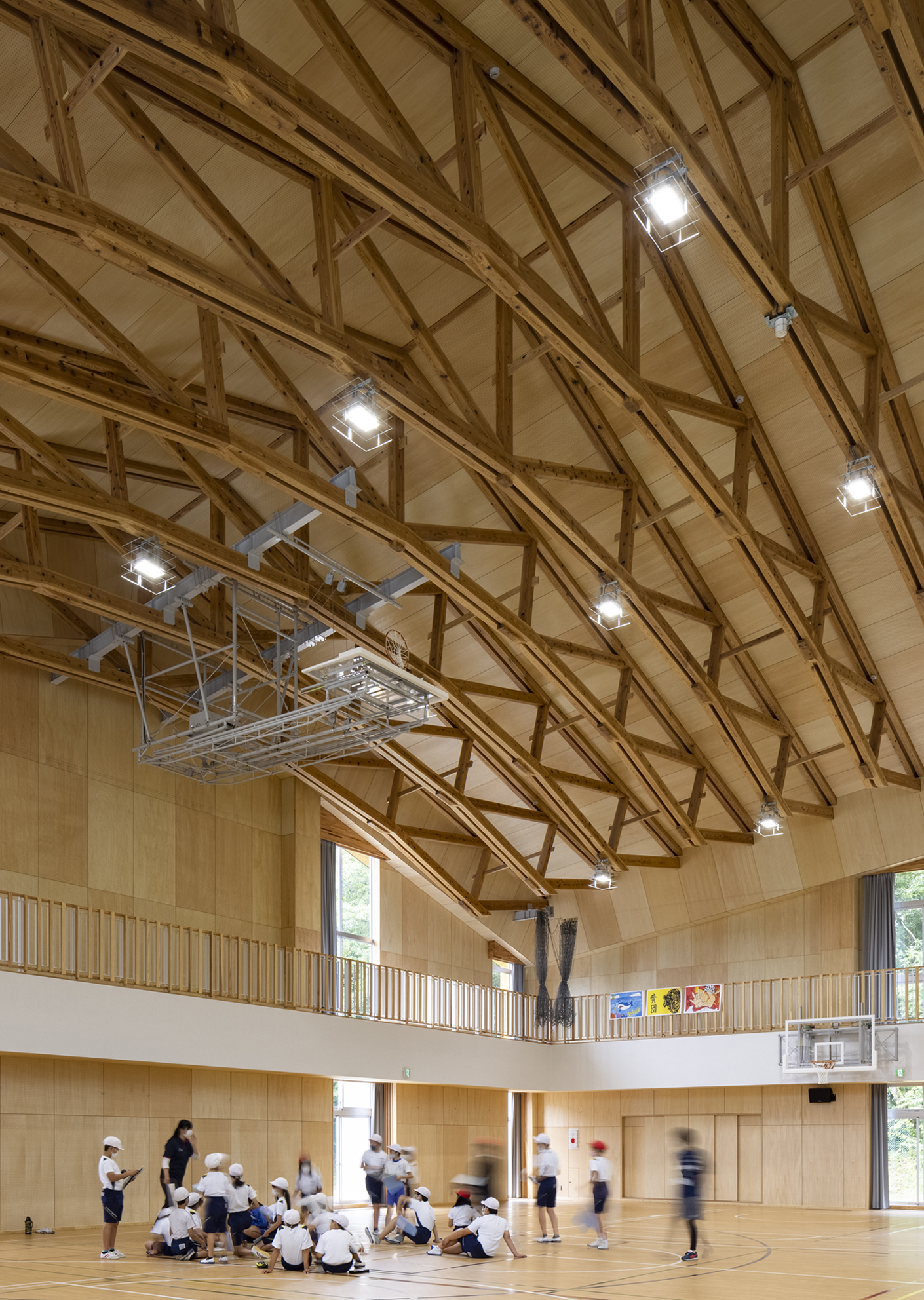市中央に位置する水府地区では、少子化の影響により児童生徒数の減少が続いている。そのような状況において地場産業でもある木材の活用と大工技術の継承を踏まえ、木造の実現に至った小中一貫教育校である。子どもたちが9年間を過ごす「学び舎」として、木のぬくもり、自然の移ろいを感じ、感性が豊かになる学校を目指した。