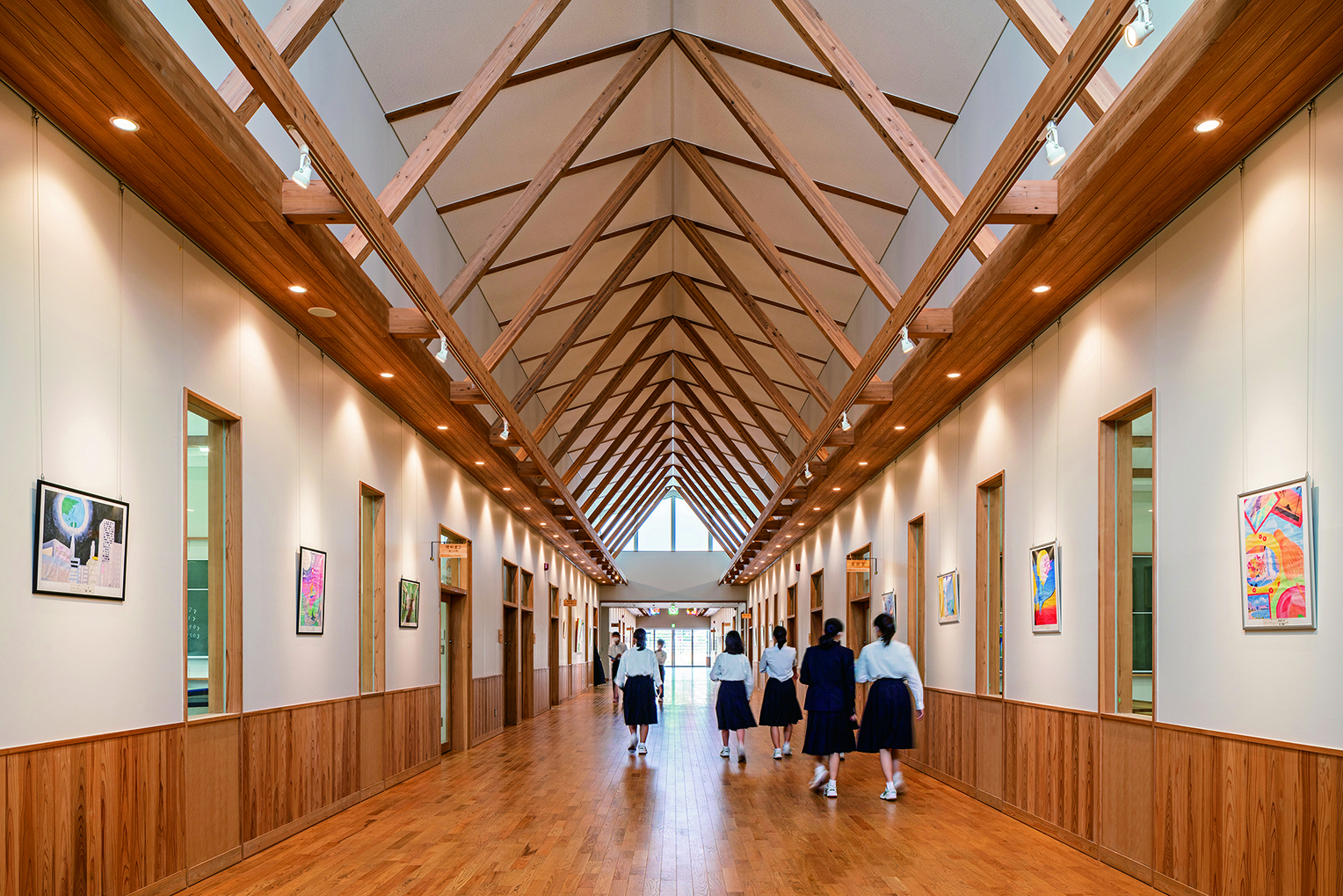 6000㎡の大規模な純木造校舎。流通製材の使用、一般的なプレカット機で行えるディテールや在来軸組み工法で使用する接続金物の採用など、特定メーカーに依存しない、汎用性の高い大規模木造を実現。教育・学校生活の場、地域住民のコミュニティの場として、未来永劫、子どもたちを優しく包み込む木の空間を提供する。