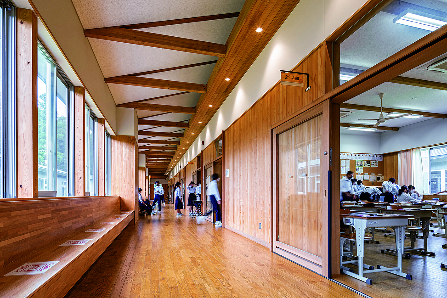1000㎡ごとにメンブレン型耐火木造棟を組み込むことで、大規模木造校舎を実現したモデルケース的事例。特殊材を使うことを前提にせず、一般流通材の活用でもこれだけの建築が可能であることを示した。手を入れ長く愛着を持って過ごす校舎として、子どもの心に残るだろう。