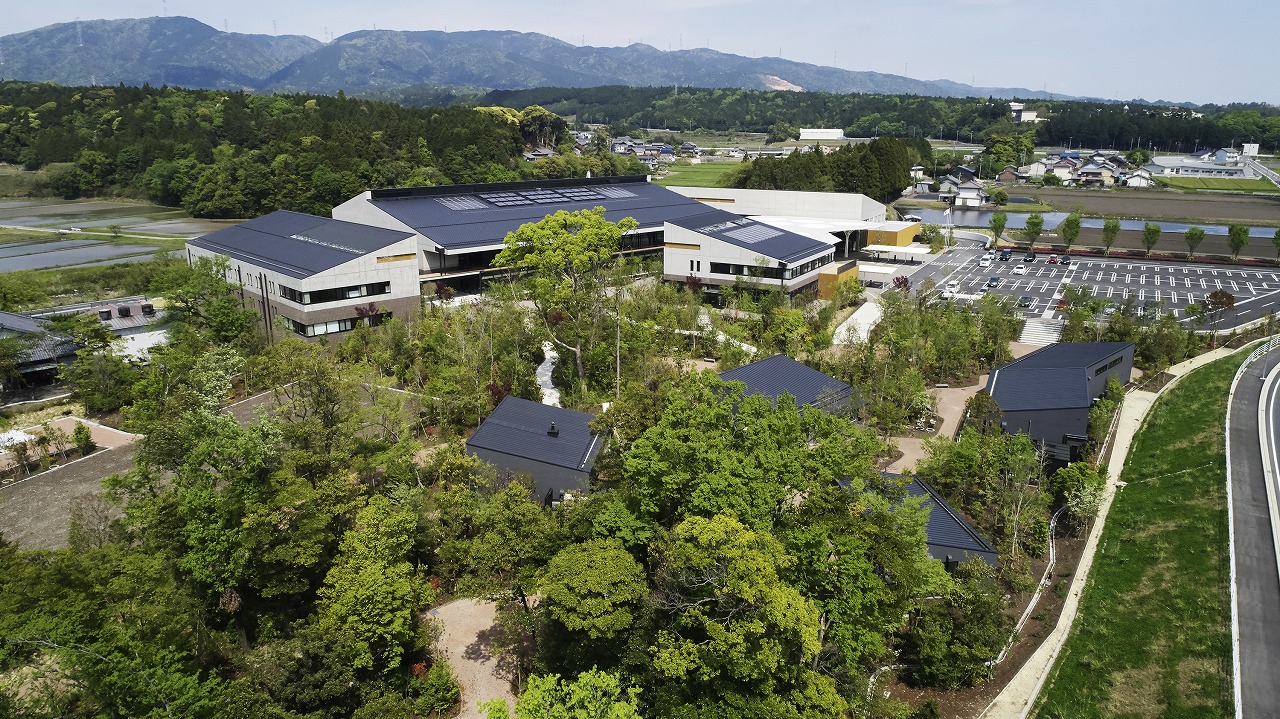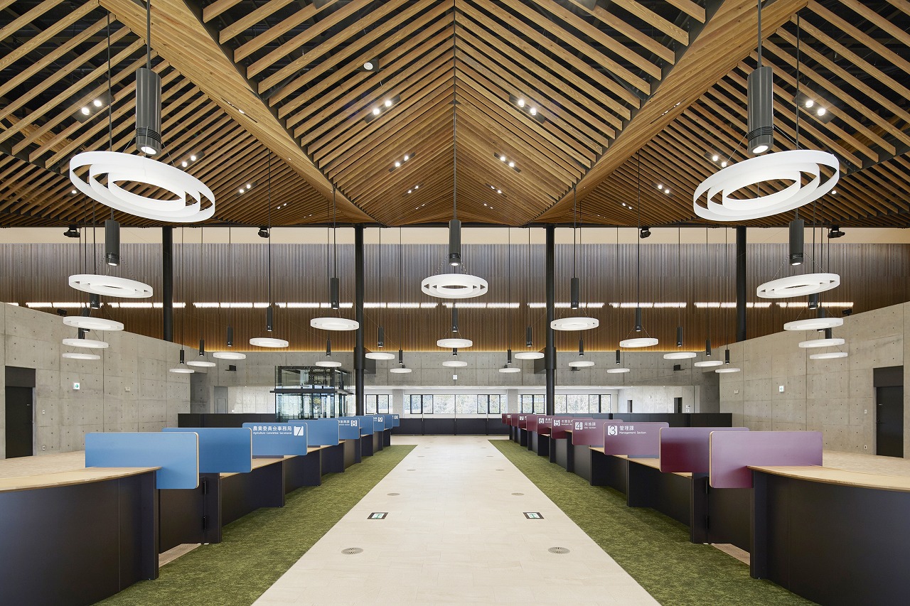 既存の樹木や地形を最大限に残すと共に低層かつ分棟の建物とすることで周辺環境に調和する「杜の庁舎」をテーマに設計。「大庇下の広場」と既存の杜を活用した商業施設群の「にぎわいの森」は人口の減少と高齢化を踏まえたまちづくりを行う拠点となり、市民が日常的に集う本来の意味での「公共建築」となることを狙った。