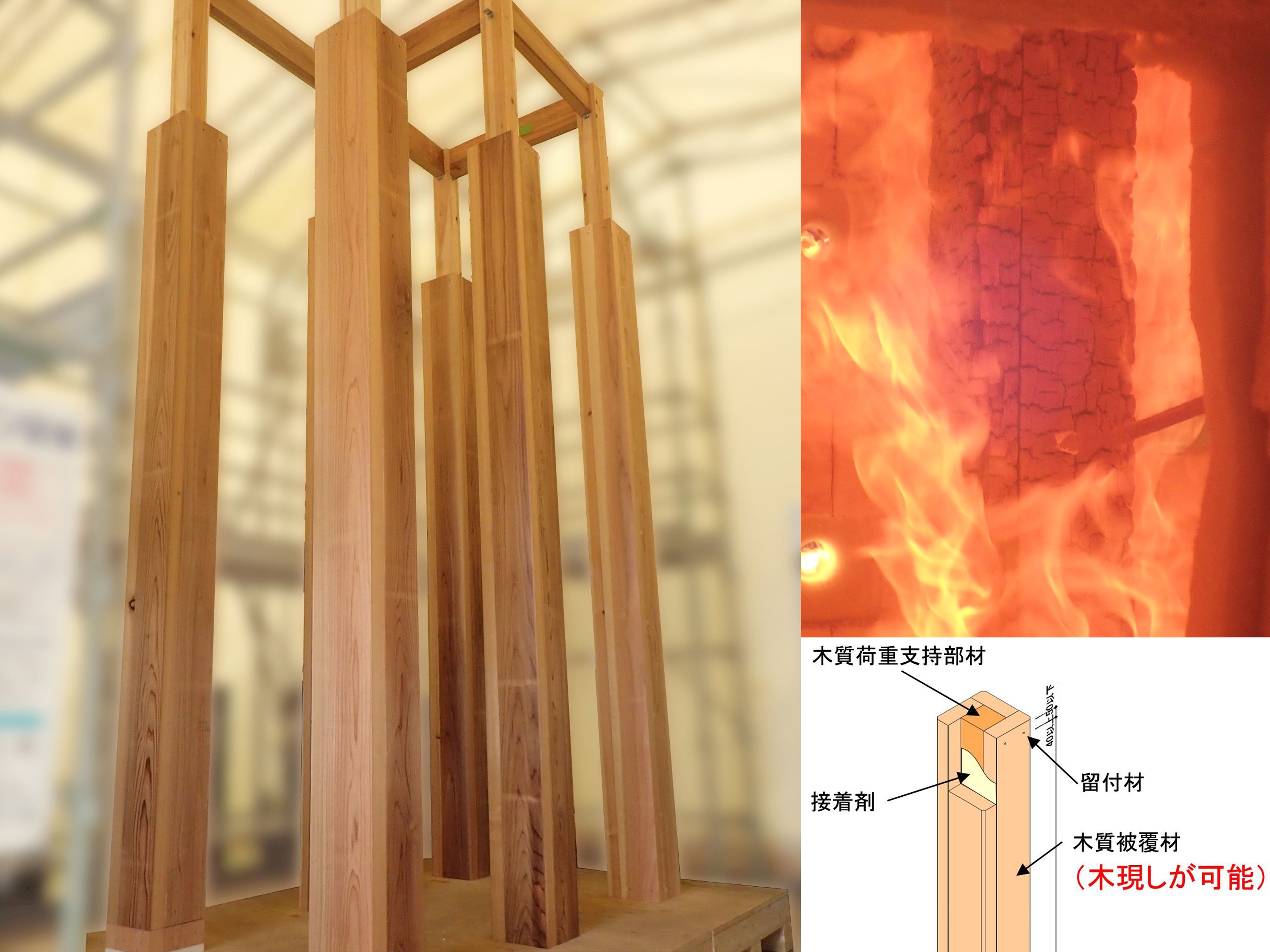 本作品は木質荷重支持部材に耐火被覆(燃えしろ)として木質被覆材(製材、集成材)を張ることで構成された木製柱。1時間準耐火構造の国土交通大臣認定を取得。樹種を問わず、国産材を用いることで木材の地産地消に対応できる。本作品により木の温かみを感じられる「木現し」の準耐火柱を提供する。