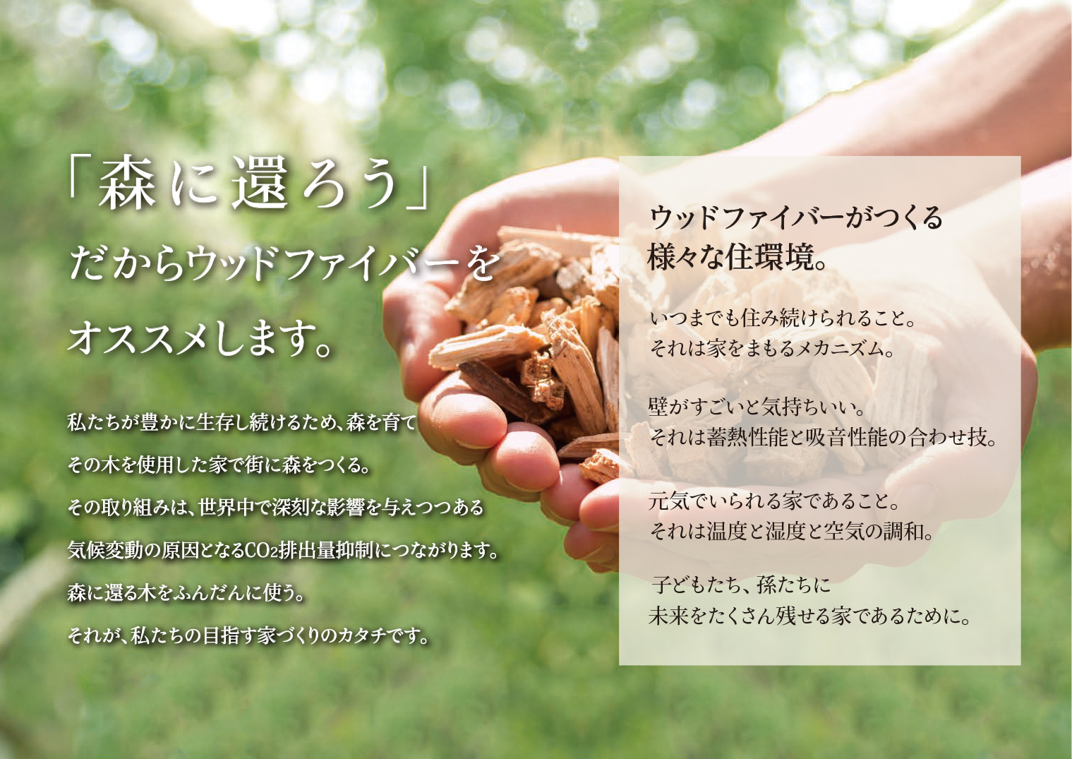 国産材でつくられる国内で唯一の木質繊維断熱材。地球環境に優しく持続可能な資源である木材を主原料としており、二酸化炭素固定に貢献する素材。木材が持つ特徴を受継ぎ、断熱性能のみならず、調湿性能や蓄熱性能に優れ、室内の温湿度変化を緩衝する機能により、快適な室内空気環境を実現できる多機能断熱材である。