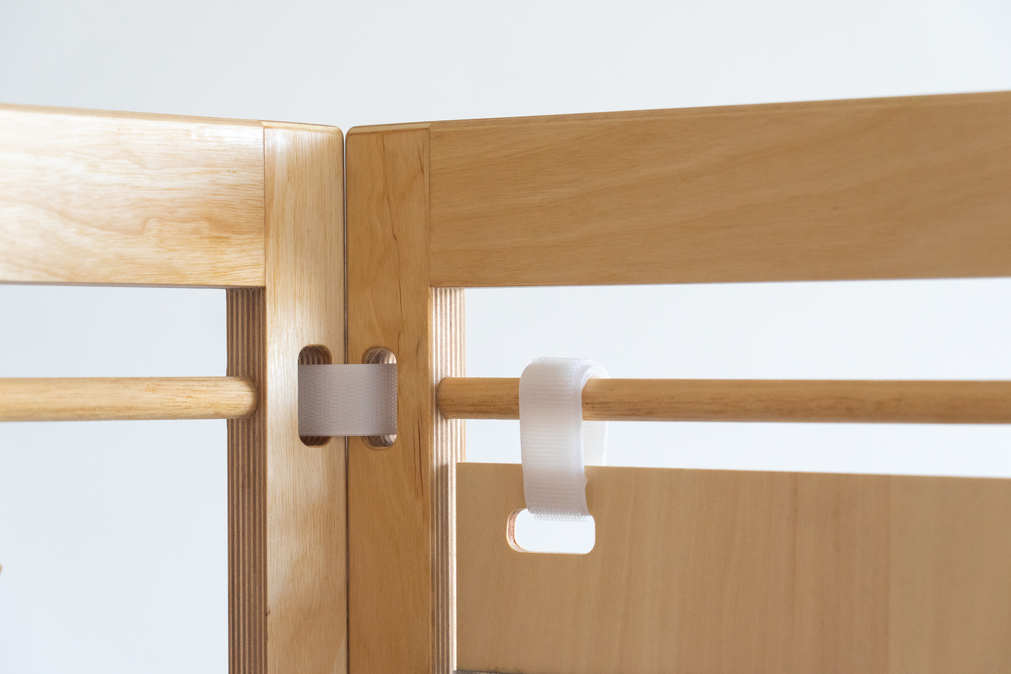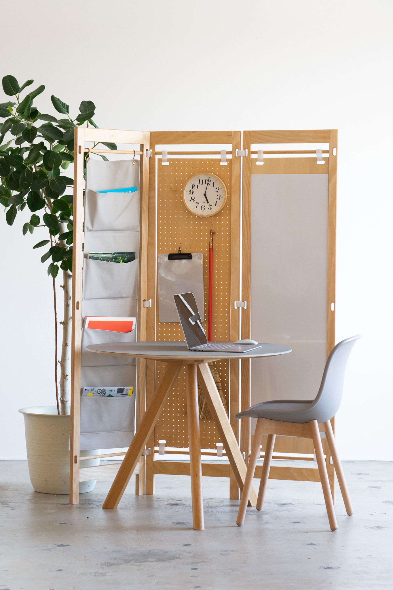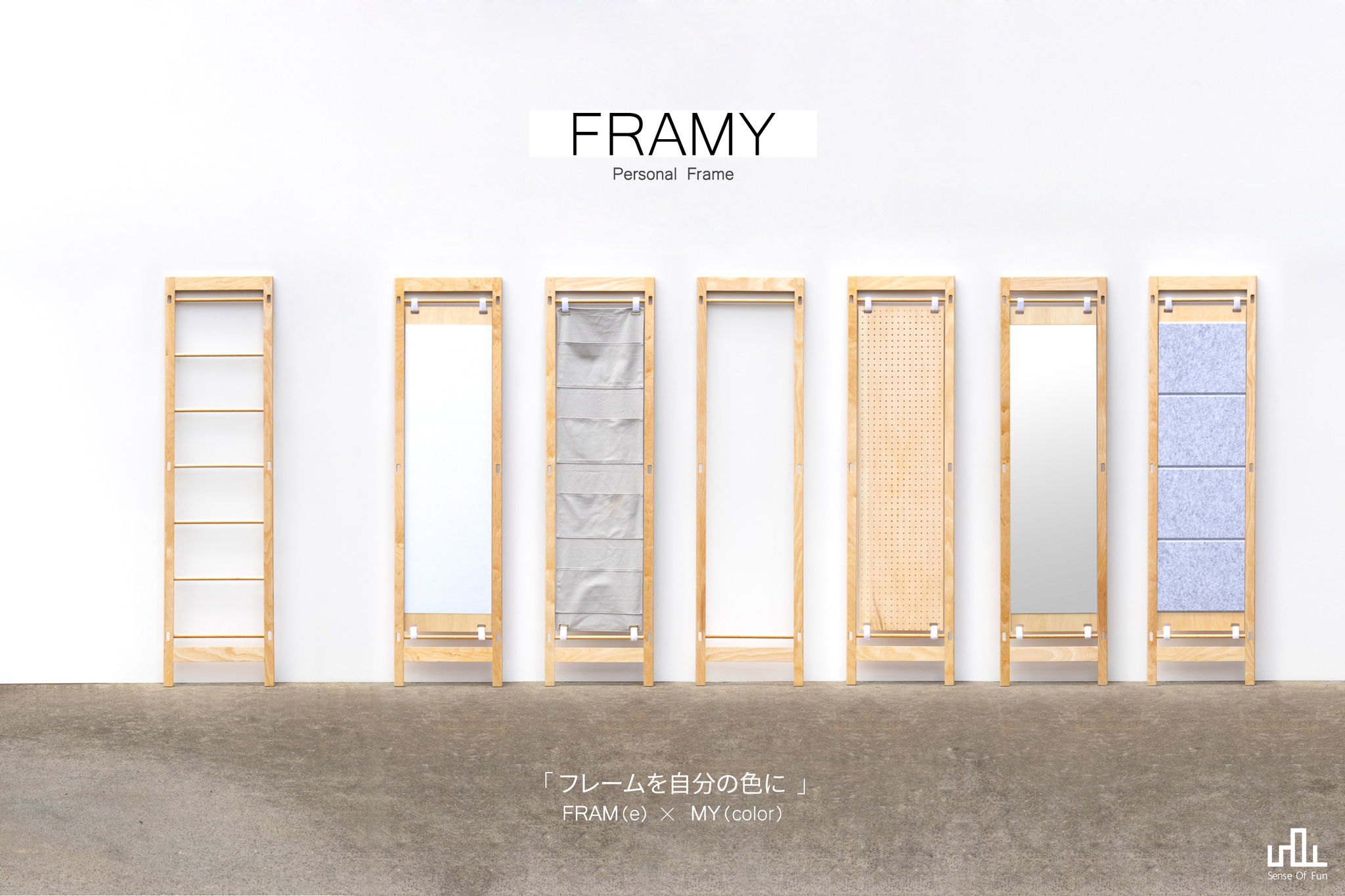 FRAMYは7種類のフレームを自由に組みかえることができ、一人暮らしの衣類掛けや収納として、共働きの作業場所や間仕切りとして、使い方や用途を限定しない新しい家具。フレーム同士の連結やフレーム内のアクセサリーは、馴染みのある面ファスナーを採用することにより、手軽な組み合わせを実現している。