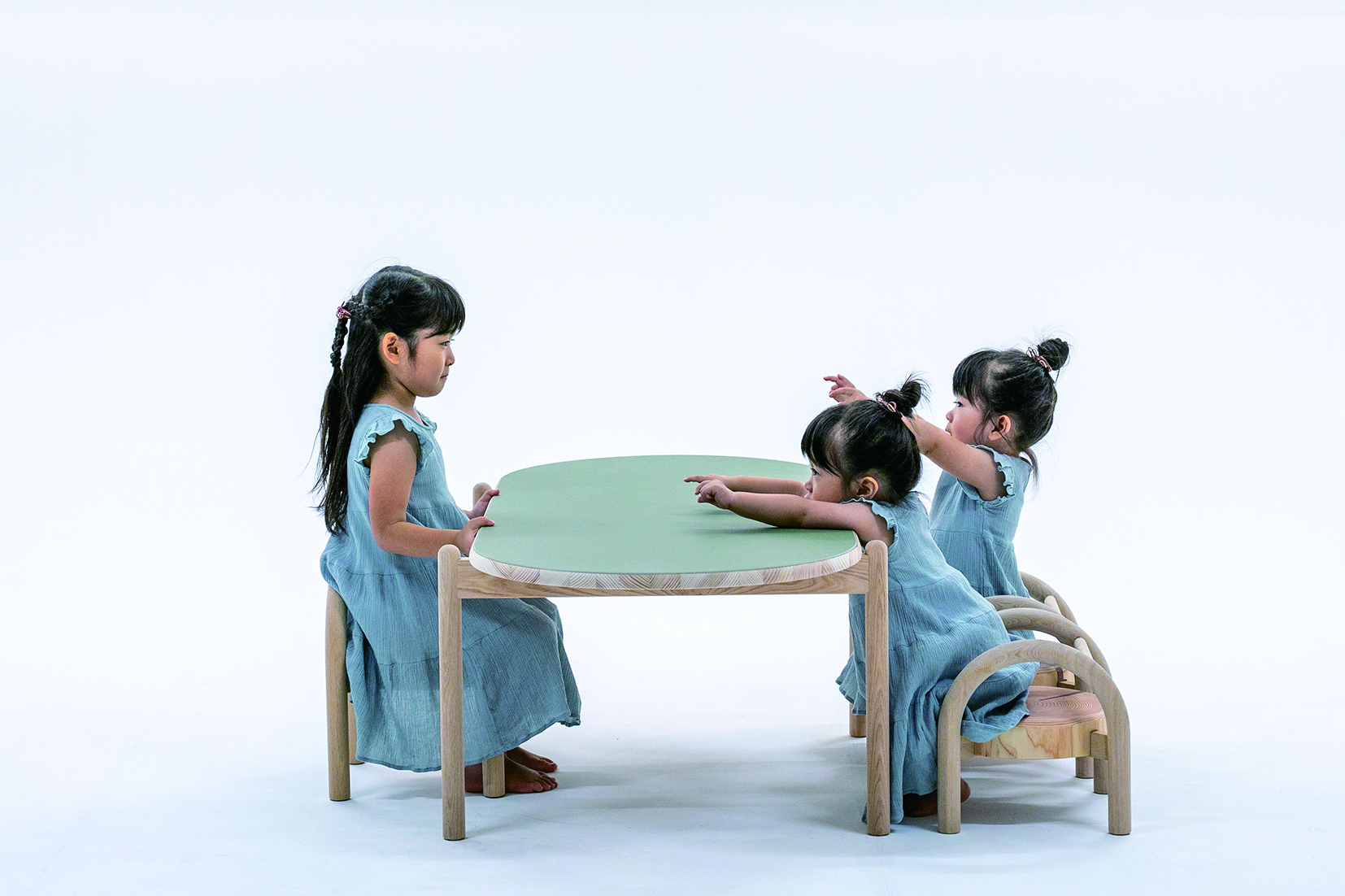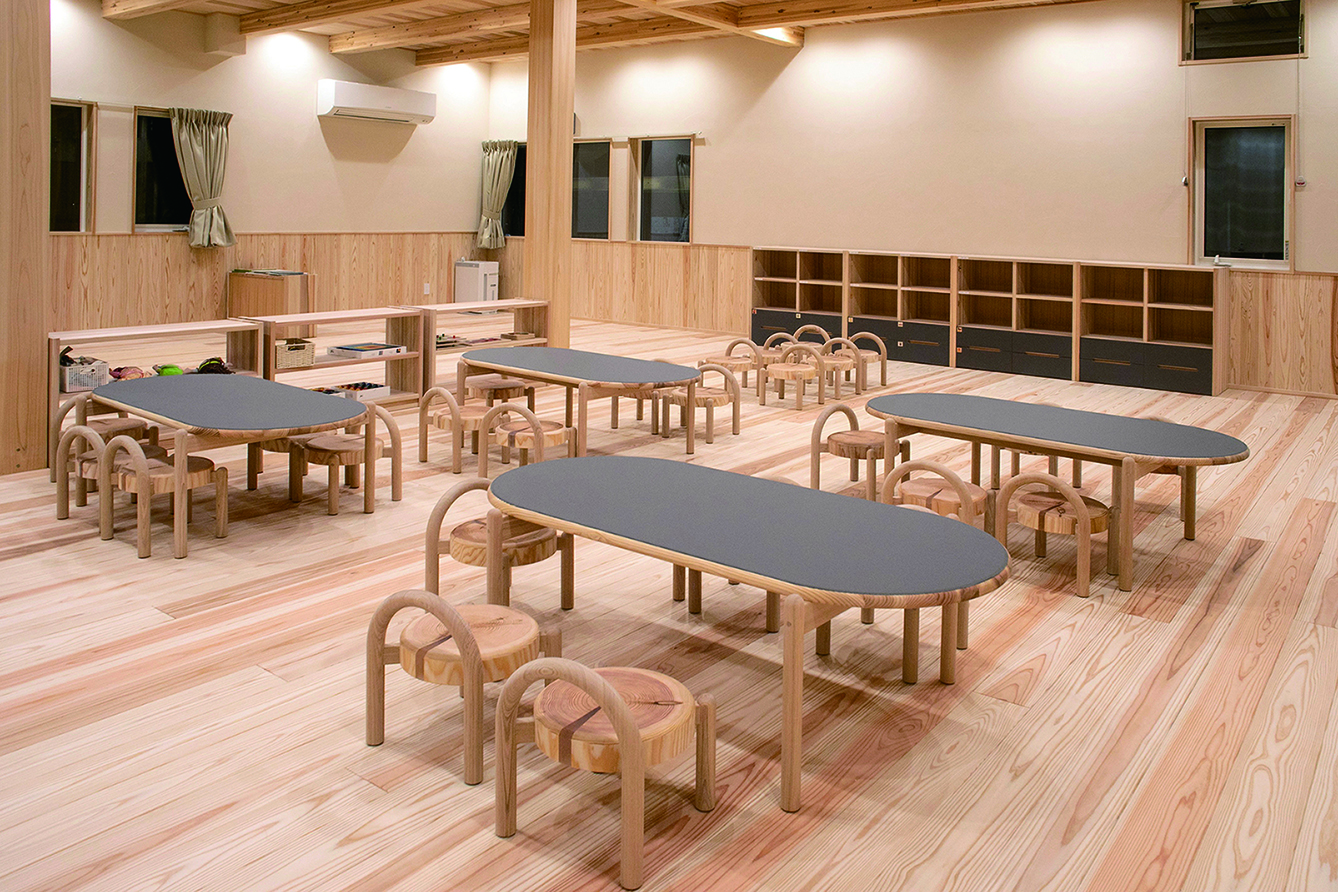 座ることの原風景を切り株を用いて再現した、子どものための椅子と椅子。子どもが手をふれ、傷をつけ、年輪を数えながら、愛着を持って使ってほしいと、杉の柔らかさを生かす切り株を座面に採用した。脚および背もたれにはタモ材とし、針葉樹と広葉樹を適材適所に使用している。