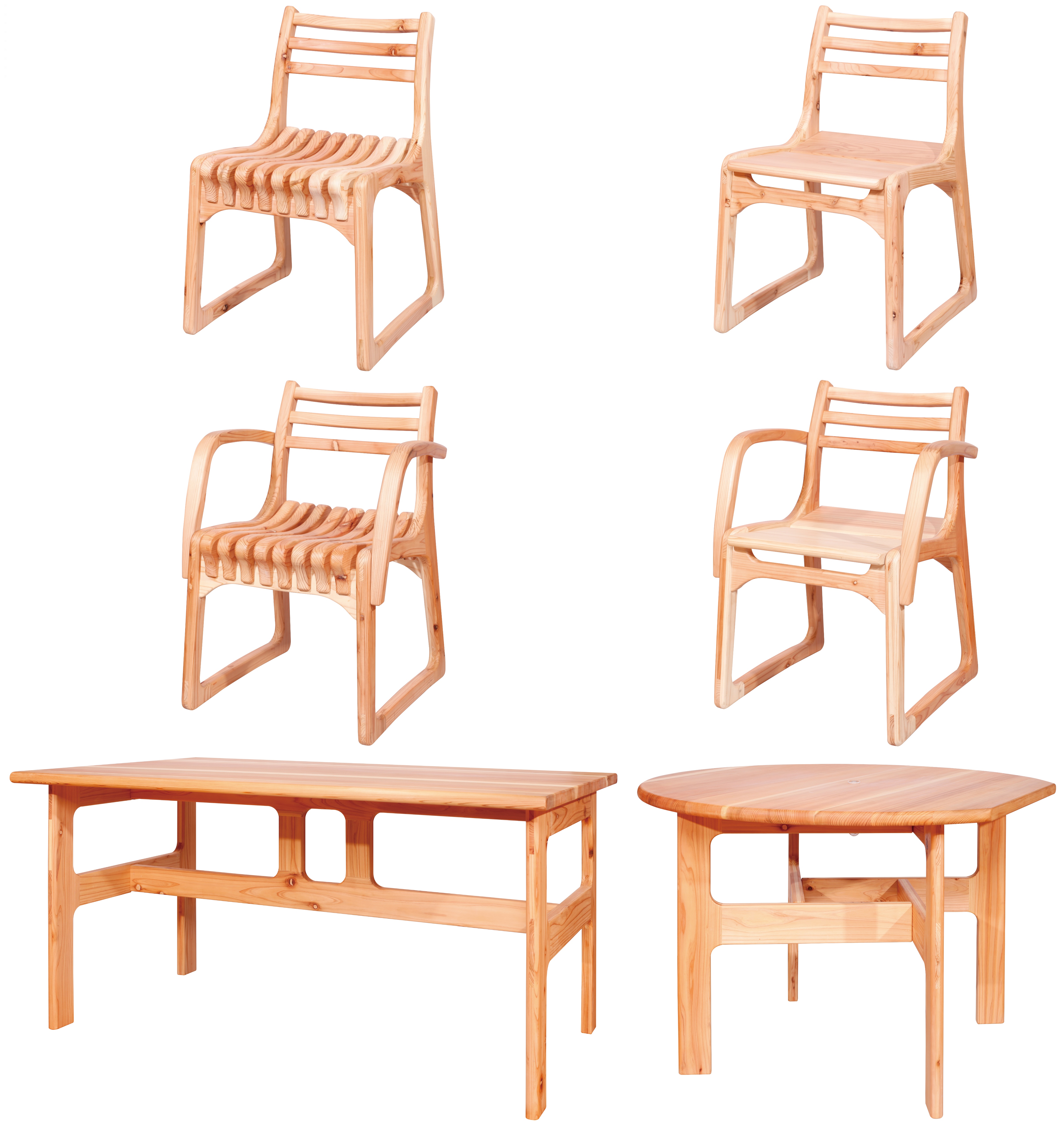 イスの脚は、床が杉材や畳などの柔らかい素材でも傷をつけにくいデザインのため、一般的な住居はもとより和室などでも使用することができる。テーブルはシーンに合わせて形を選ぶことができ、仕上げには舐めても害のないオイルを使用しているため、小さい子どもがいる家庭でも安心して使用できる。