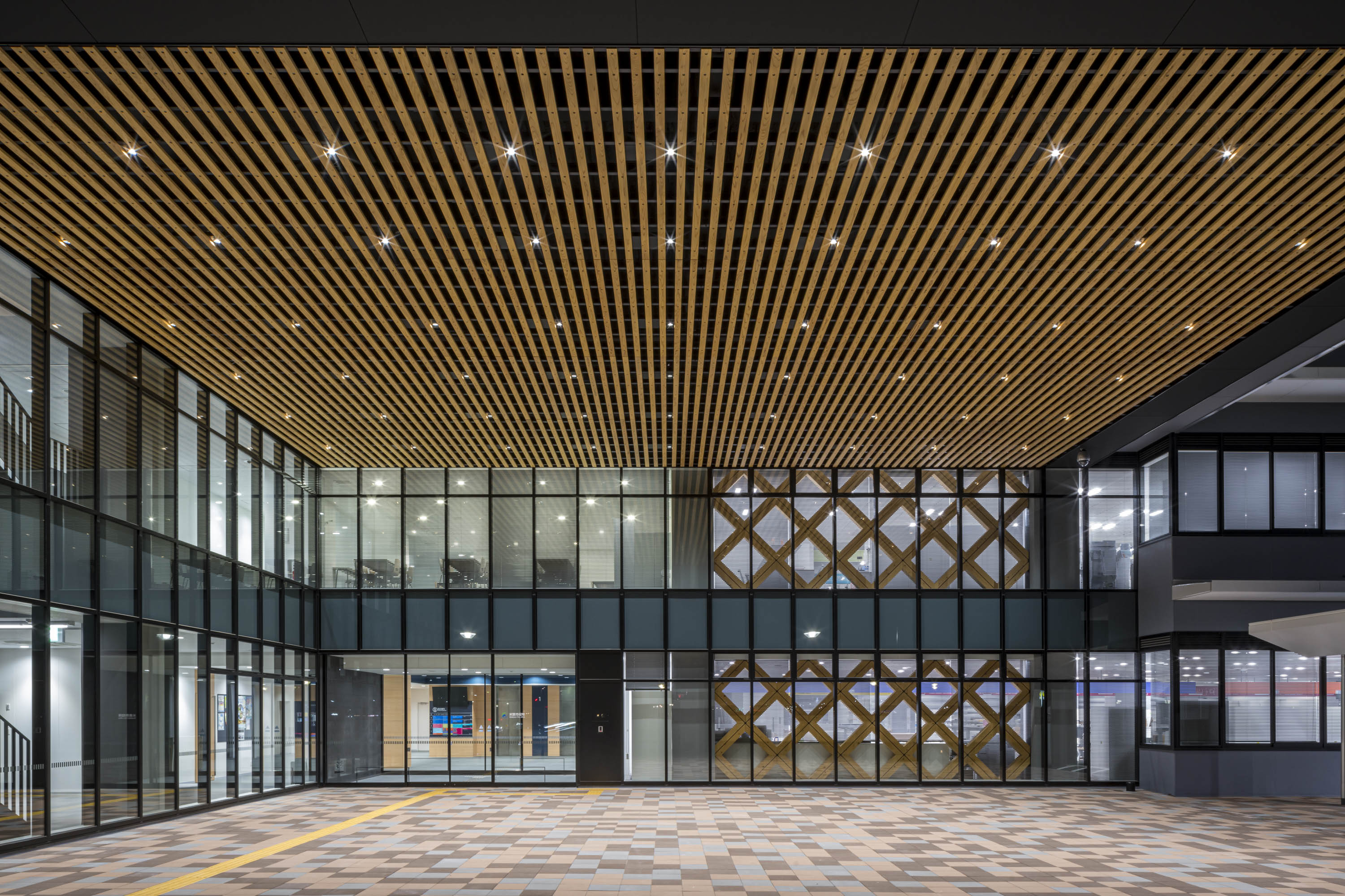 T-WOOD BRACEは、鋼板による斜め格子に集成材やCLTといった木材を組み合わせた耐震構法で、ブレースの角度や木材の形状・配置を組み合わせることにより、様々なデザインが可能。木材は意匠上の重要な要素となるほか、ブレースの補剛材として機能することで、構面全体の耐力向上に寄与する。