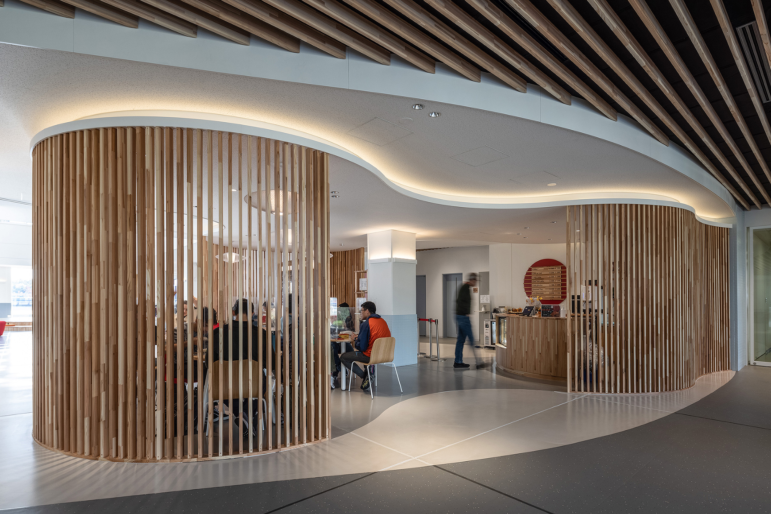 アトリウムを象徴する木格子パネルはカフェラウンジやステージを明るく快適にし、交流や活動を促す場づくりにつなげた。意匠性を重視した木の使い方はインターナショナルスク―ルに日本らしさを表現することに成功している。