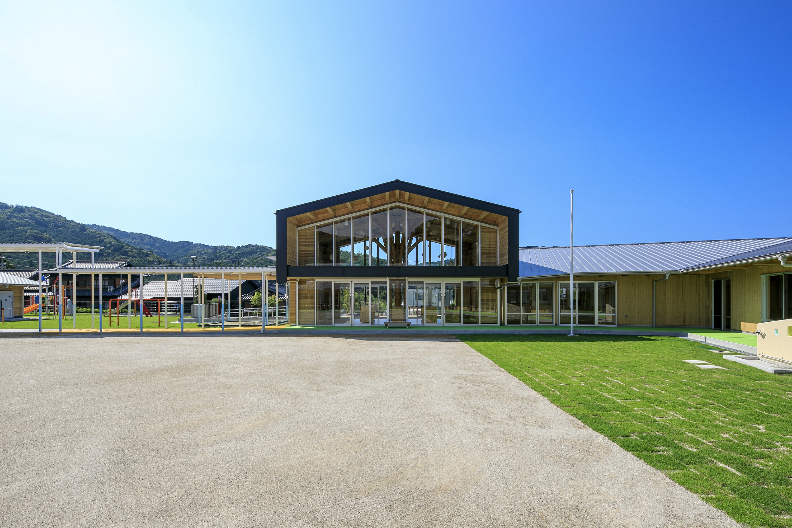 愛知県岡崎市の額田地区にある、地区子育て支援センターや一時保育スペースを併せ持つ、同市初の全てを木造でつくった保育園の園舎である。敷地の周囲を山々に囲まれ、豊かな自然の残る地域で、こどもの心の豊かさを育むため、見て、触れて、感じられる、木の良さを活かした木造園舎を地域産材でつくった。