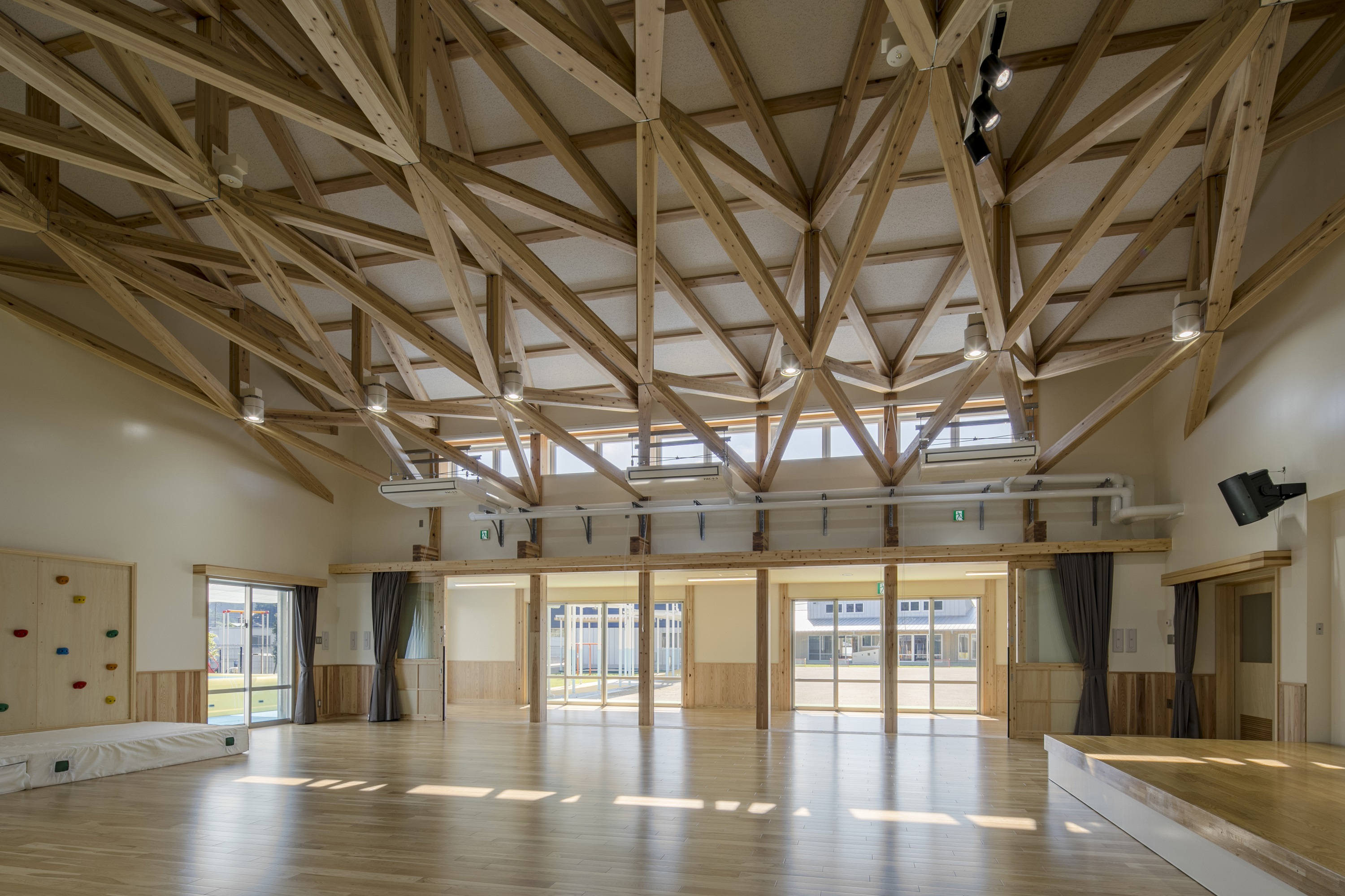 エントランスにあるシンボルツリーが正面から見える外観は、ここが木造園舎であることを強く主張している。異なるトラスを採用した各室や多様な木のデザインの空間が、優しく子どもをいざなう。