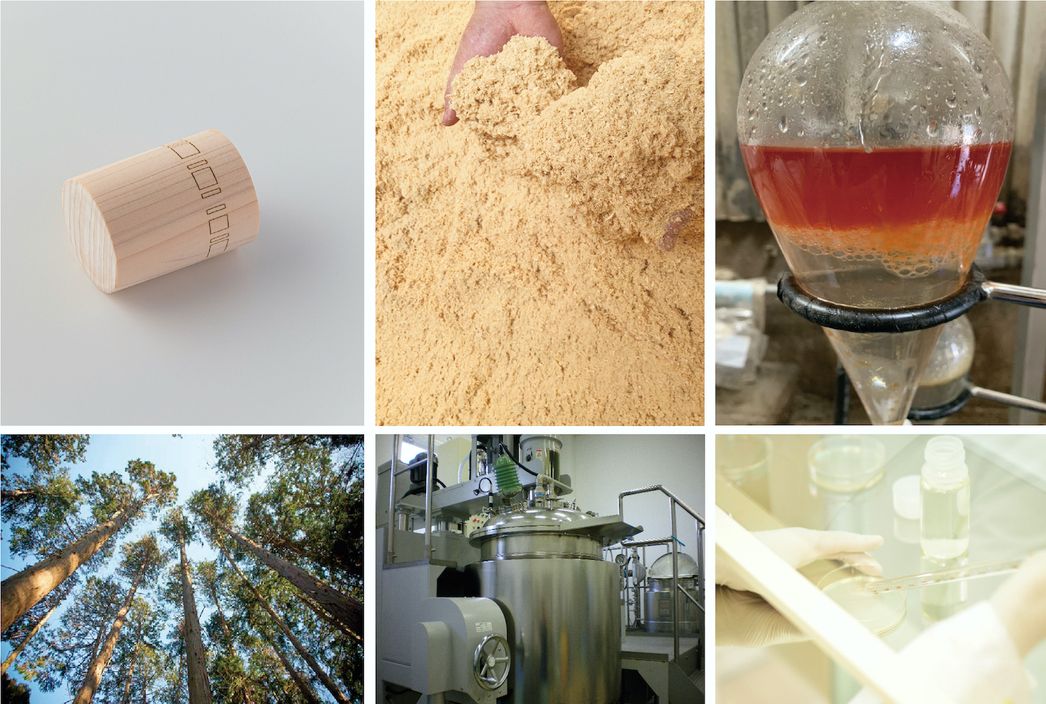ヒノキ成分を活用した、スキンケア製品で多様な効果をもたらす木の油分を日常の健康や美容に活かす提案。木の活用の幅が広がっていることを伝える、洗練された作品である。