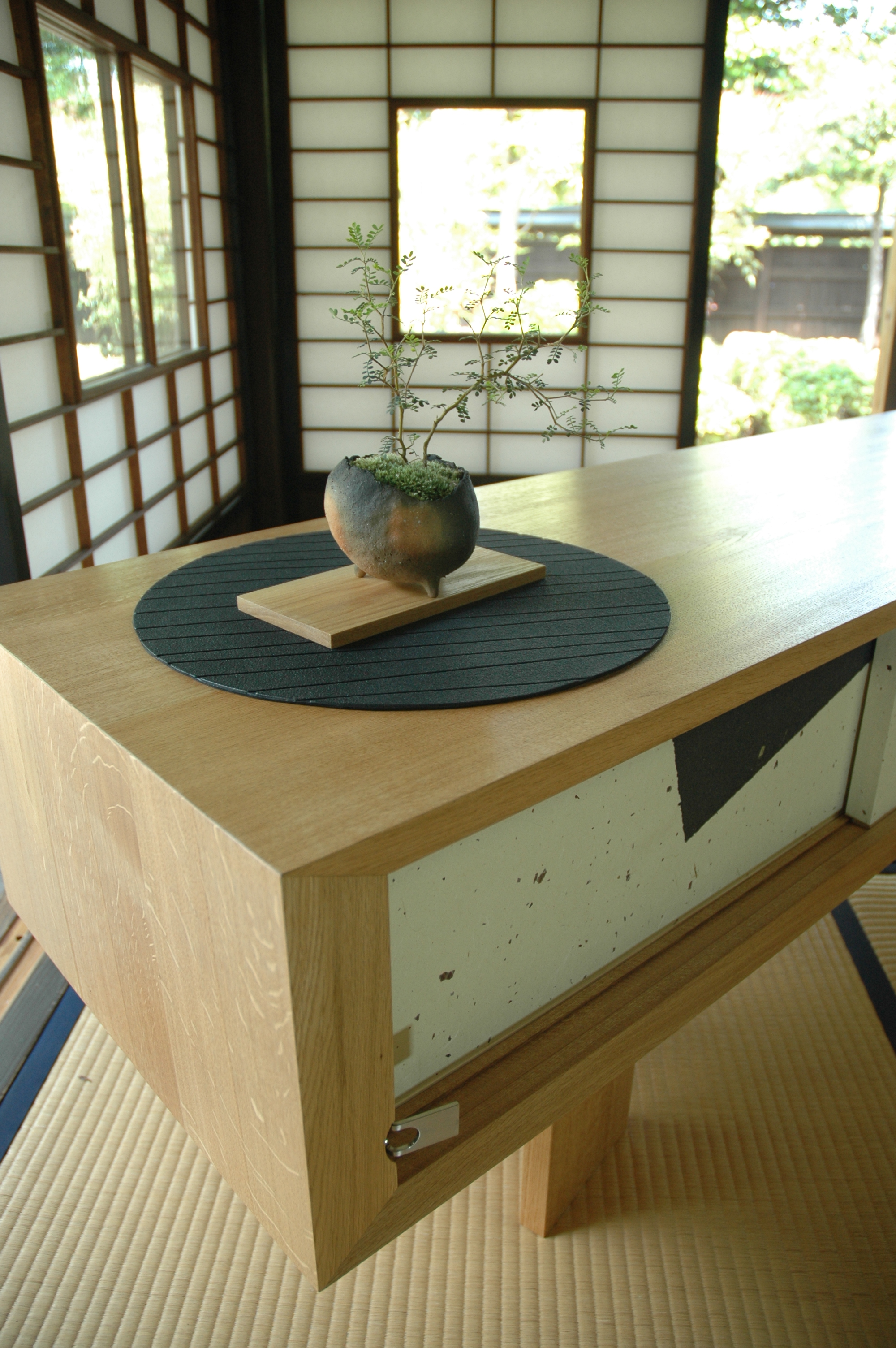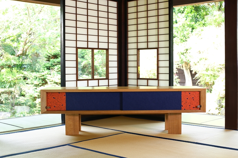 高さの異なる二つのタイプで構成されたfuscoma.杜。巾1800は、日本建築の6尺であり、4寸柱の半割のサイズの側板に挟まれた開閉部のサイズは、まさに和室のそれである。躯体見付面に勾配を持たせ、通常では木目から判断する留納まりを立体的に際立たせている。張り分けによる多様なデザイン性はこのモデルの最大の特徴。襖の採用によって、張替えが可能となり、破損・汚損からの復旧、季節による空間装飾にも対応する。