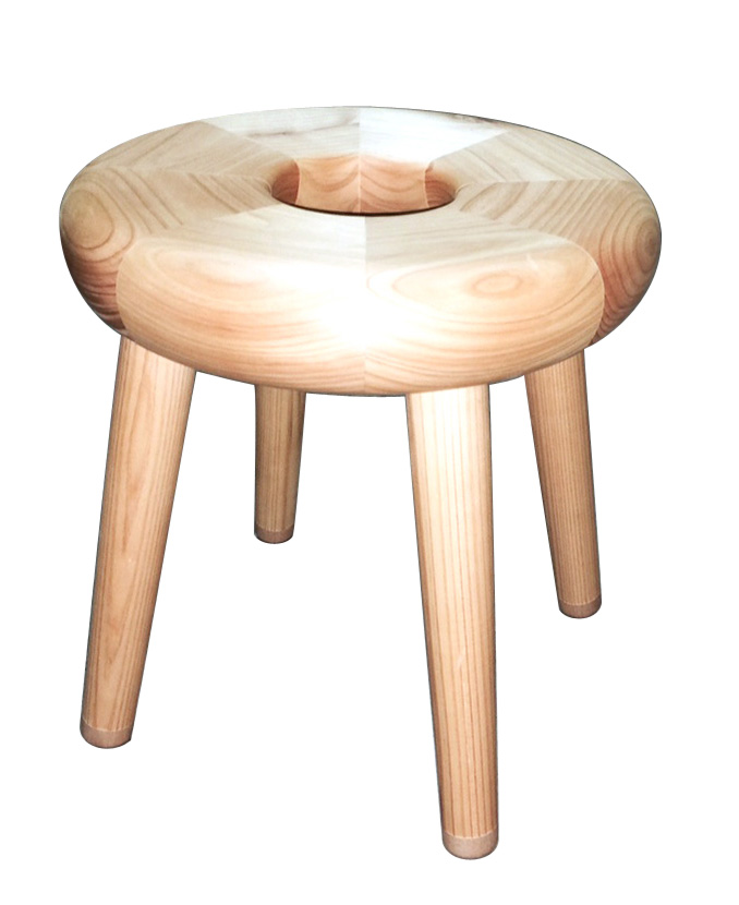 ドーナツのような外観と木素材の質感から、子どもが自然と座りたがるようなインパクトある椅子である。