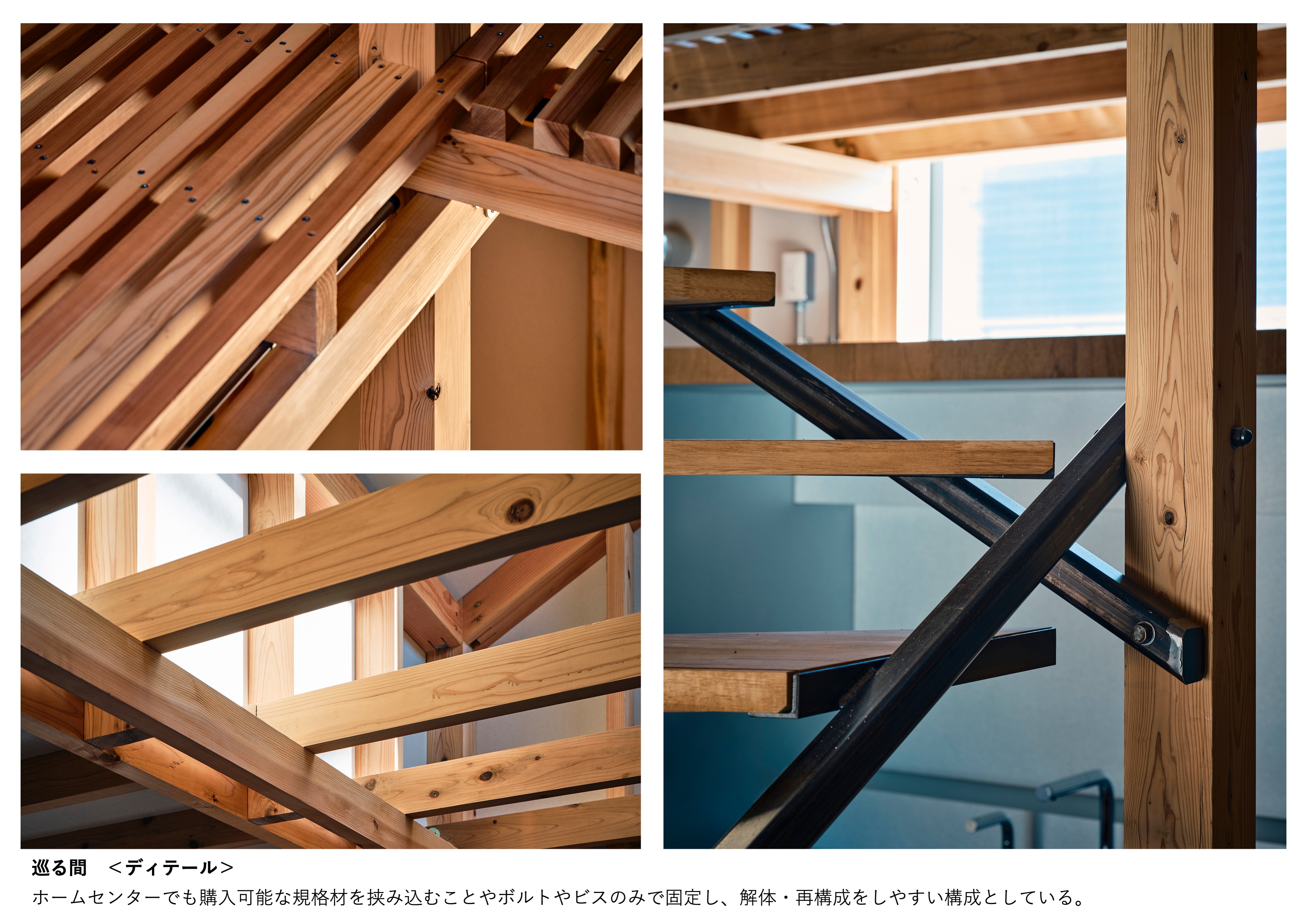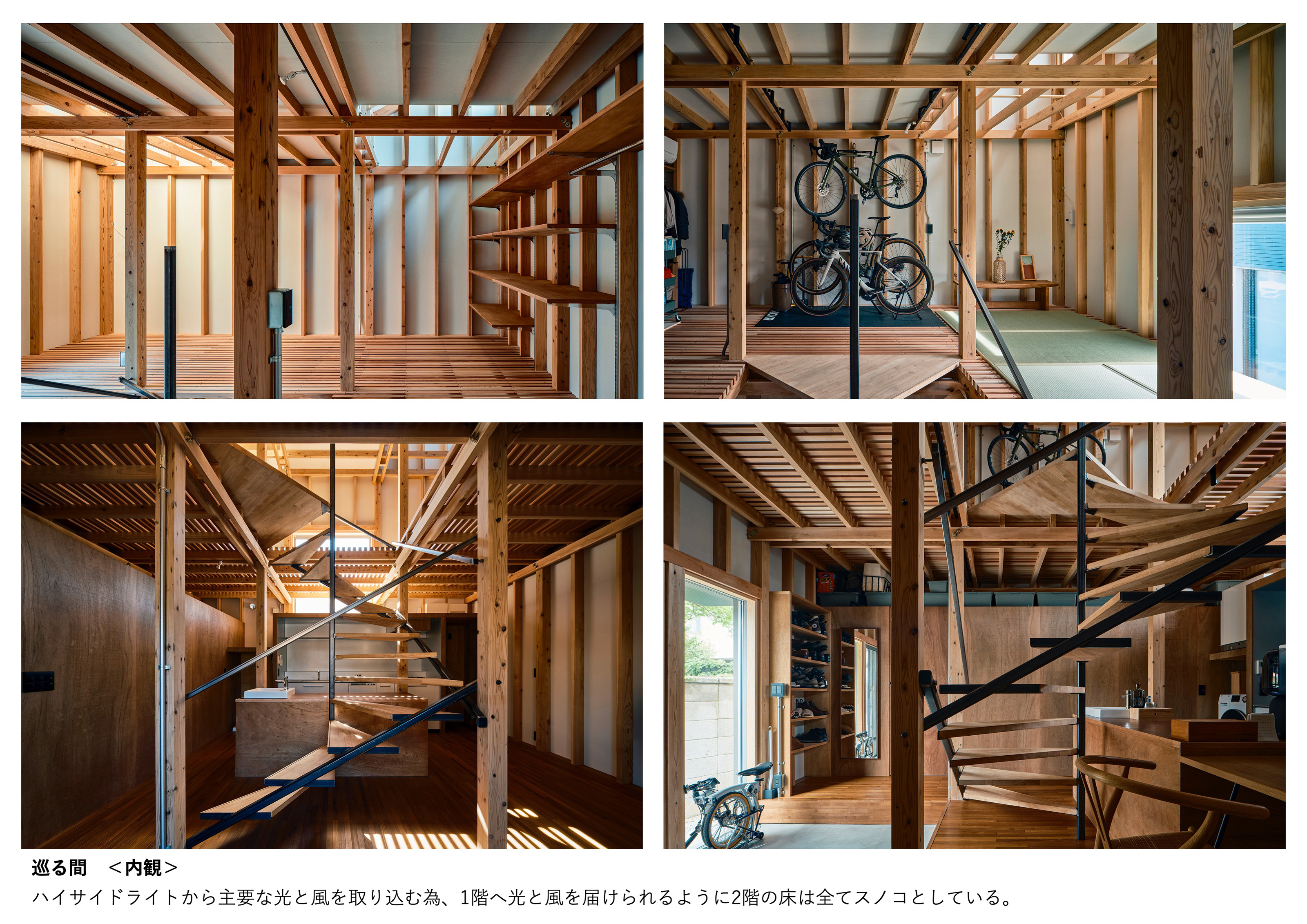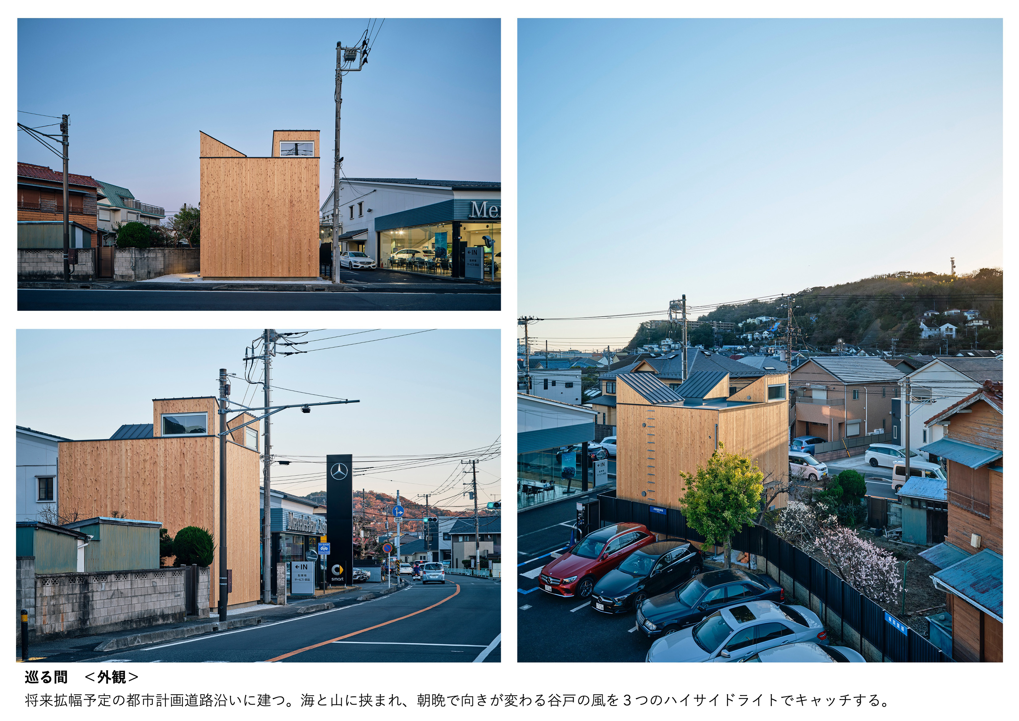 将来拡幅予定の計画道路の与件を紐解き、解体・再構成が容易で、普遍性と固有性を併せ持つプロトタイプを考えた。主架構はプレカットせず、ホームセンターで購入可能な規格木材をボルトで留めるのみで構成している。ハイサイドライトを朝晩で風向が変わる谷戸の風に最適化、2階を全面スノコ床として下階に光と風を届ける。