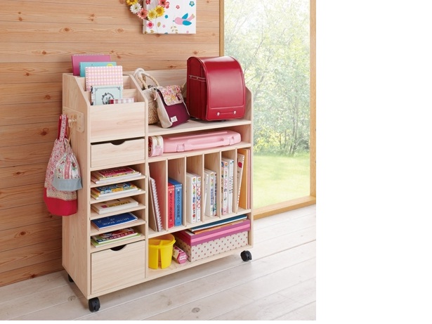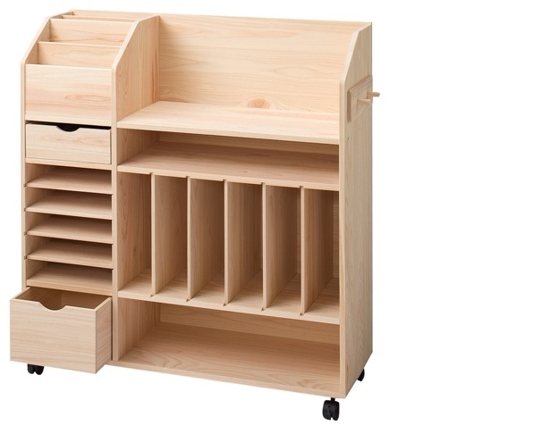 ダイニングやリビングで勉強や宿題をするご家庭向け整理収納ラック。お子様のランドセルや教科書を収納でき、学校へ行く準備をこれ1台にまとめることができます。キャスターを除くすべてに岐阜県東濃地区の檜天然木を使用。成長に合わせて少しずつ木の風合いやキズが増していき、整理整頓の習慣や自立心を育むだけでなく、物を大切に使う心も育んで欲しいと願った作品です。